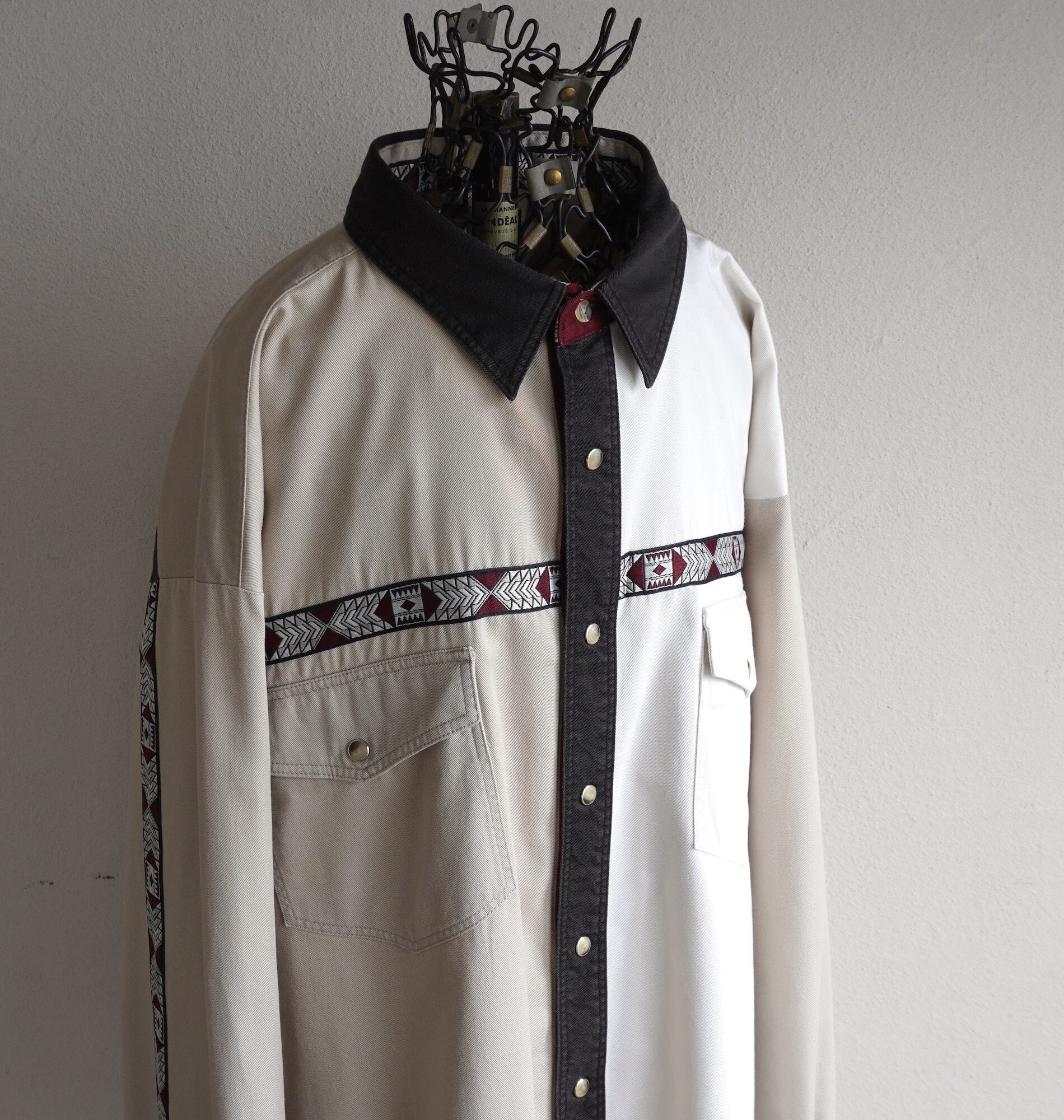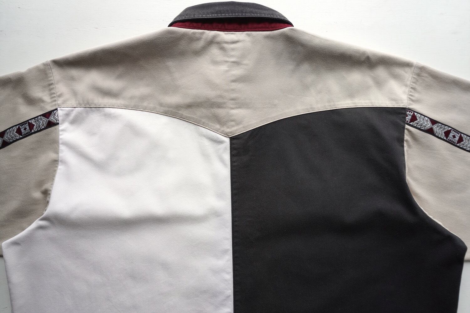マルチカラー切り替え×ネイティブ調織りトリムデザインが個性的な、L/Sコットンツイルウエスタンシャツ。
