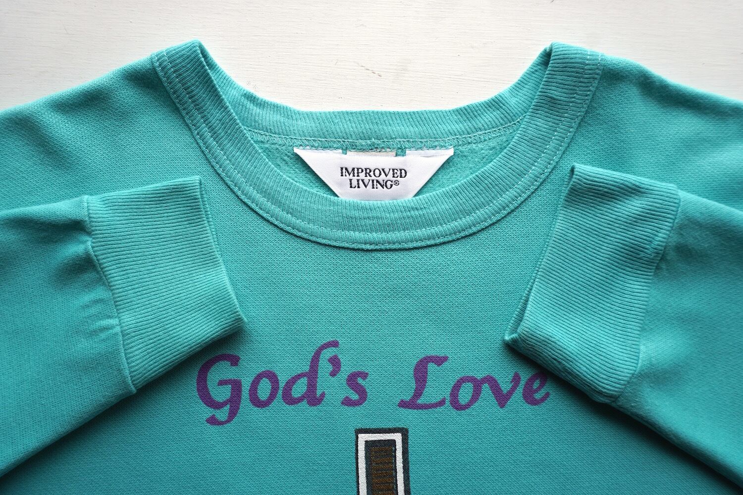 色味の良いシーグリーンに"God's Love holds a Lifetime Guarantee"(神の愛は生涯保証だ)のプリントがcoolな、スウェットカットソー。
