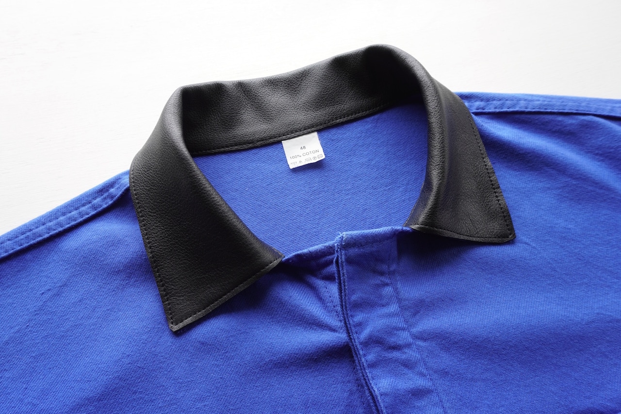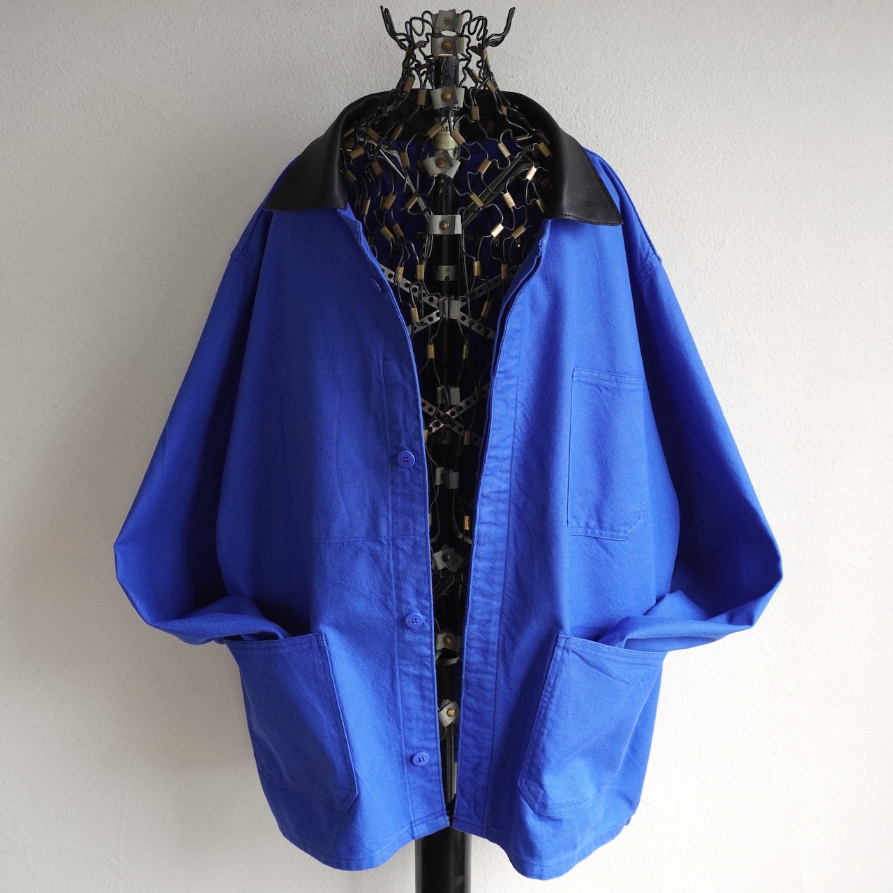 襟をブラックのレザーでカスタムした、鮮やかなブルーのフレンチワークカバーオール。