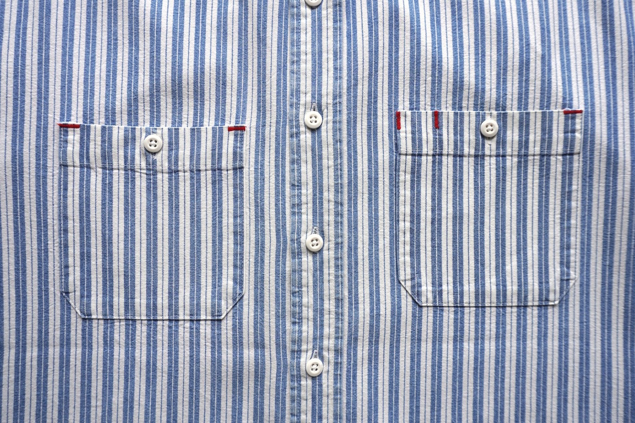 胸ポケットのレッドのバータックがワークな雰囲気のディテール。