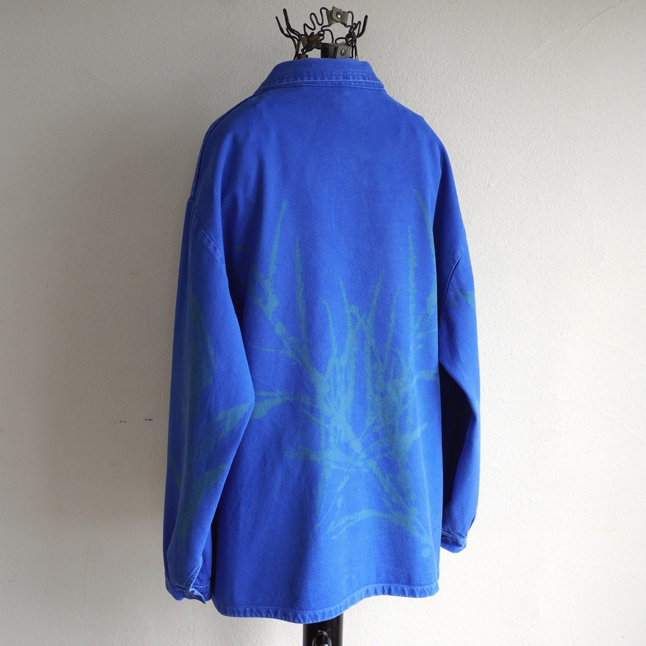 1990's [ERGOS] ボタニカルシャドーブリーチ フレンチワークカバーオール 100%コットン ブルー 実寸(men's L程度) グレビレア ユーカリ ユーロワーク フランス ヨーロッパ ヴィンテージ