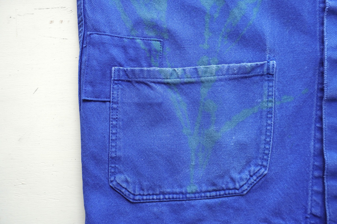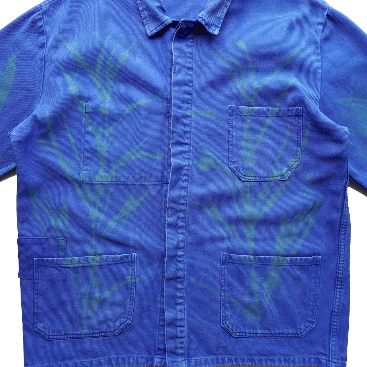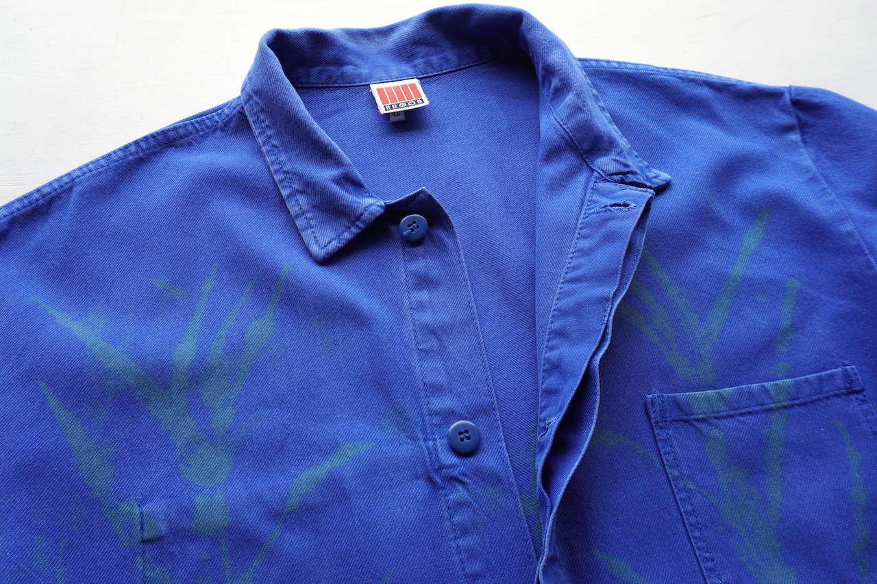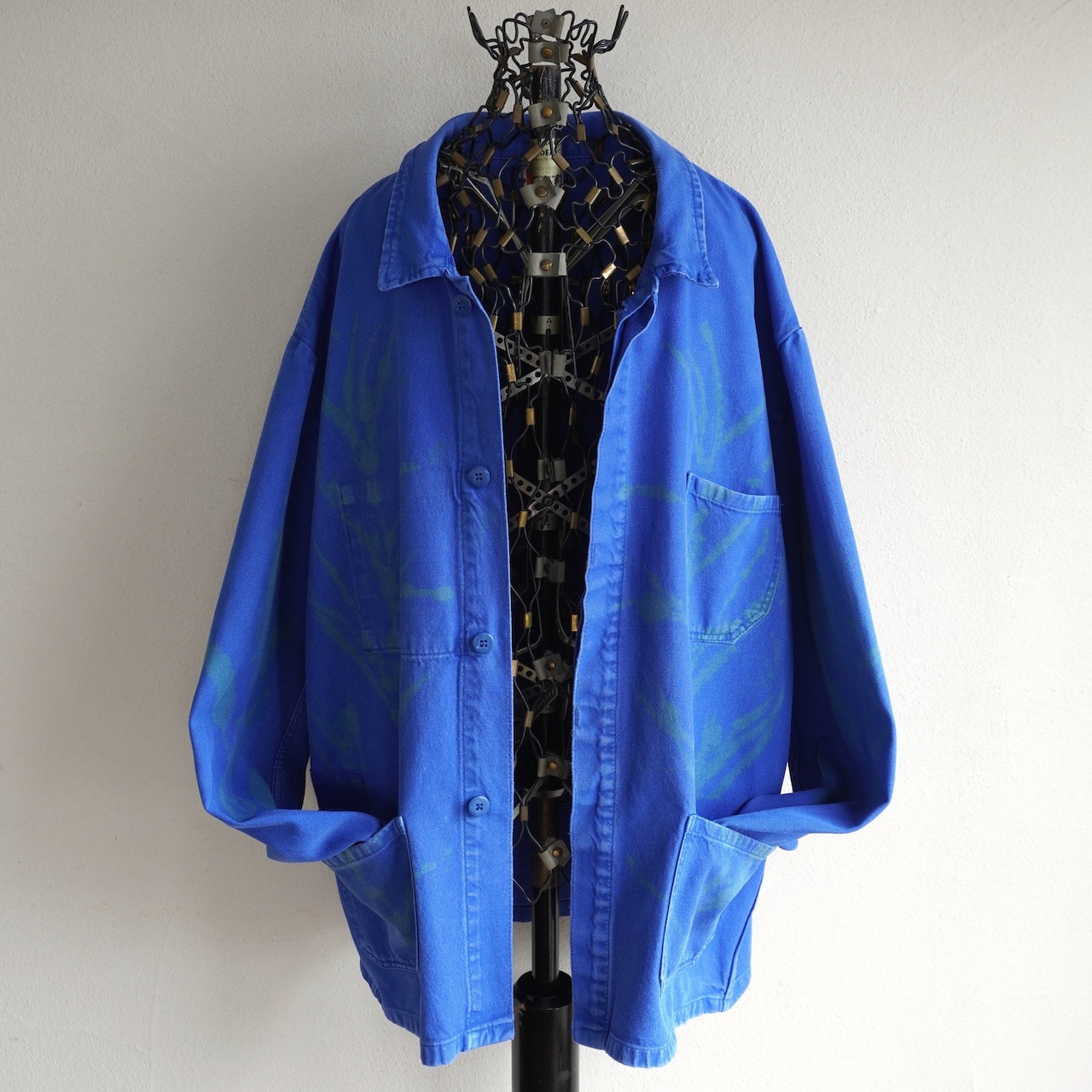 グレビレアやユーカリの葉を使ってボタニカルシャドーブリーチを施した、フレンチワークカバーオール。