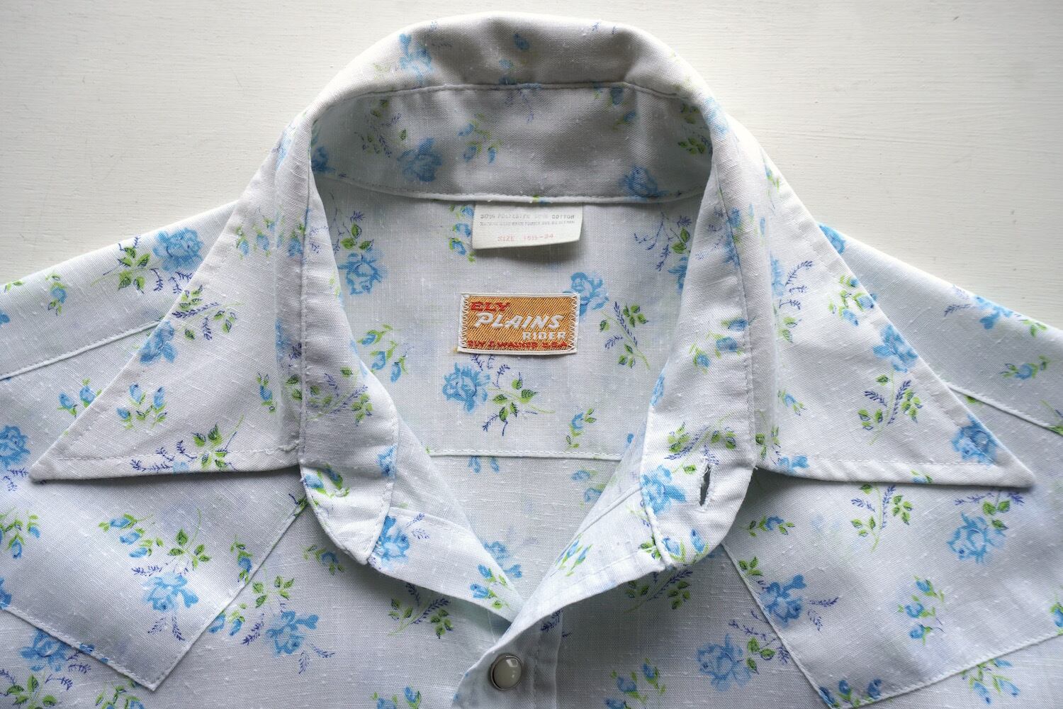 白地にブルーの小花柄が綺麗な、L/Sウエスタンシャツ。