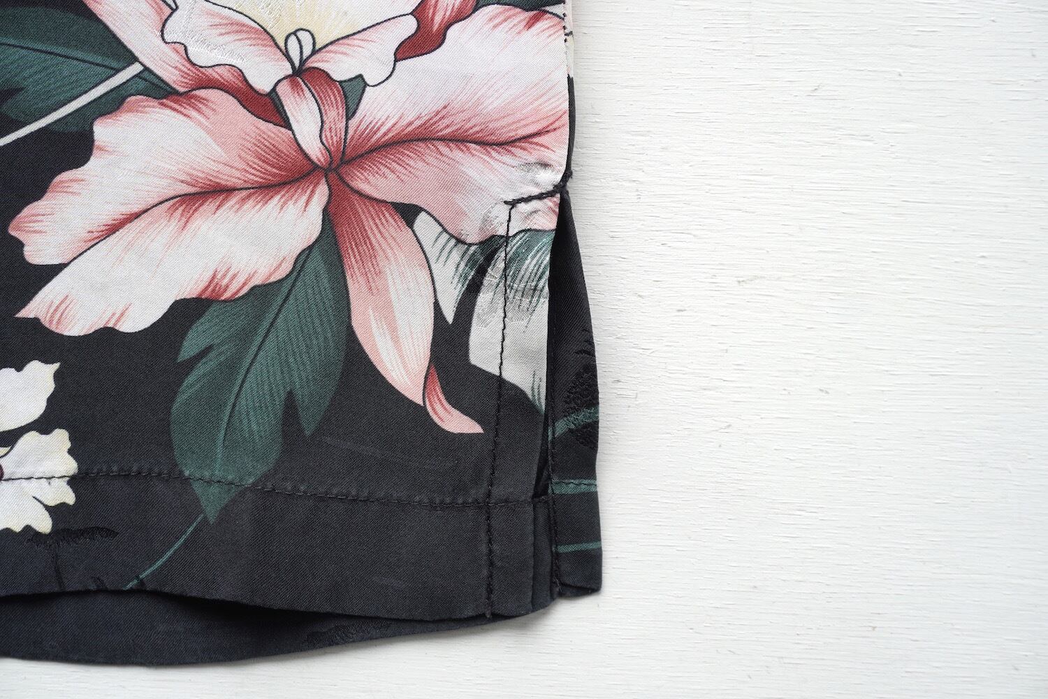 落ち着いたブラックのフローラル/ボタニカル柄に、光沢感の綺麗な天然シェル(貝殻)ボタンが好アクセント。