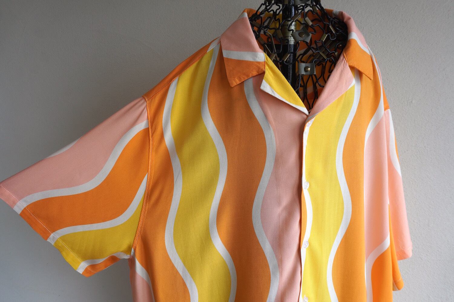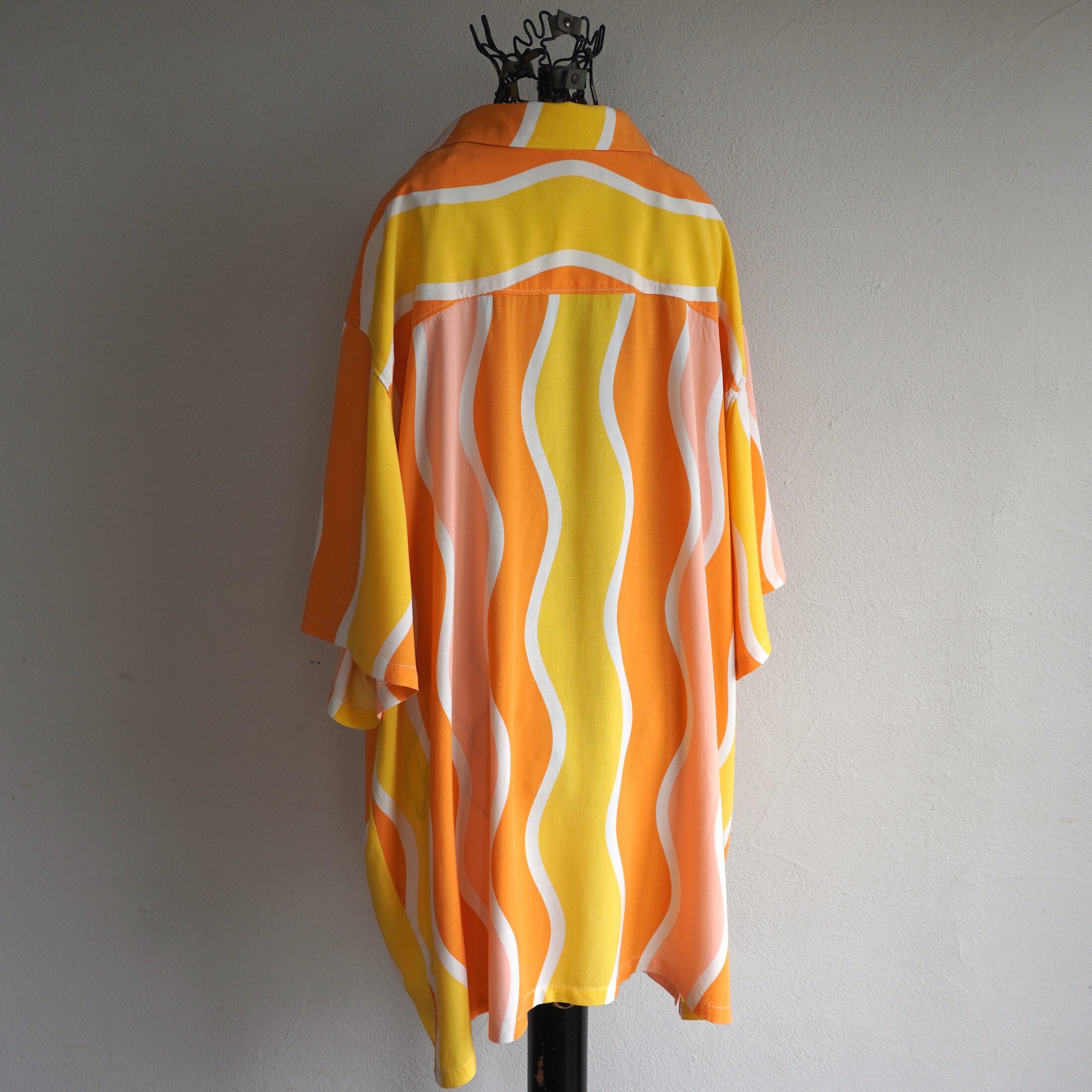 2000's〜 [NO BOUNDARIES] ウェーブストライプ柄 S/S レーヨンシャツ イエロー×オレンジ×アプリコット系 表記(men's 2XL) オープンカラー ボックスシルエット ヴィンテージ