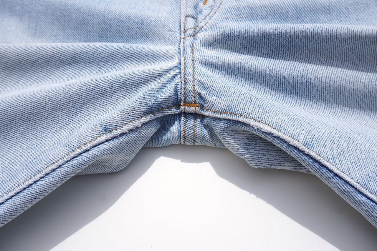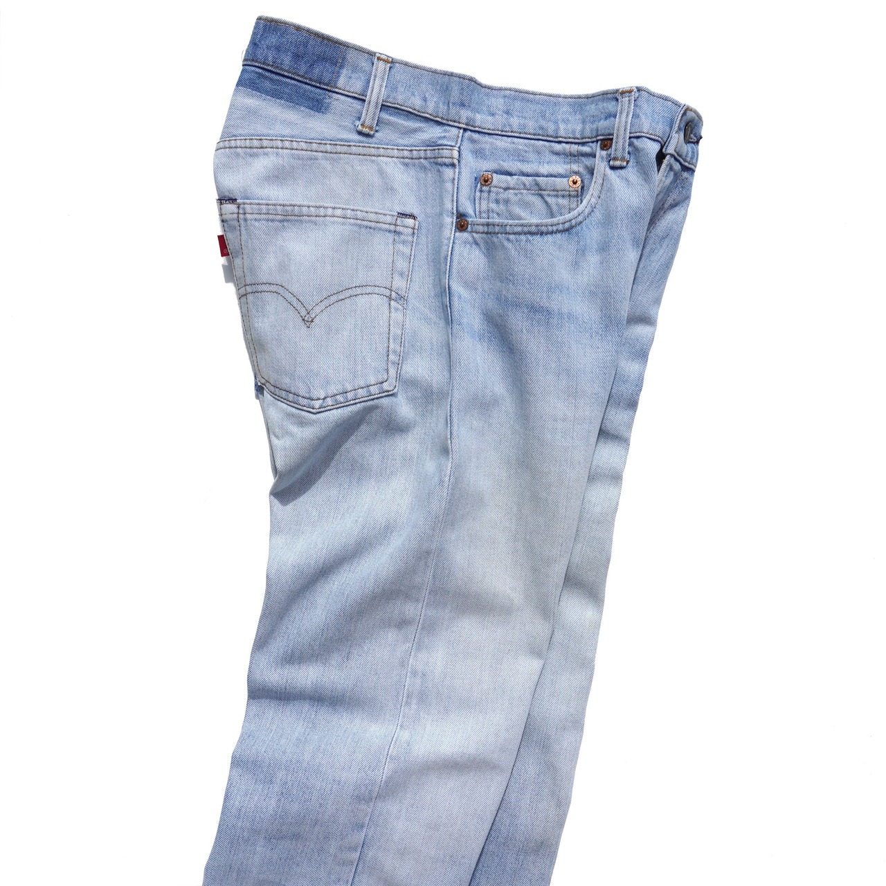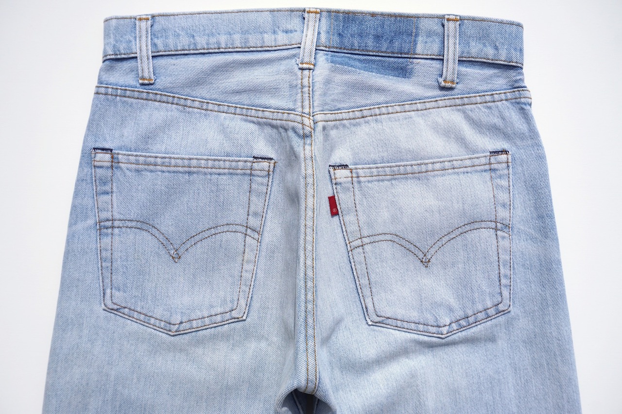 アイスウォッシュブルーにフェードしながらも、その奥にヒゲ落ち・ハチノス・縦落ちも薄っすら確認出来る、風合い良く爽やかな1本。