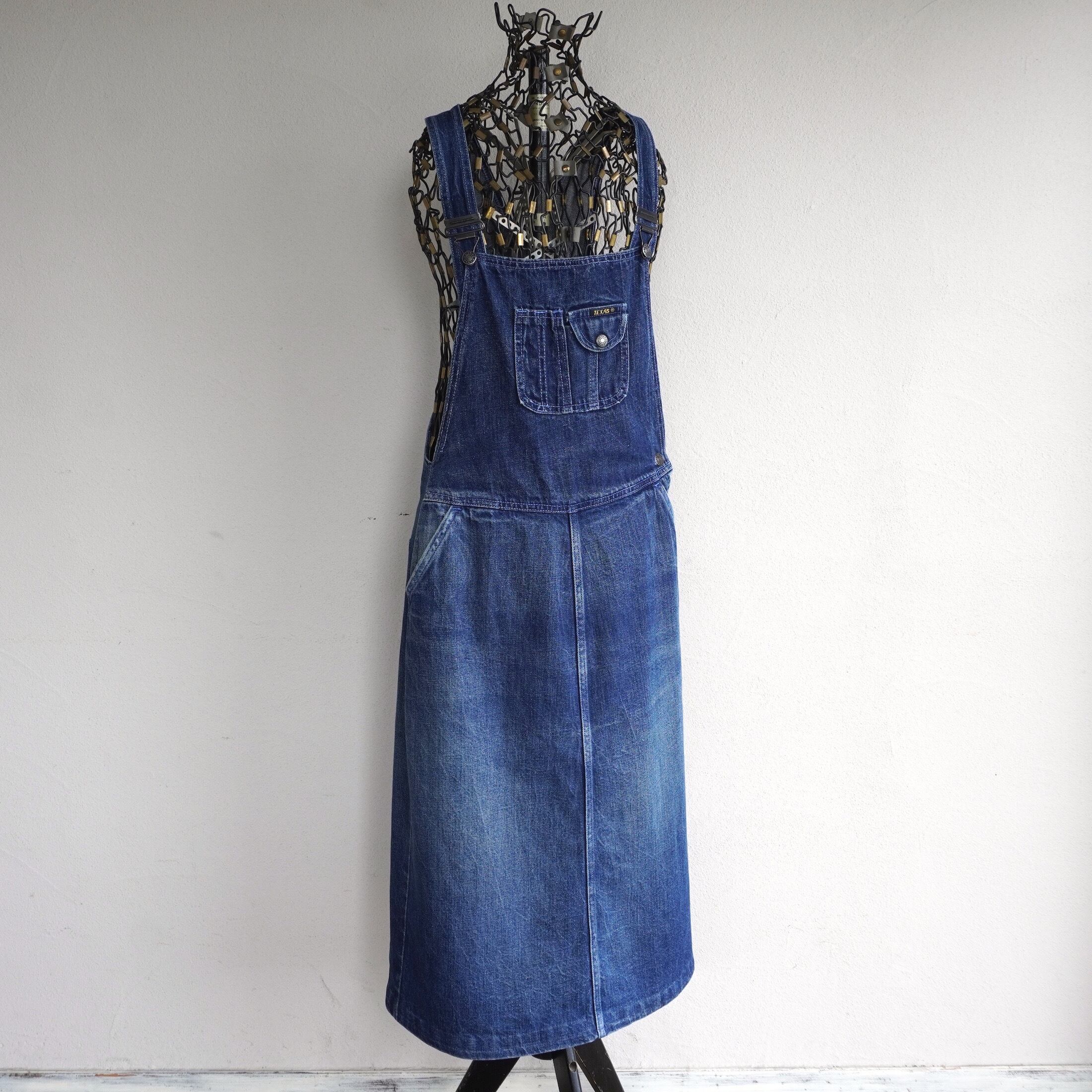 ●平置き実寸:ビブ上部幅23.5cm、ウエスト37cm(×2)、ヒップ53cm(×2)、裾幅59cm、着丈102cm、身丈最長133cm(※肩ストラップで調節可能) ※多少の誤差はご容赦下さい。