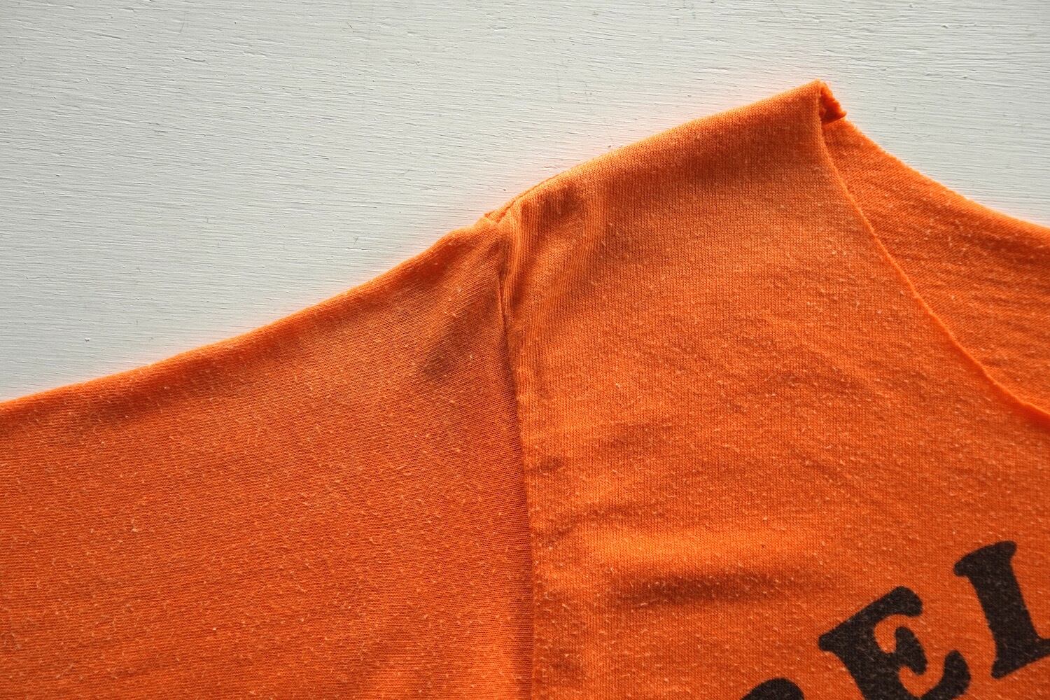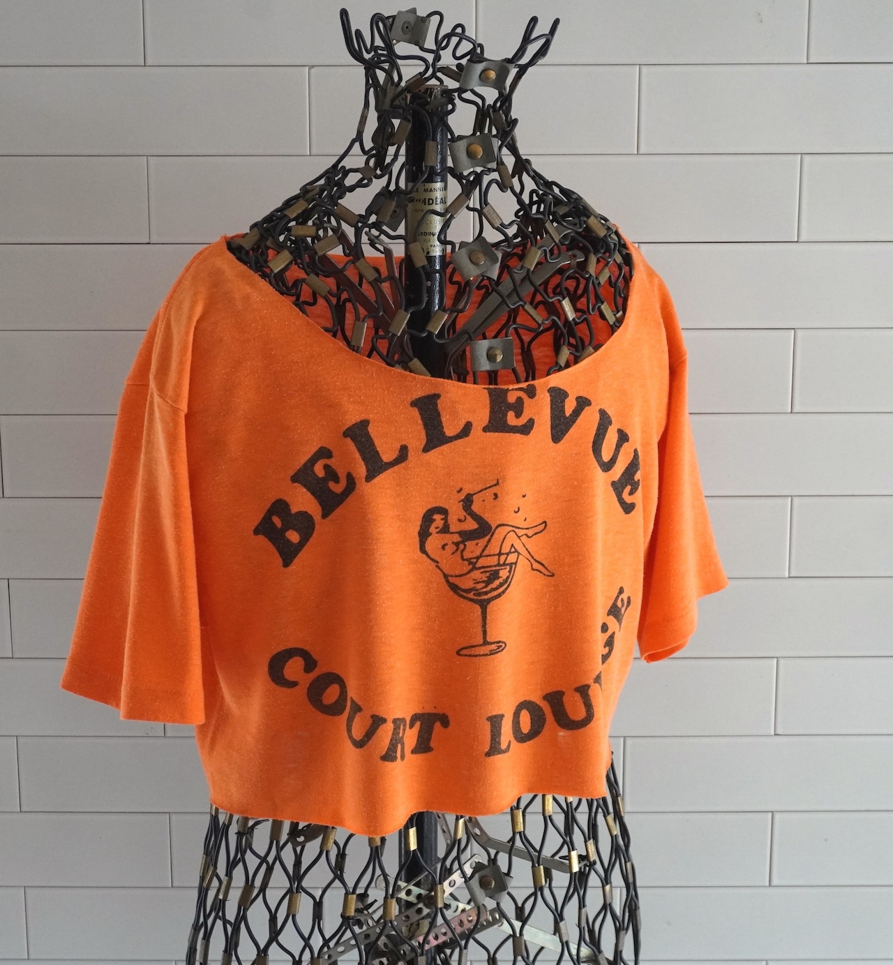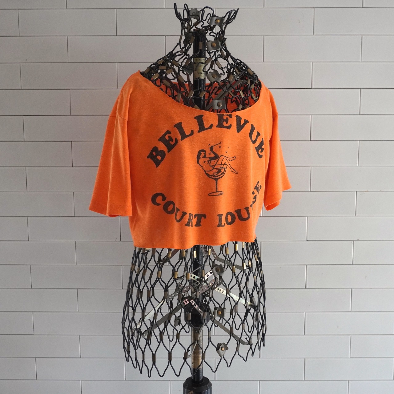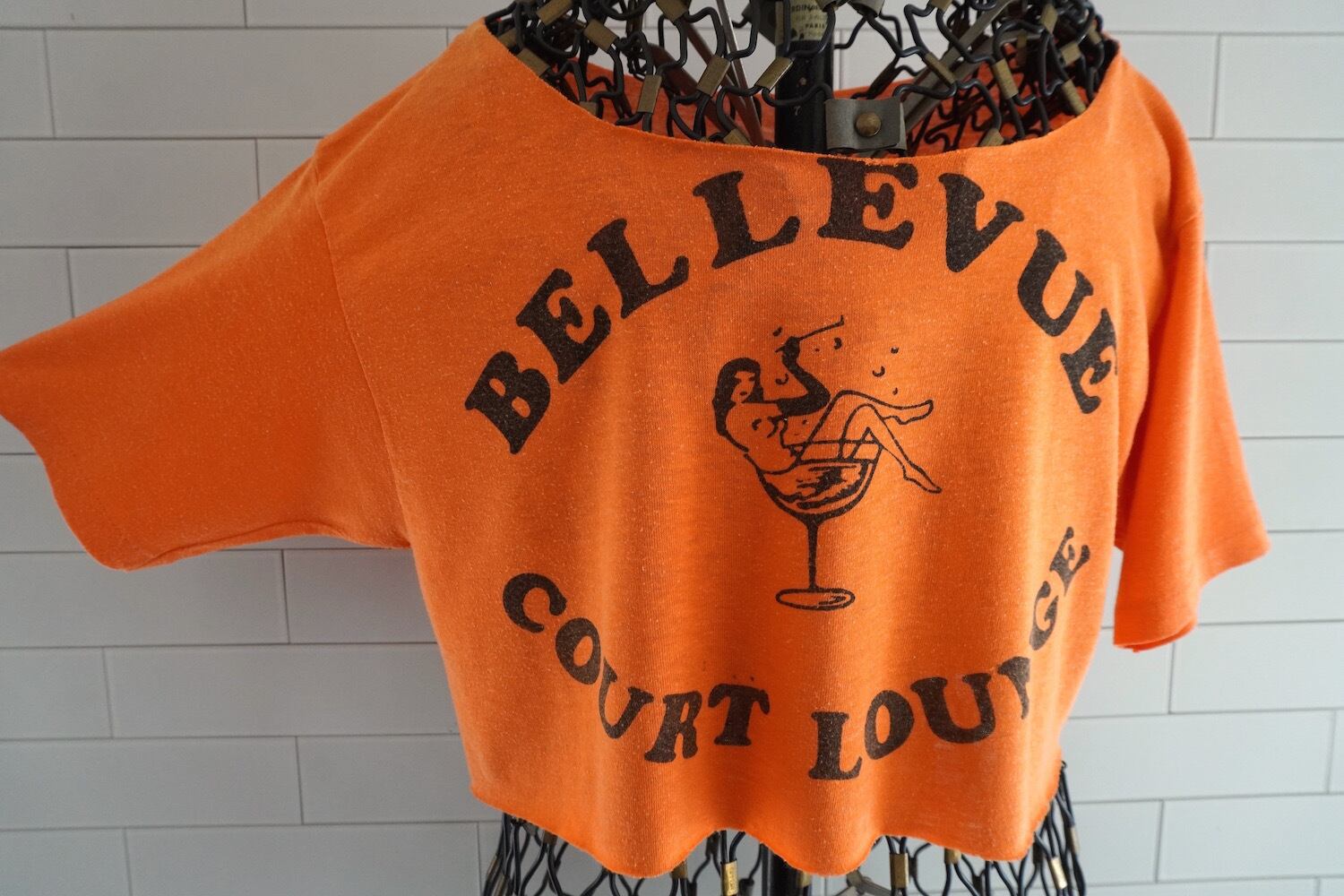 1980's "BELLEVUE COURT LOUNGE" デコルテ&ベアミドリフ カットオフ プリントTシャツ オレンジ 実寸(women's M程度) シングルステッチ クロップド ショート丈 ヴィンテージ USA
