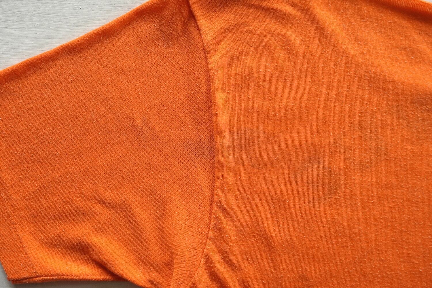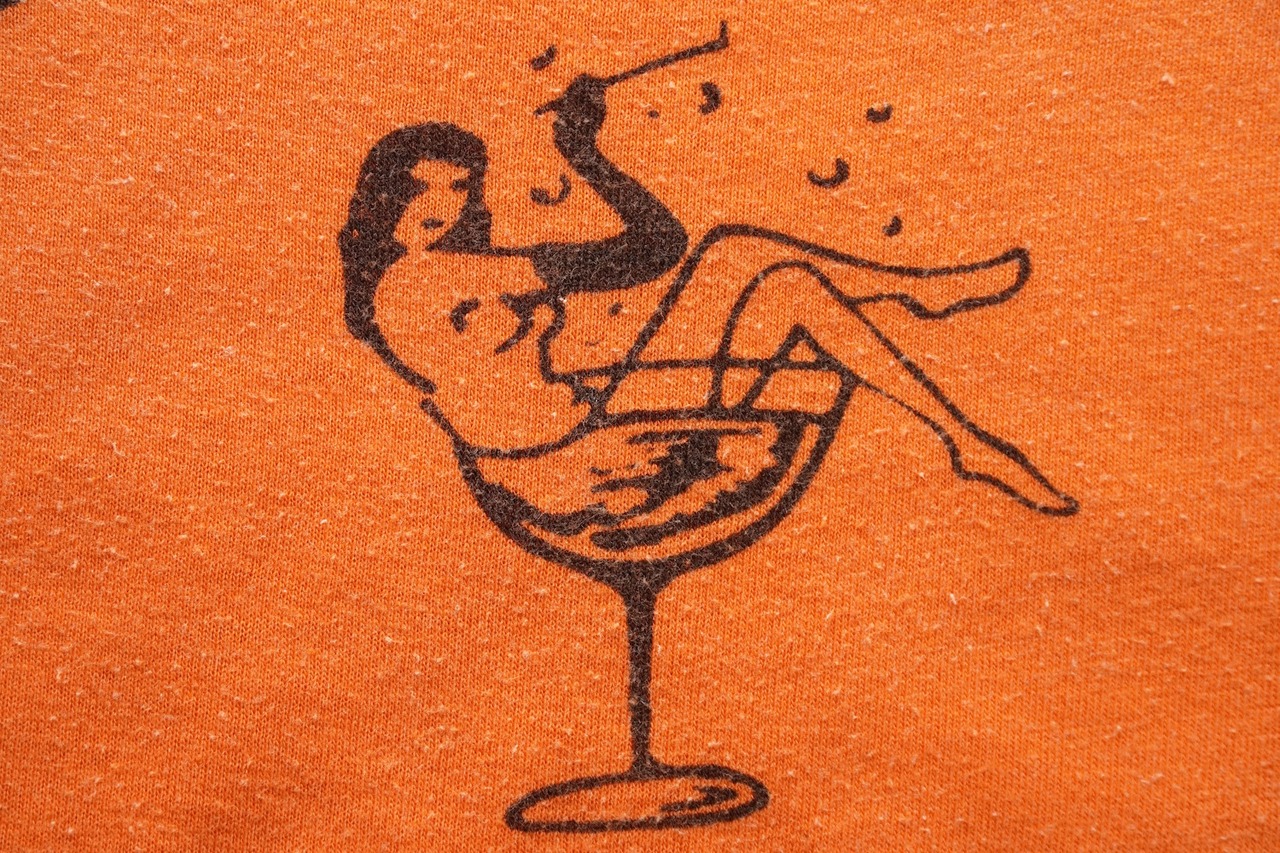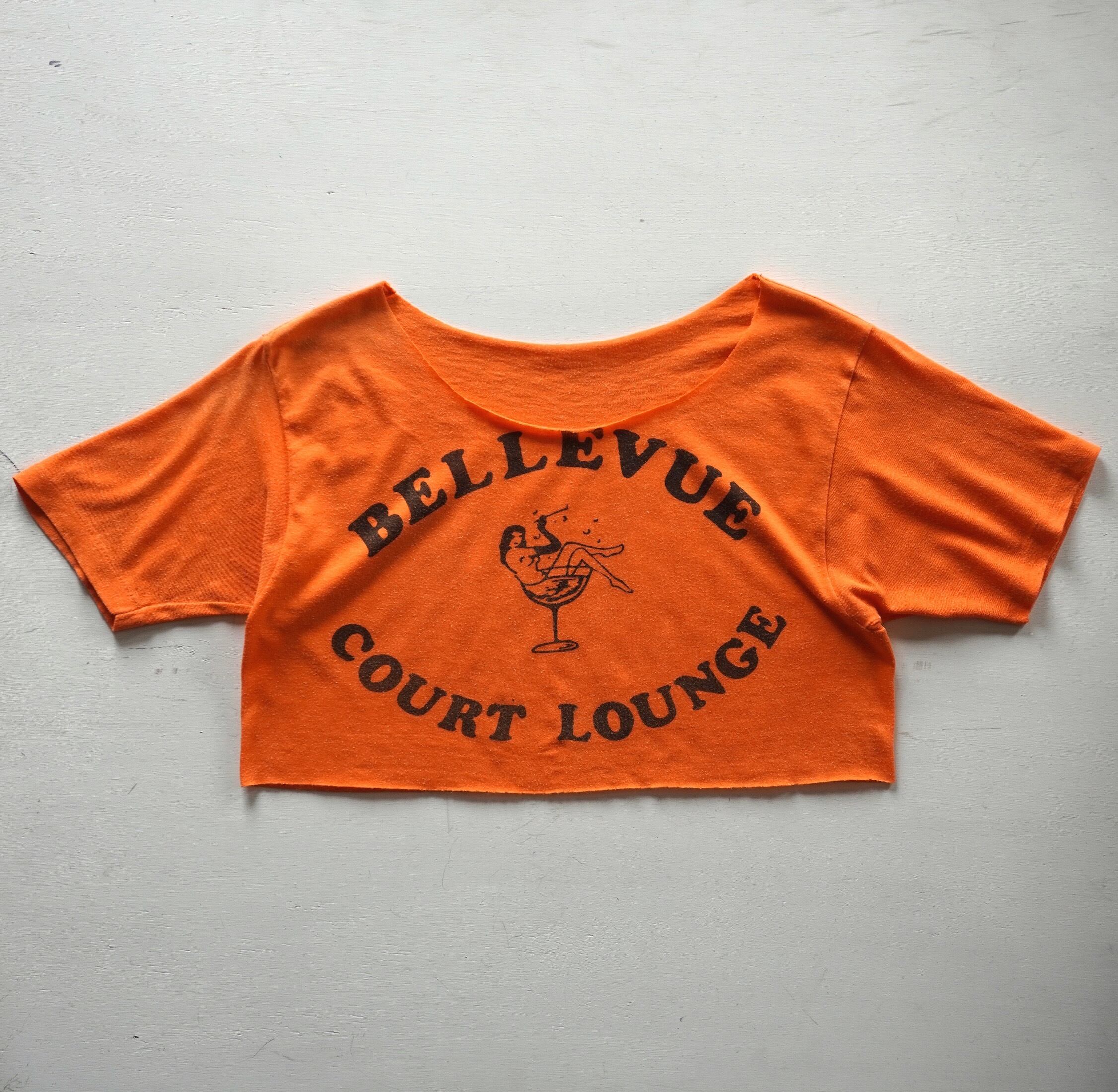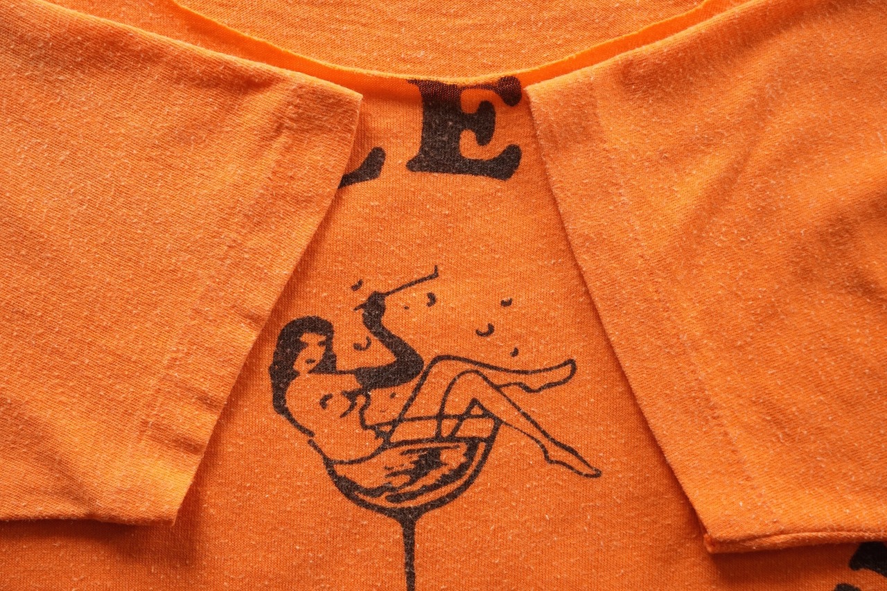 1980's "BELLEVUE COURT LOUNGE" デコルテ&ベアミドリフ カットオフ プリントTシャツ オレンジ 実寸(women's M程度) シングルステッチ クロップド ショート丈 ヴィンテージ USA