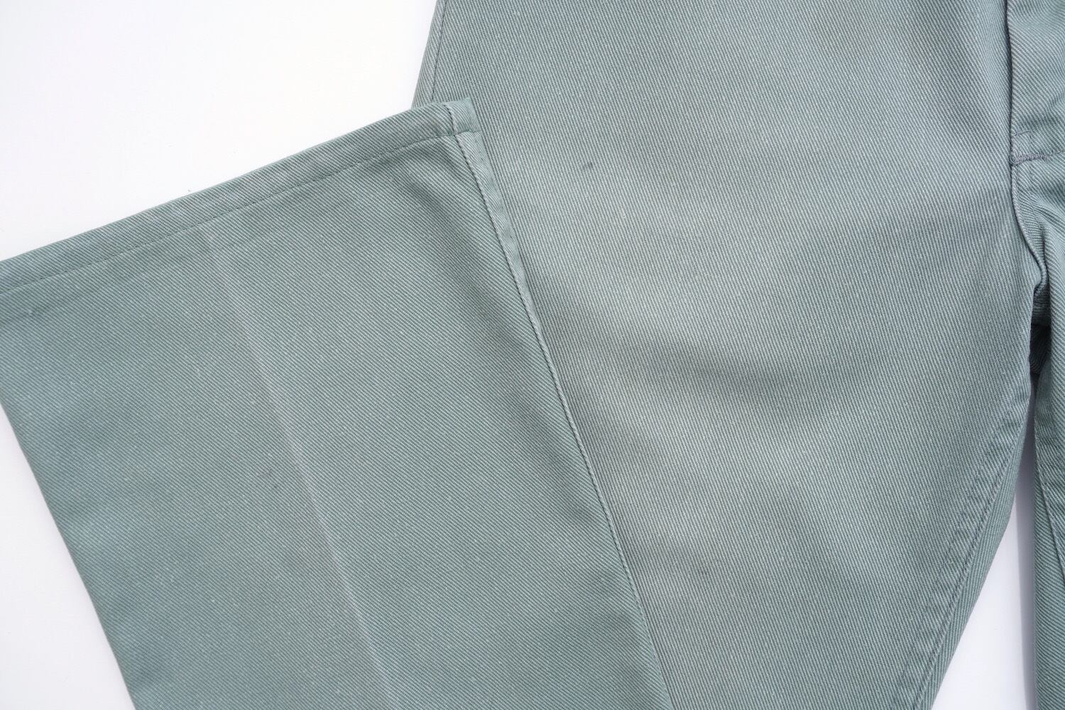 くすみペールトーンのアーモンドグリーンが綺麗な、コットンツイルのブーツカットパンツ。