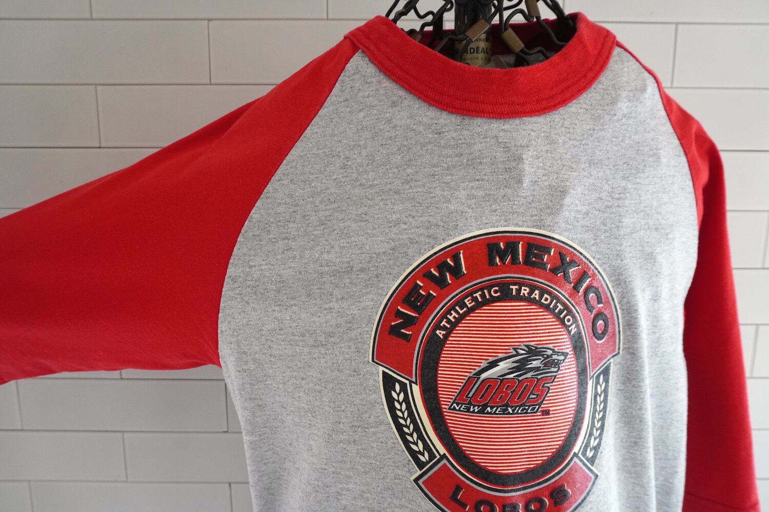 ニューメキシコ大学のアスレチックチーム「NEW MEXICO LOBOS」のラグランベースボールTシャツ。