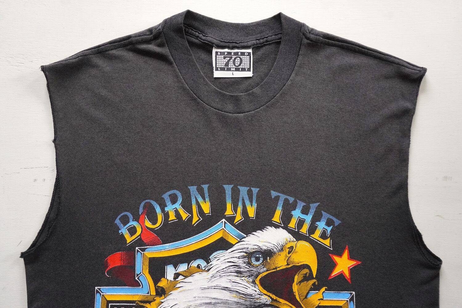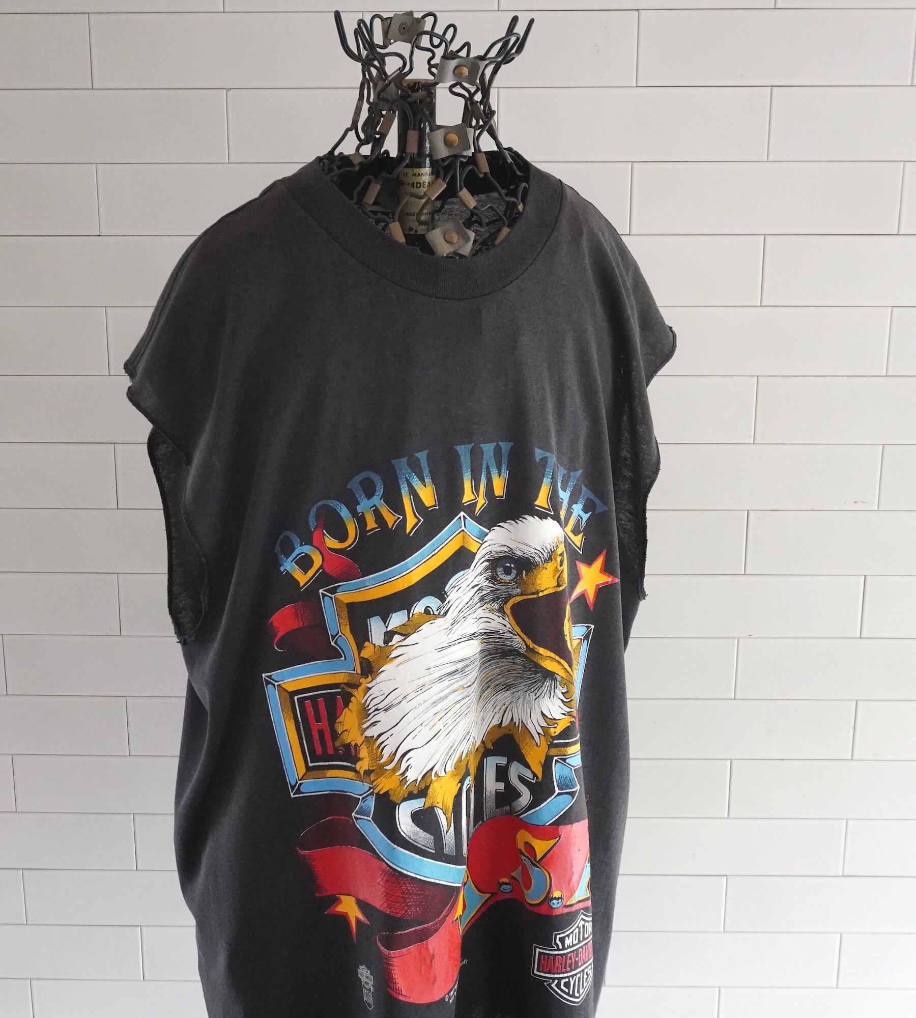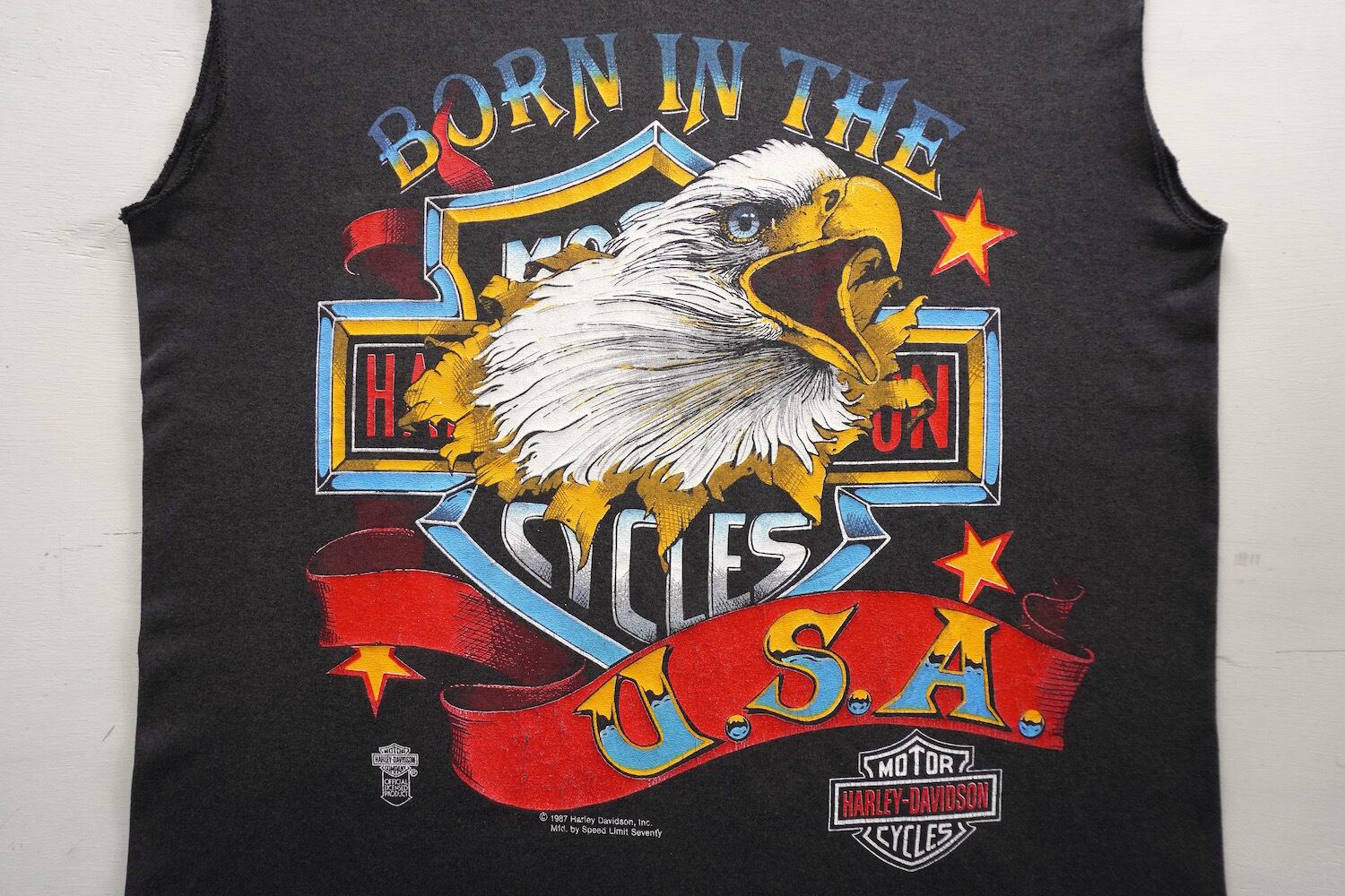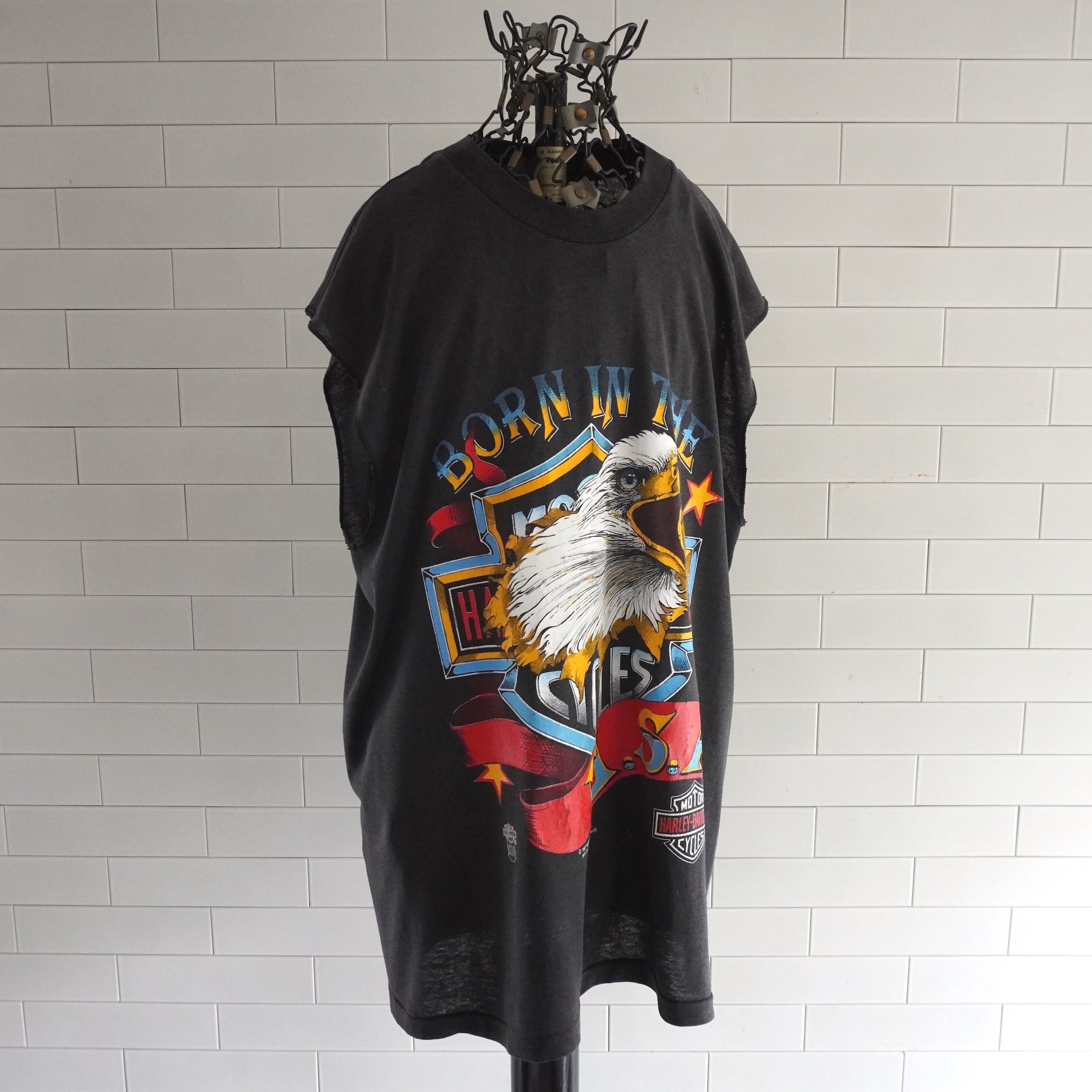 1980's [SPEED LIMIT 70] "HARLEY-DAVIDSON" BORN IN THE U.S.A. ホワイトヘッドイーグルプリント カットオフ スリーブレスTシャツ ブラック 表記(men's L) ハーレー・ダヴィッドソン ヴィンテージ | MAGNOLIA WEBSTORE