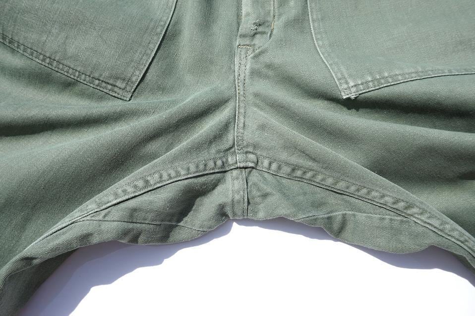 角の無いヒップポケットや、股ガゼットが特徴的。