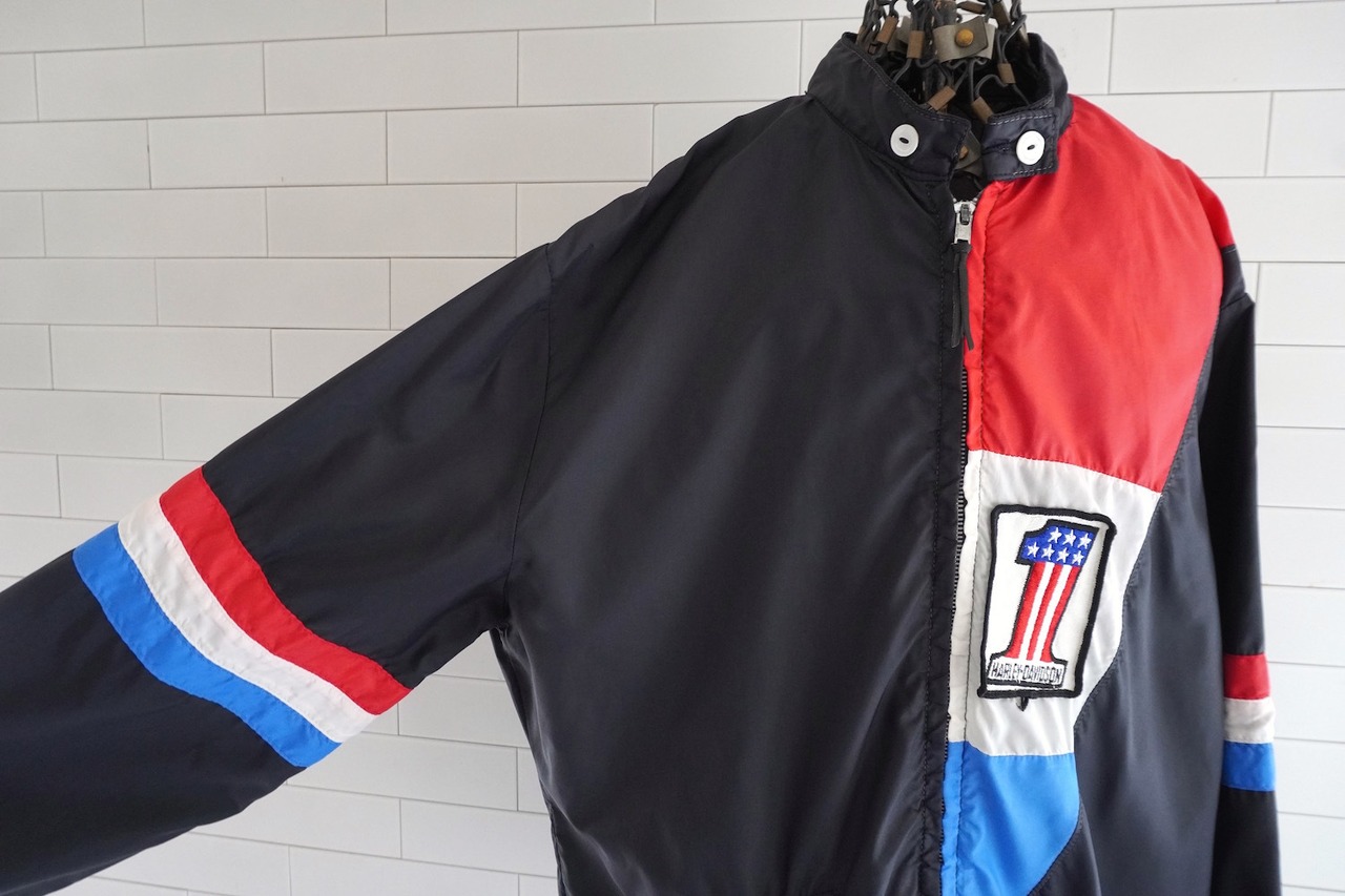 ブラック×トリコロール配色の切り替えに星条旗柄"No.1"パッチがcoolな、「HARLEY-DAVIDSON」ナイロンレーシングジャケット。