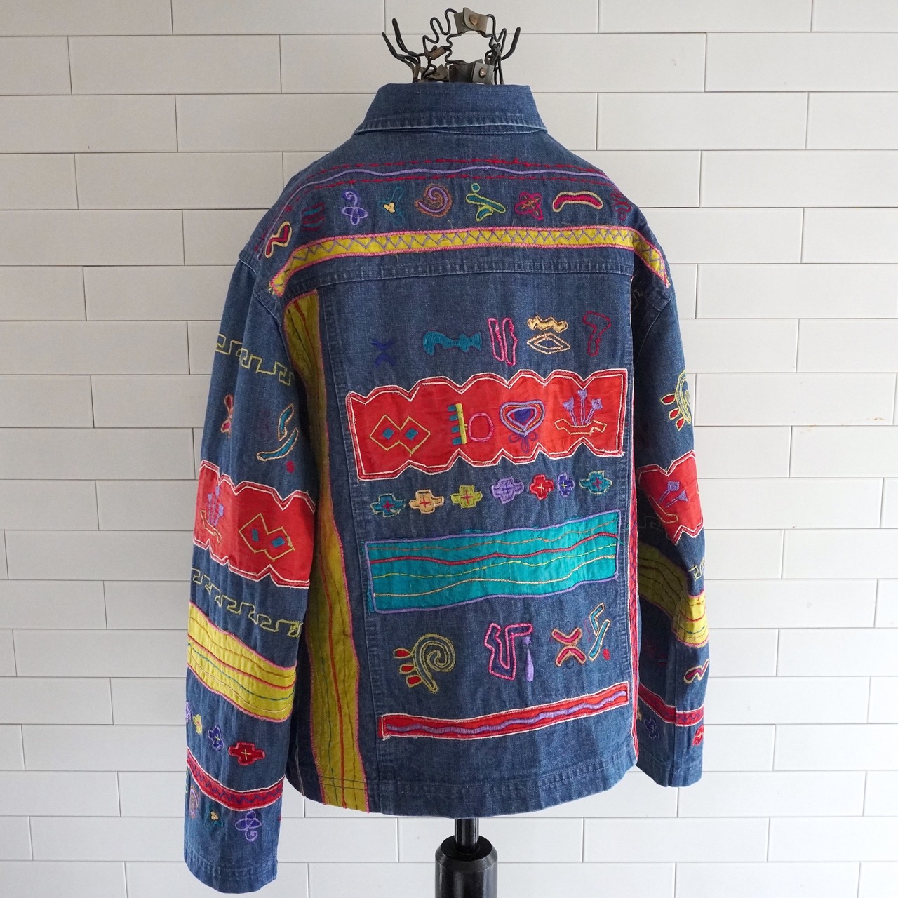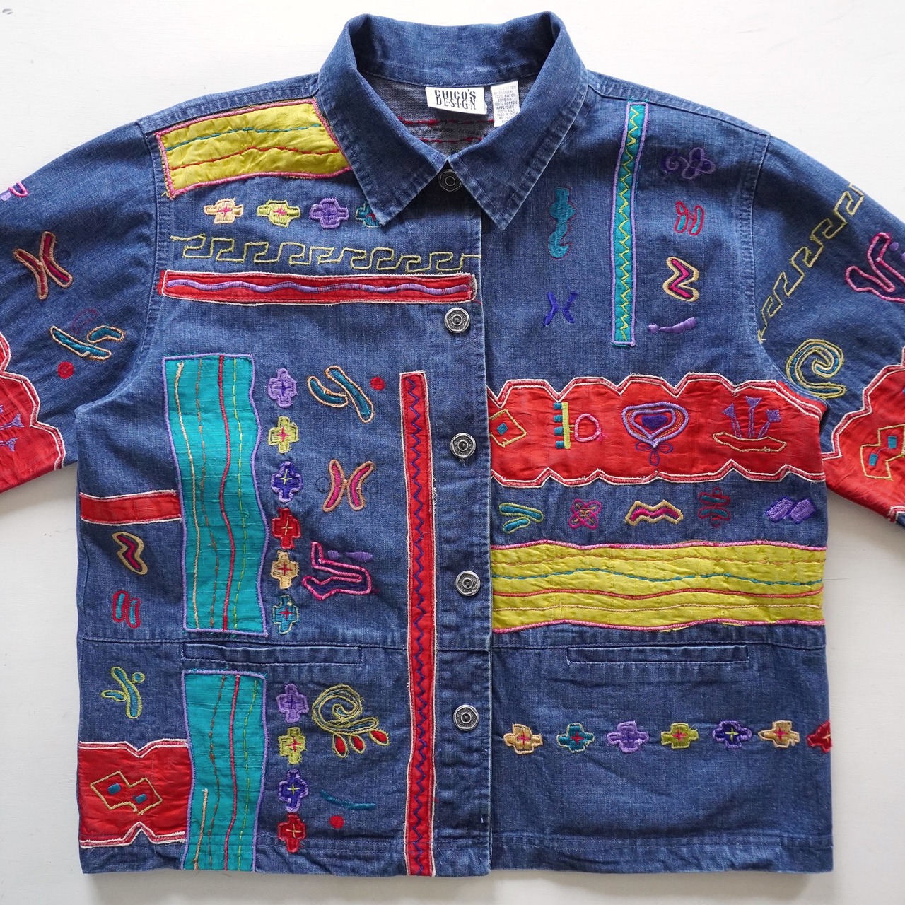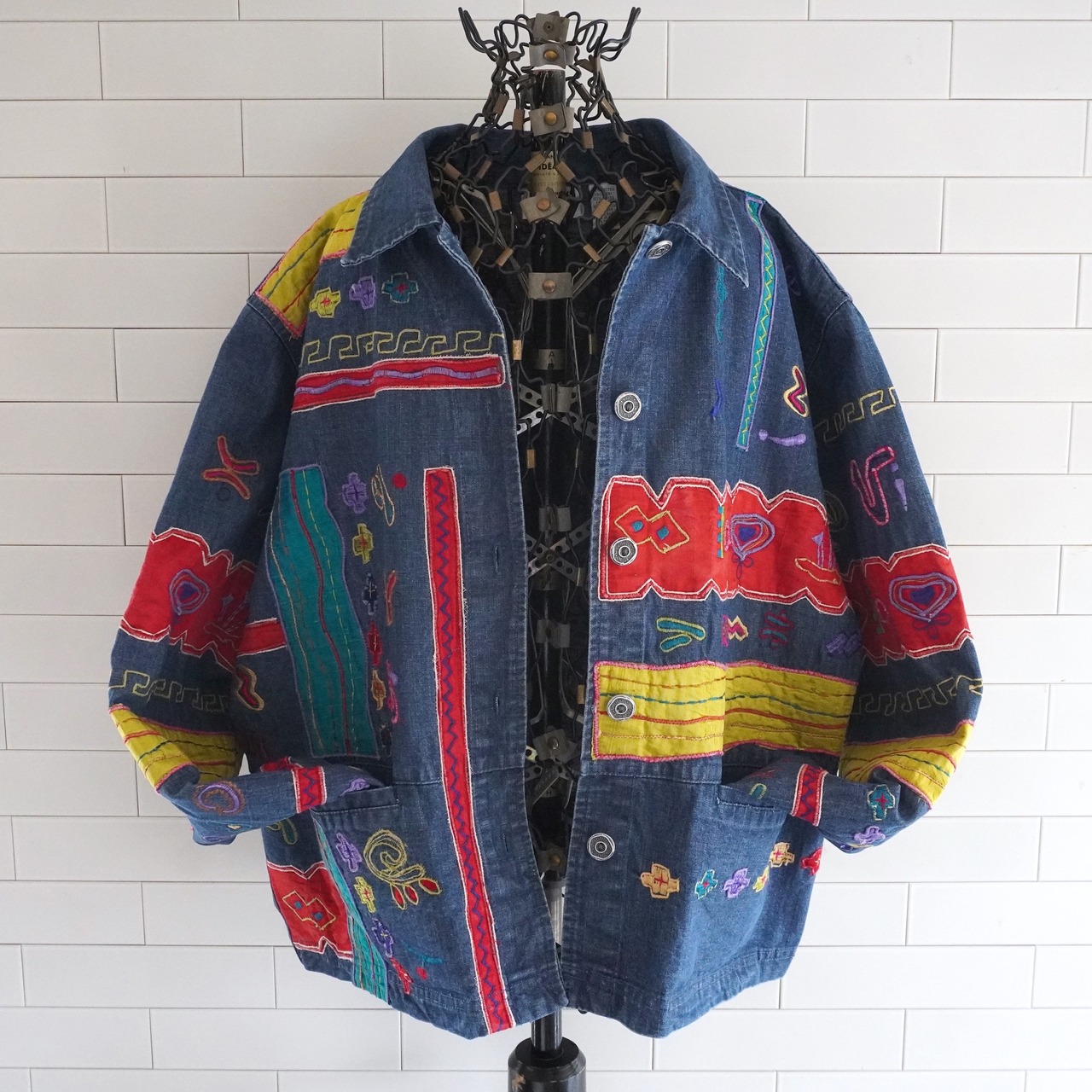 1990's [CHICO'S DESIGN] エンブロイダリー&シルクアップリケ カバーオール型デニムジャケット インディゴブルー 実寸(women's M〜L程度) クロス 象形文字 刺繍 ヴィンテージ | MAGNOLIA WEBSTORE