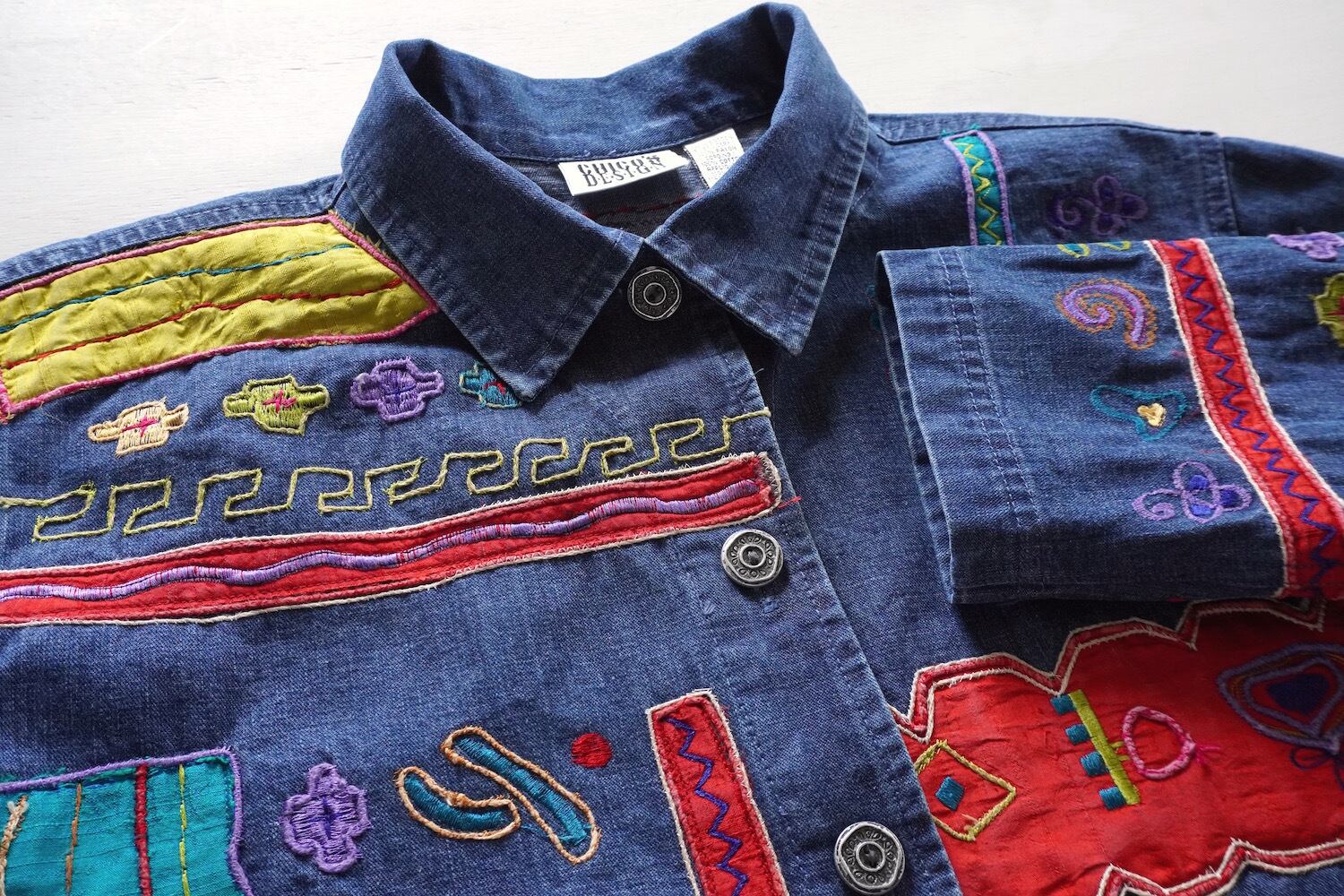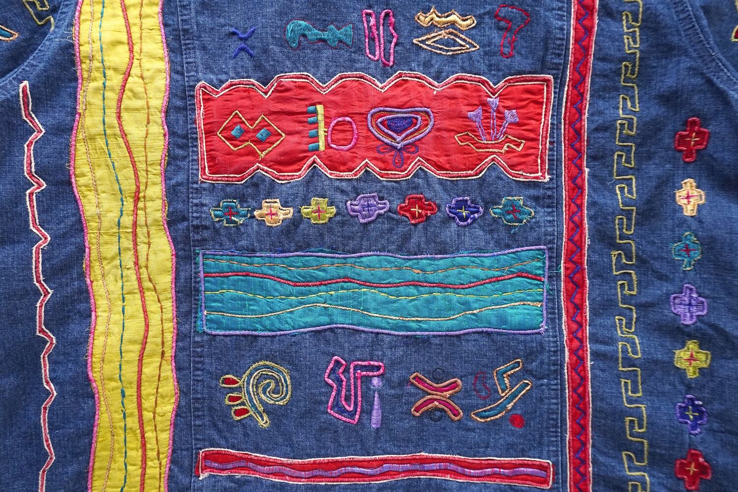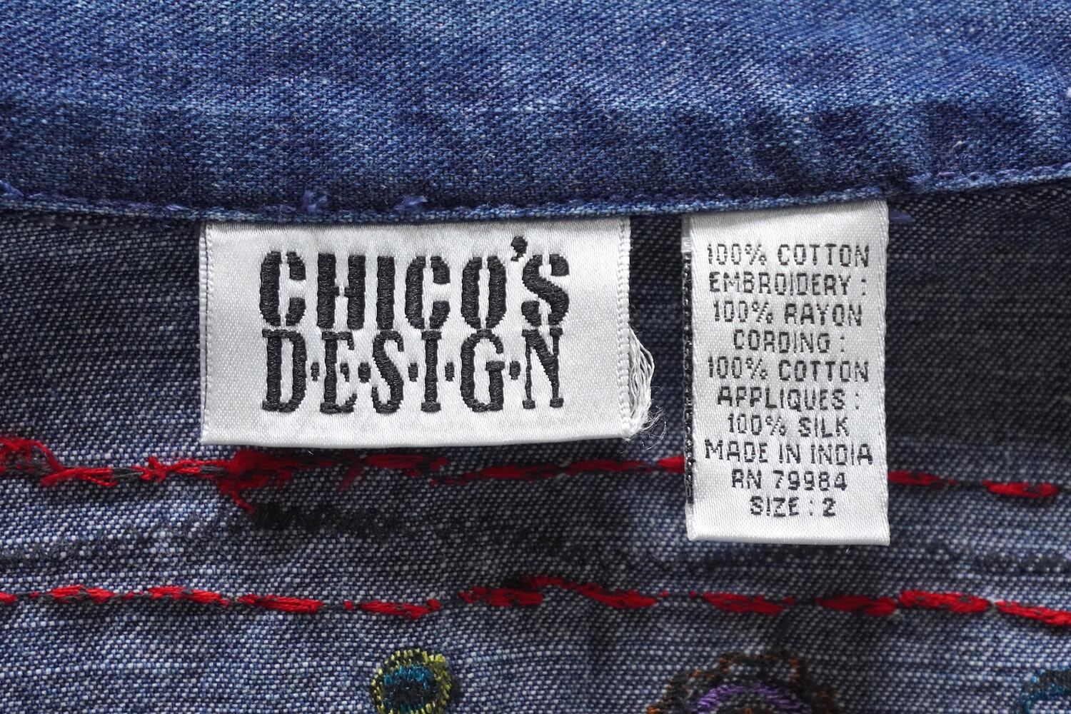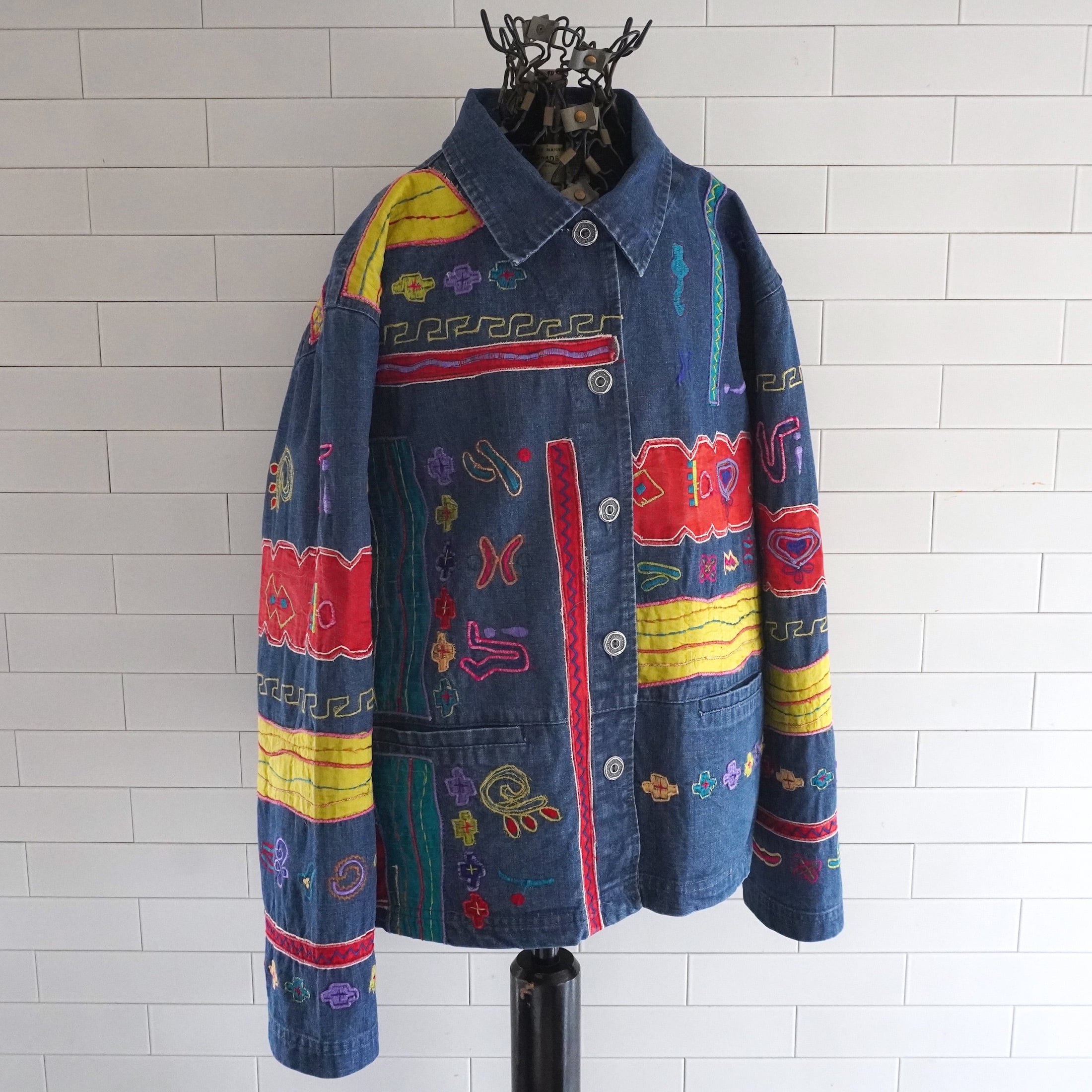 1990's [CHICO'S DESIGN] エンブロイダリー&シルクアップリケ カバーオール型デニムジャケット インディゴブルー 実寸(women's M〜L程度) クロス 象形文字 刺繍 ヴィンテージ | MAGNOLIA WEBSTORE