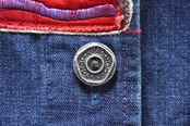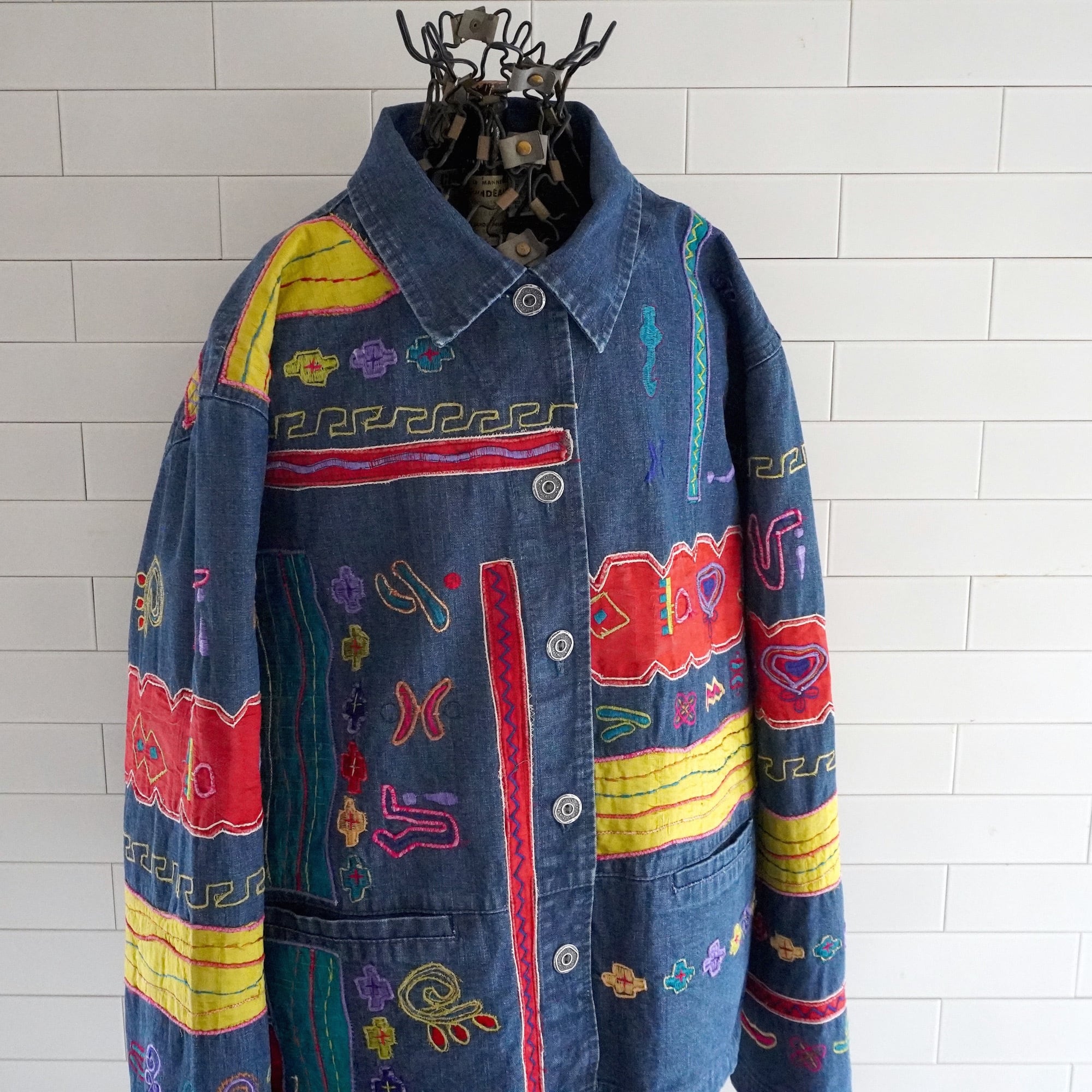 カラフルなクロスや象形文字風モチーフのエンブロイダリー&シルクアップリケが可愛い、カバーオール型デニムジャケット。