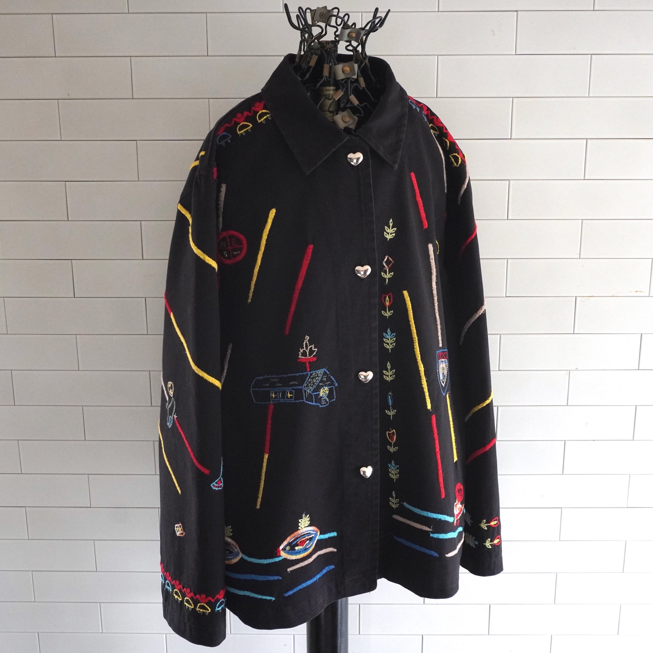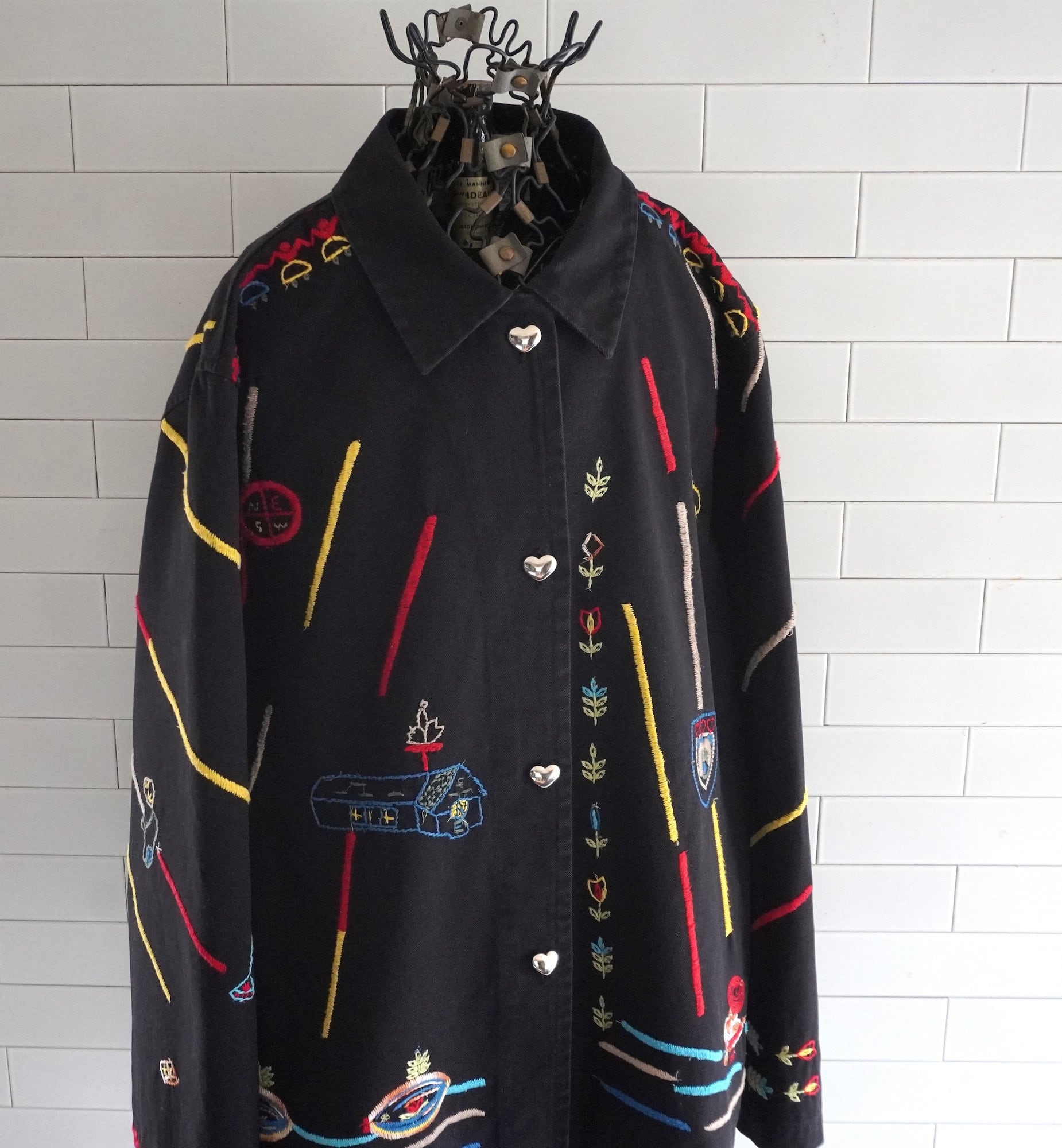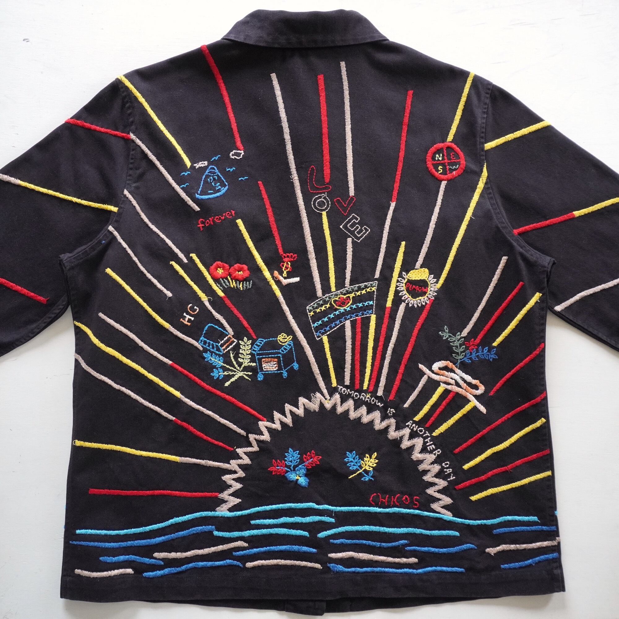 1990's [CHICO'S DESIGN] エンブロイダリー カバーオール型コットンツイルジャケット ブラック 実寸(women's M〜L程度) LOVE 海 太陽 刺繍 ヒッピー ヴィンテージ | MAGNOLIA WEBSTORE