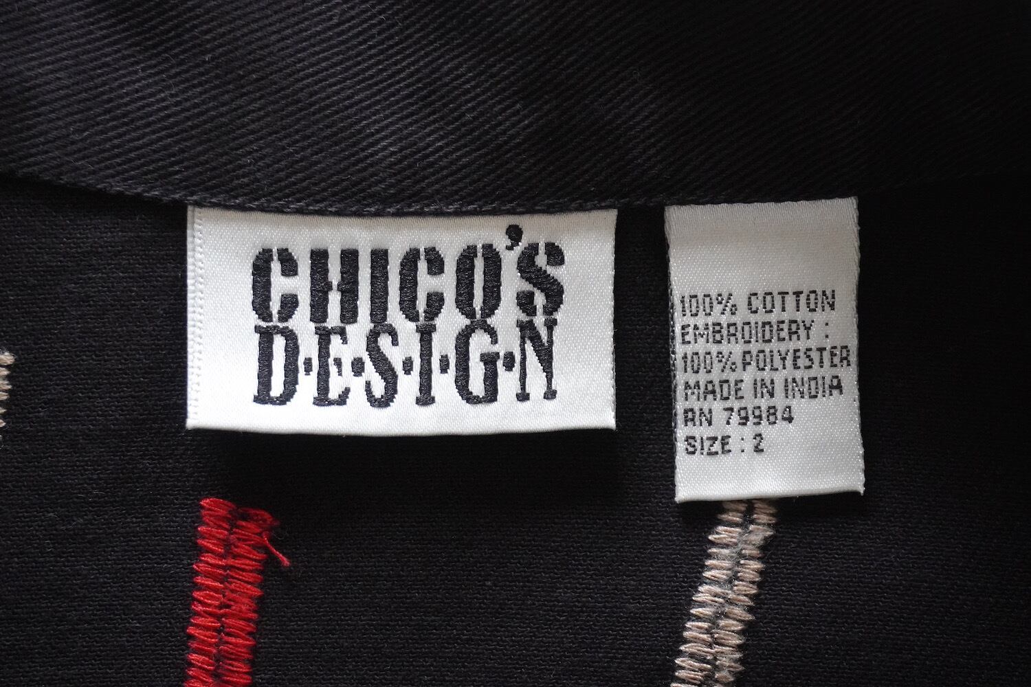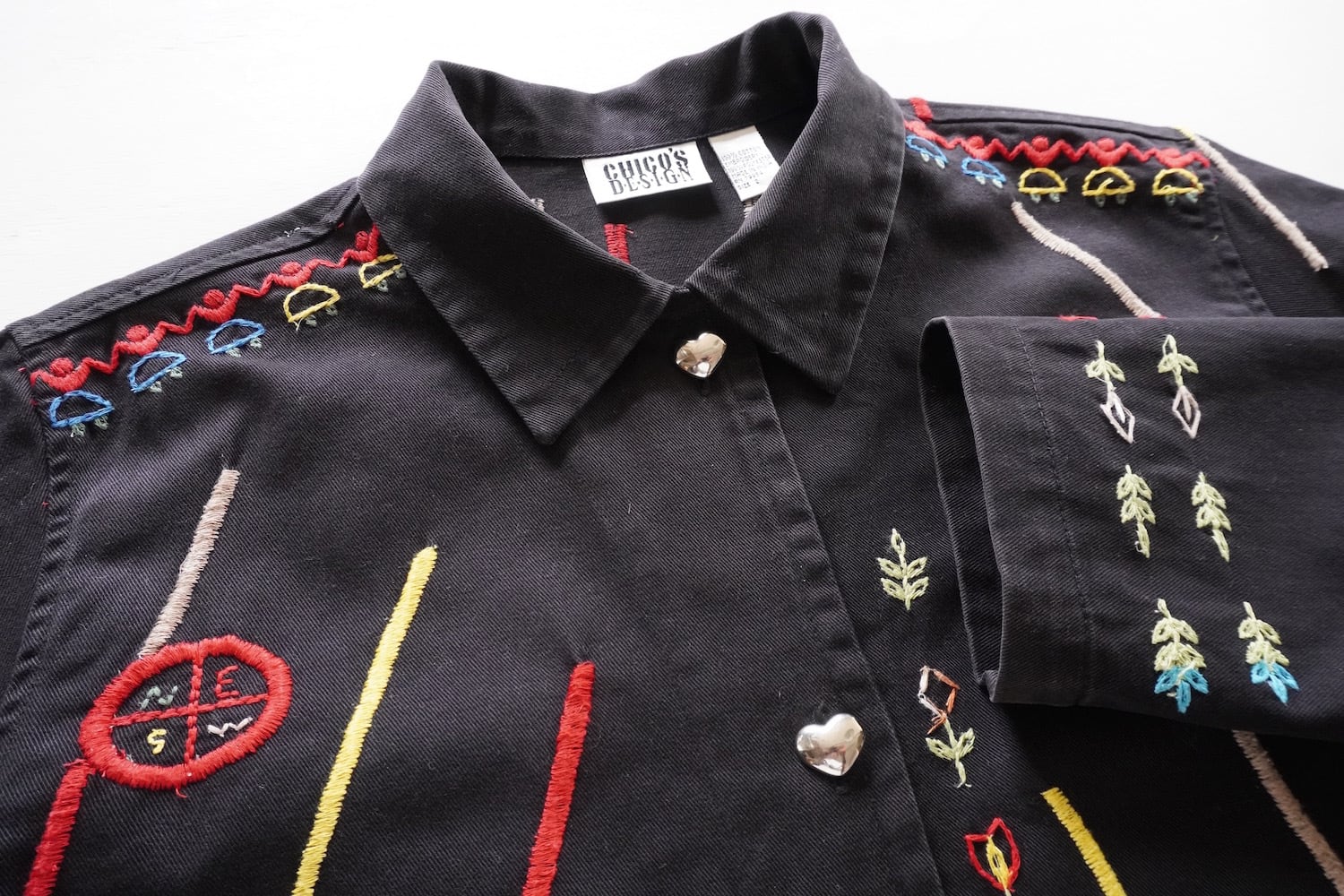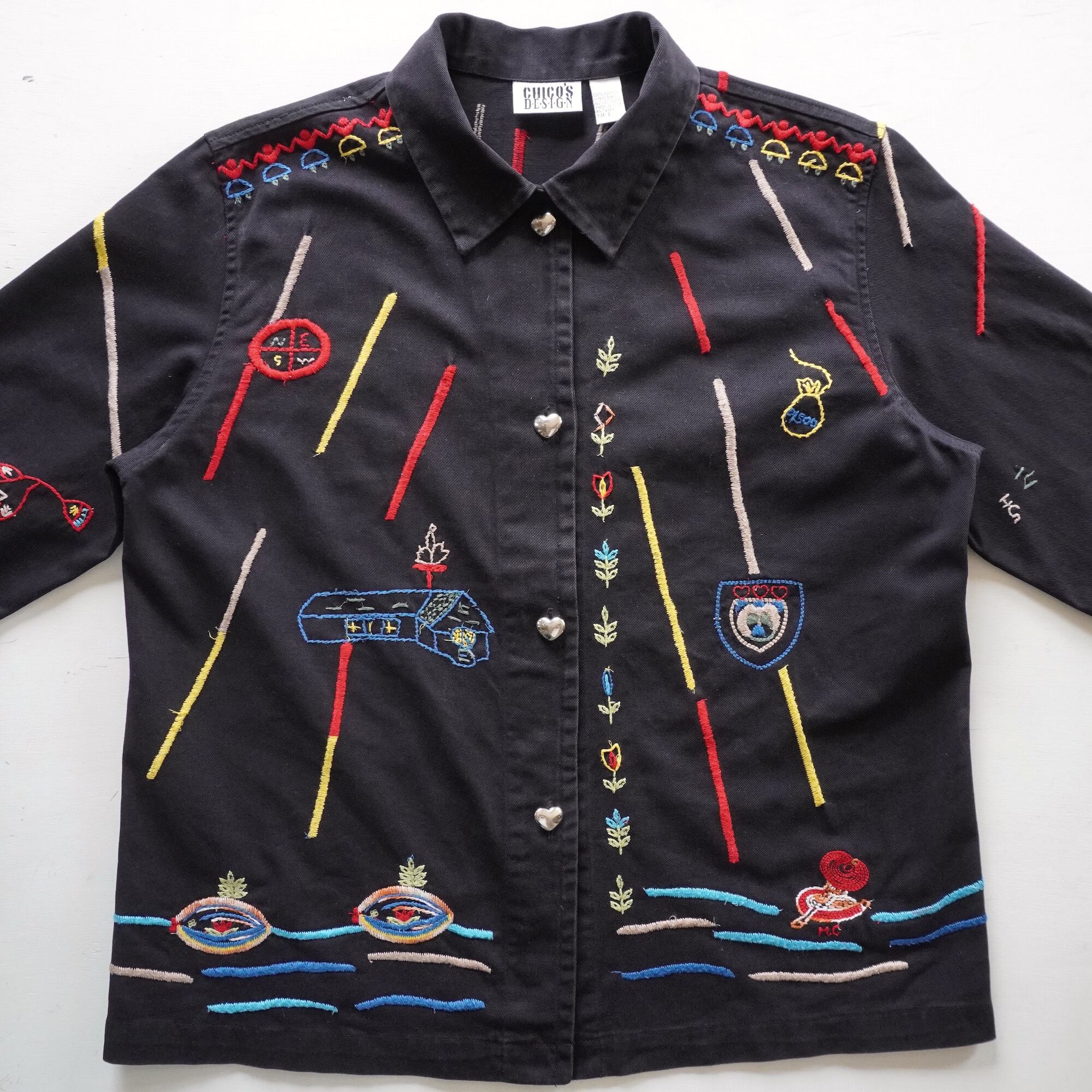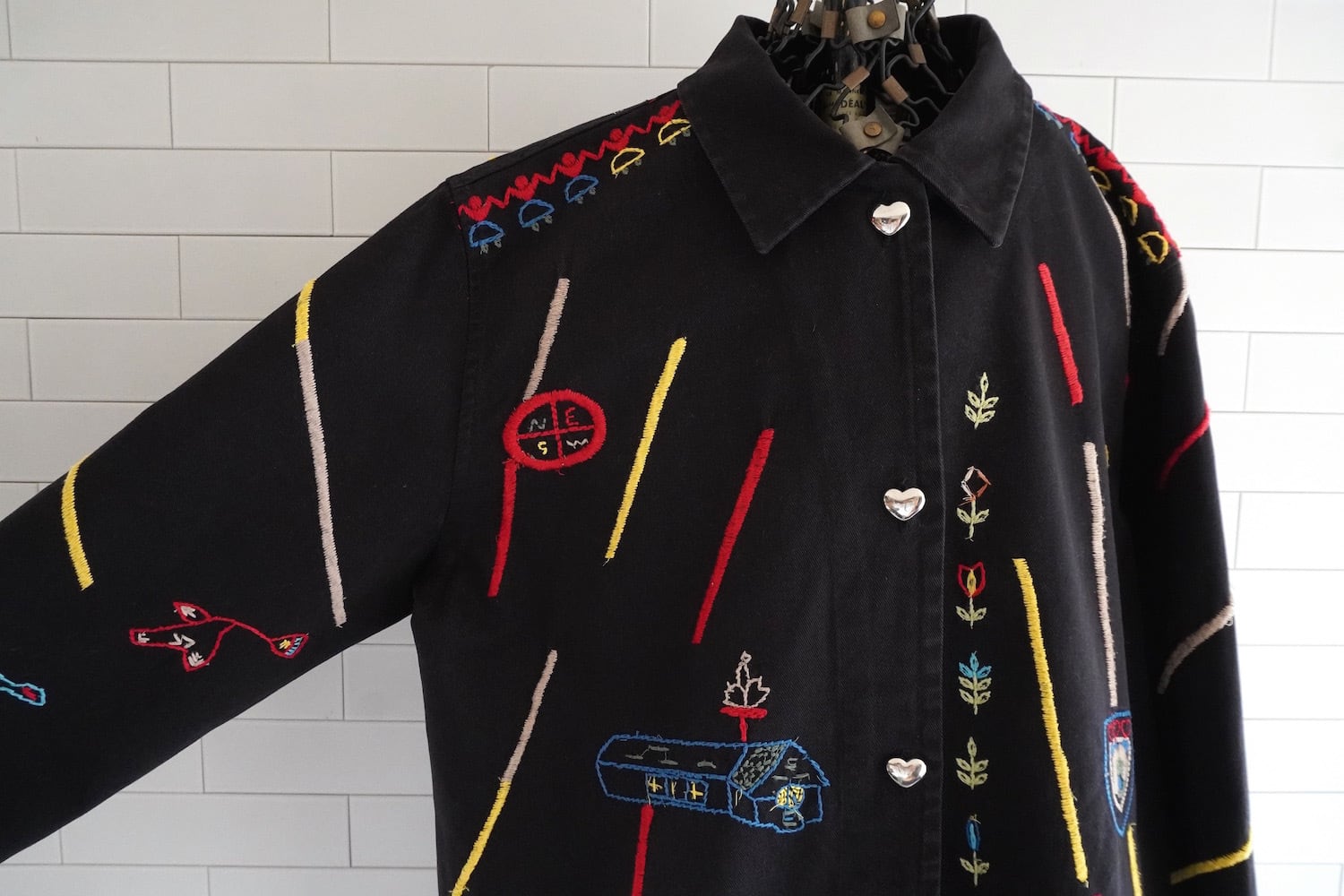 1990's [CHICO'S DESIGN] エンブロイダリー カバーオール型コットンツイルジャケット ブラック 実寸(women's M〜L程度) LOVE 海 太陽 刺繍 ヒッピー ヴィンテージ | MAGNOLIA WEBSTORE
