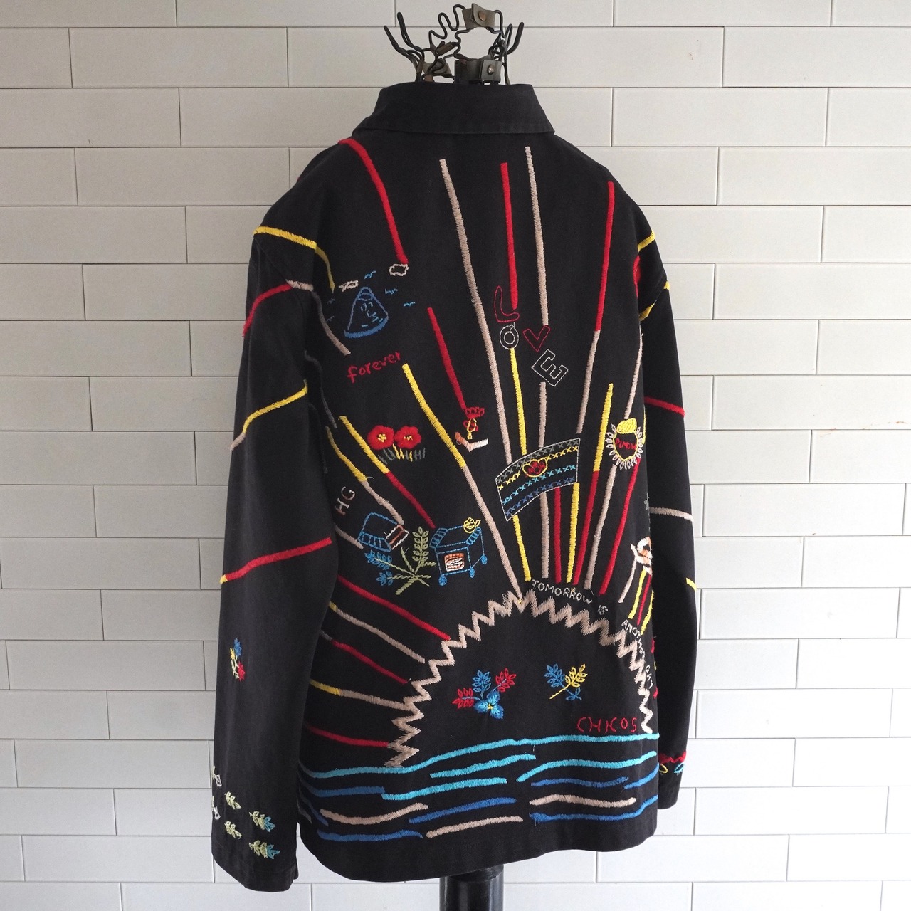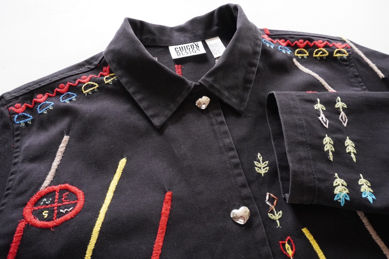 1990's [CHICO'S DESIGN] エンブロイダリー カバーオール型コットンツイルジャケット ブラック 実寸(women's M〜L程度) LOVE 海 太陽 刺繍 ヒッピー ヴィンテージ