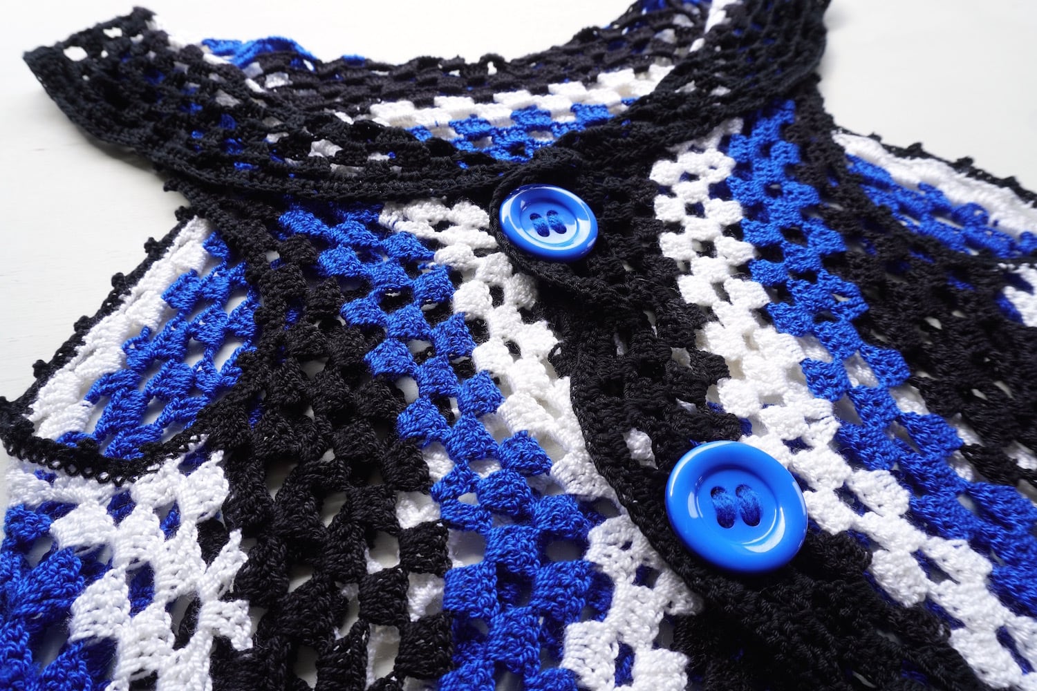 1980's〜 サークルハンドニットクロシェ ロングベストカーディガン ブルー×ブラック×ホワイト 実寸(women's Free) ヴィンテージ ハンドメイド | MAGNOLIA WEBSTORE