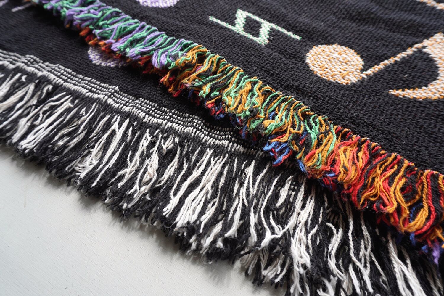 ブラックにマルチペールカラーの音符柄が可愛い、スローブランケットポンチョ。