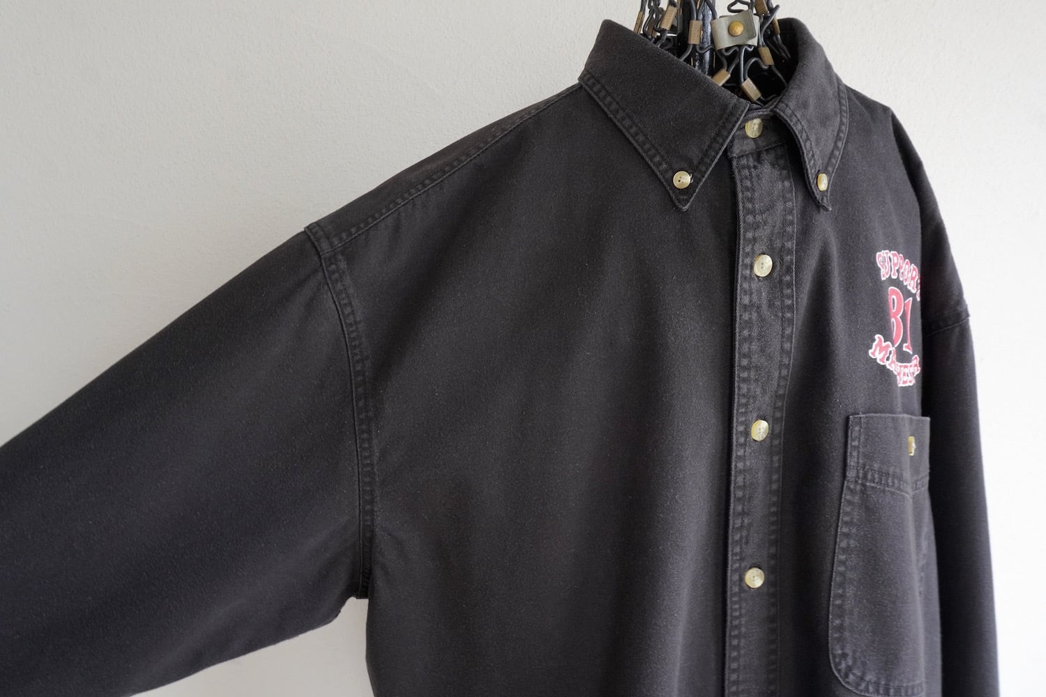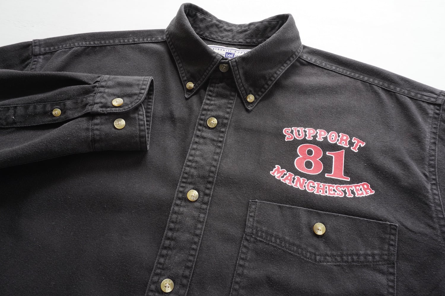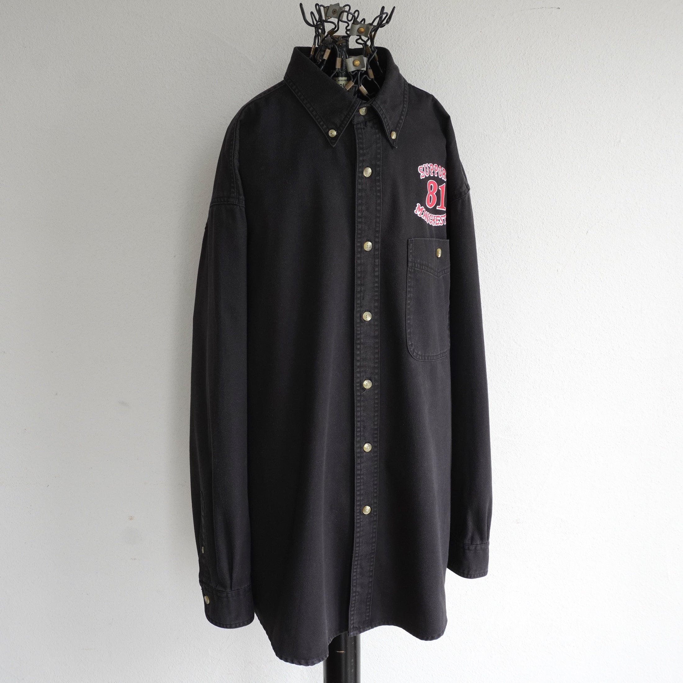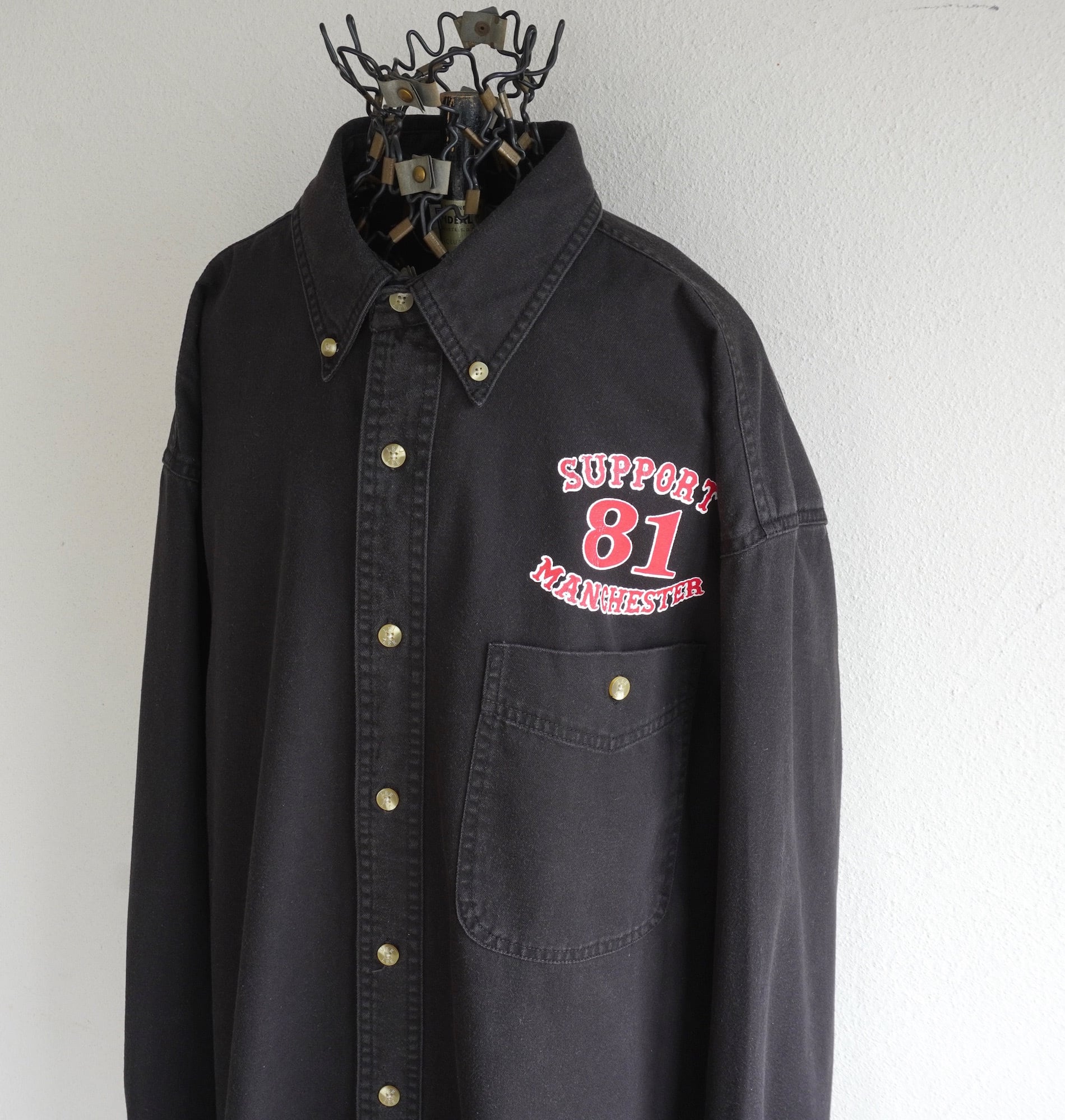 "SUPPORT 81 MANCHESTER"プリント入りL/Sブラックデニムシャツ。