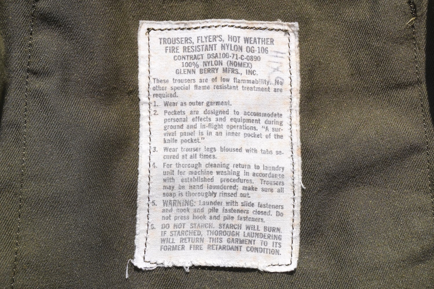 1970's [U.S.ARMY] NOMEX ヘリクルーパンツ オリーブ 表記(MEDIUM-REGULAR) TROUSERS,FLYER'S,HOT WEATHER FIRE RESISTANT NYLON OG-106 アメリカ軍 実物 ヴィンテージ | MAGNOLIA WEBSTORE