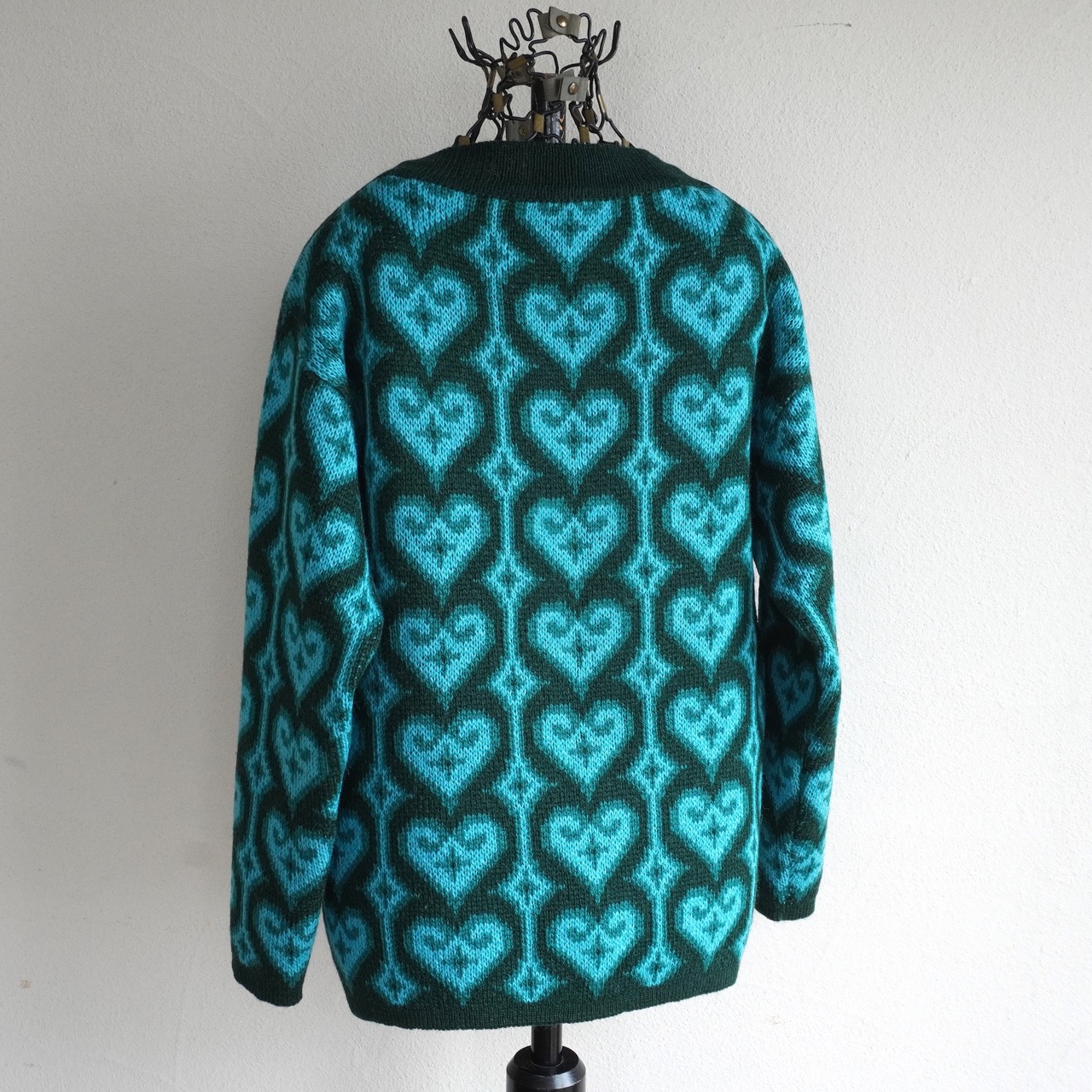 1970's NORWAY製 [JANUS] ハート柄 スラッシュドネック ノルディックニットセーター ボトルグリーン×ターコイズブルー系 表記(women's XS) ノルウェー 北欧 ヴィンテージ | MAGNOLIA WEBSTORE