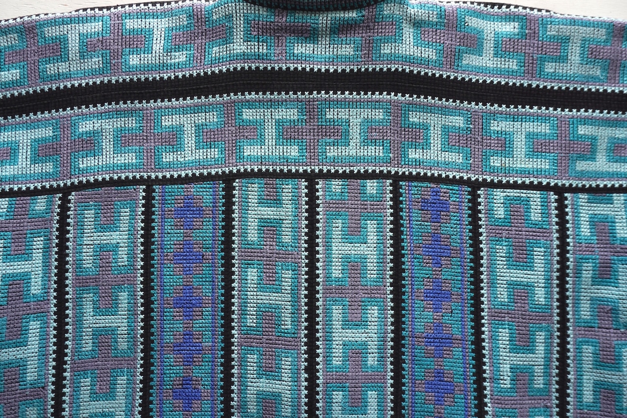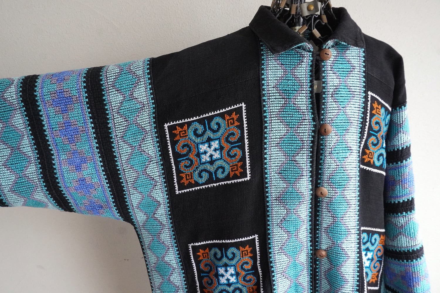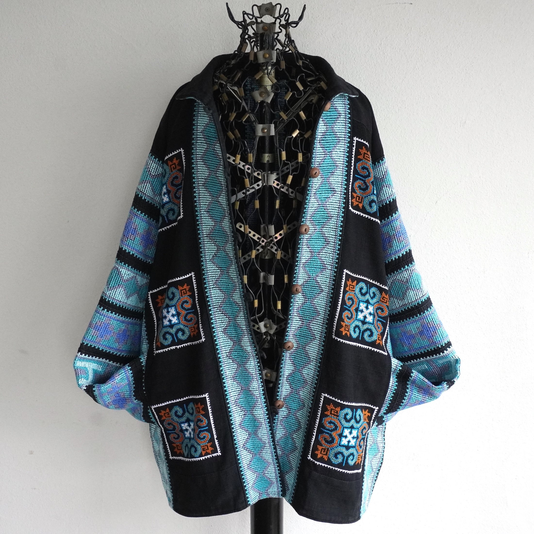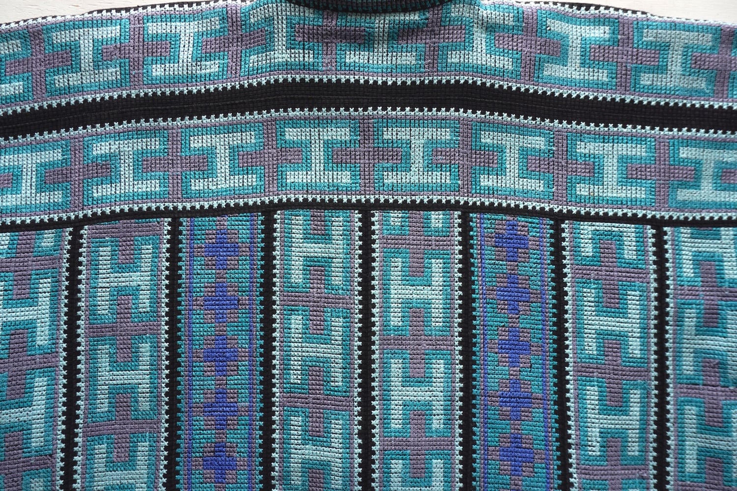モン族 クロスステッチ刺繍 ヴィンテージテキスタイル リバーシブル トライバルジャケット ブラック×ターコイズブルー 実寸(men's L ≒ women's XXL) エンブロイダリー 手刺繍 古布 民族 | MAGNOLIA WEBSTORE