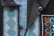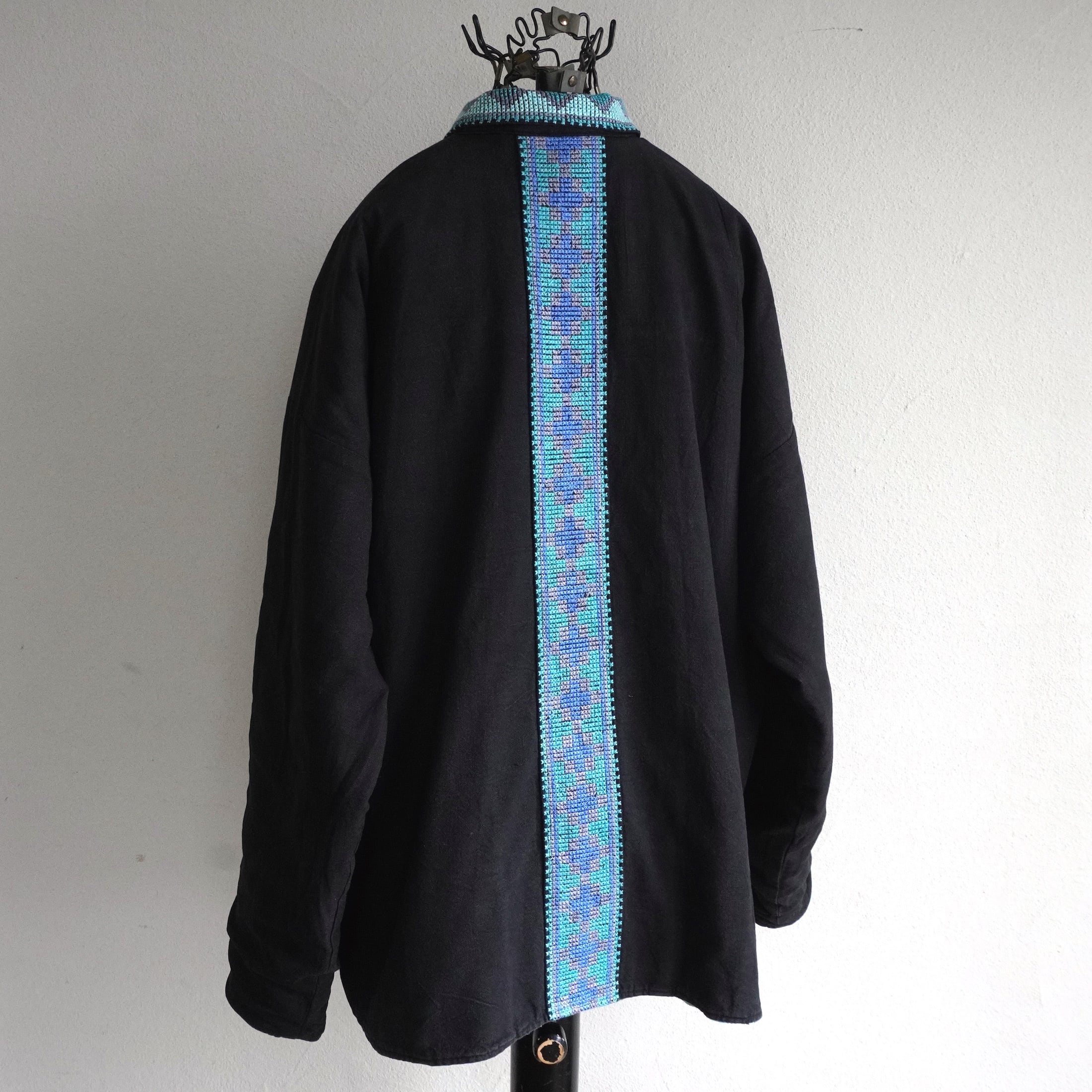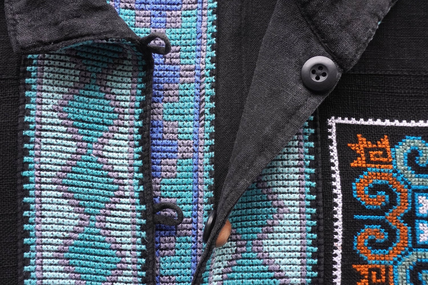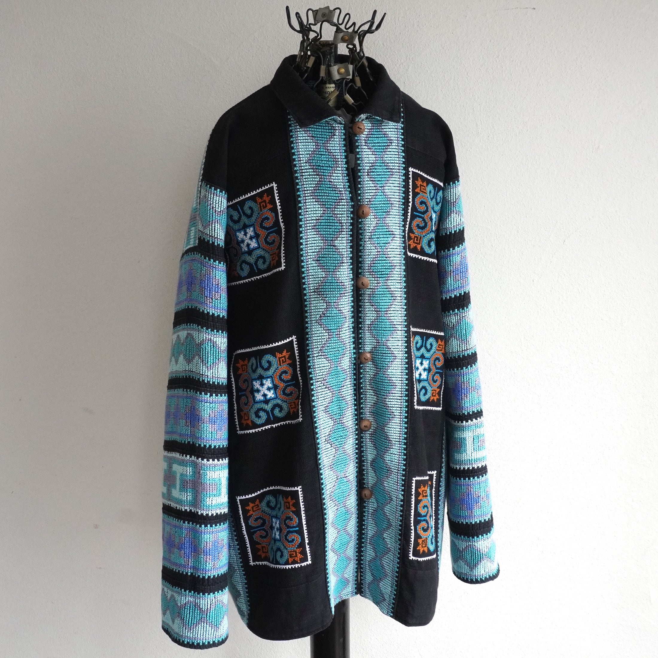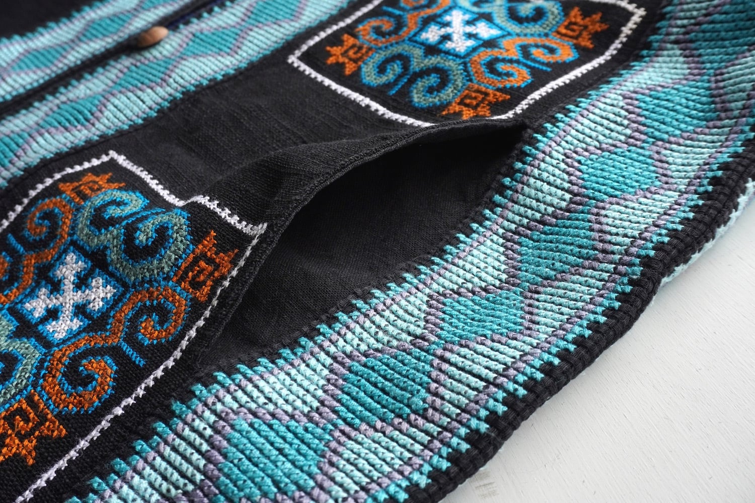 モン族 クロスステッチ刺繍 ヴィンテージテキスタイル リバーシブル トライバルジャケット ブラック×ターコイズブルー 実寸(men's L ≒ women's XXL) エンブロイダリー 手刺繍 古布 民族 | MAGNOLIA WEBSTORE
