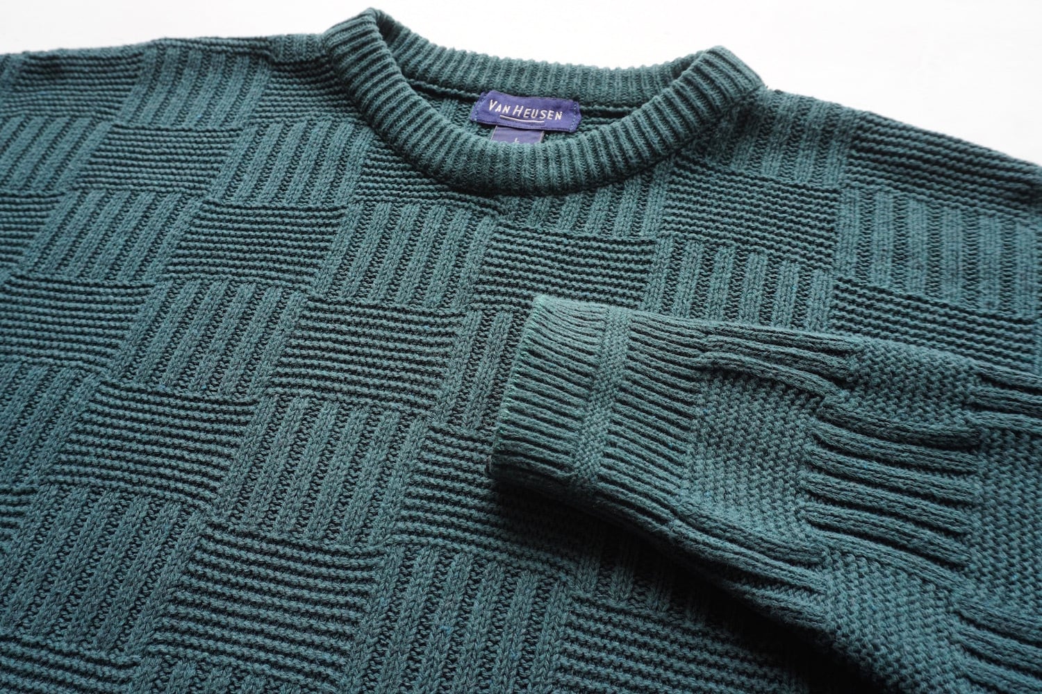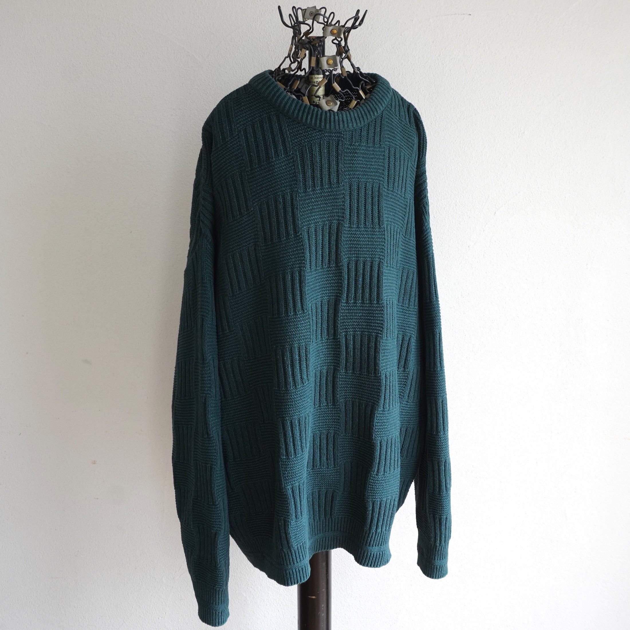 1990's USA製 [VAN HEUSEN] バスケットパターン ミドルゲージ コットンニットセーター クルーネック 無地 ダークグリーン 表記(men's L) ヴァン・ヒューゼン ヴィンテージ | MAGNOLIA WEBSTORE