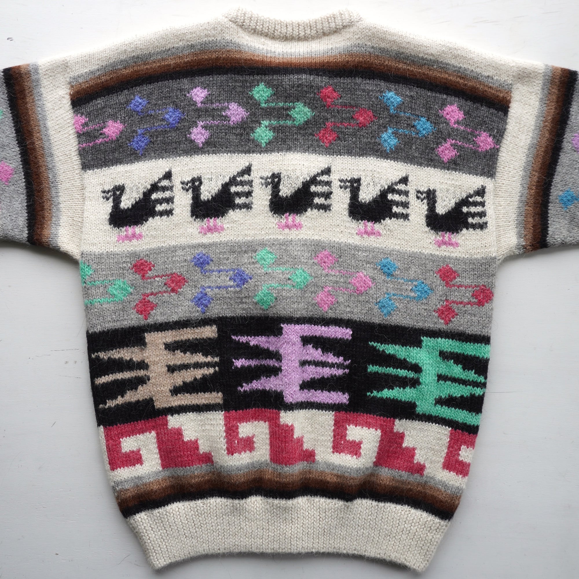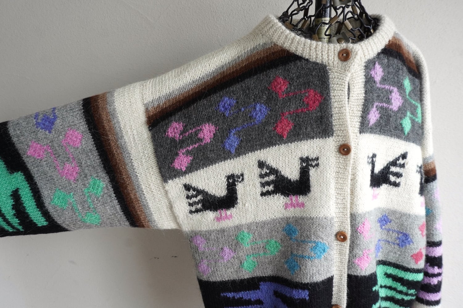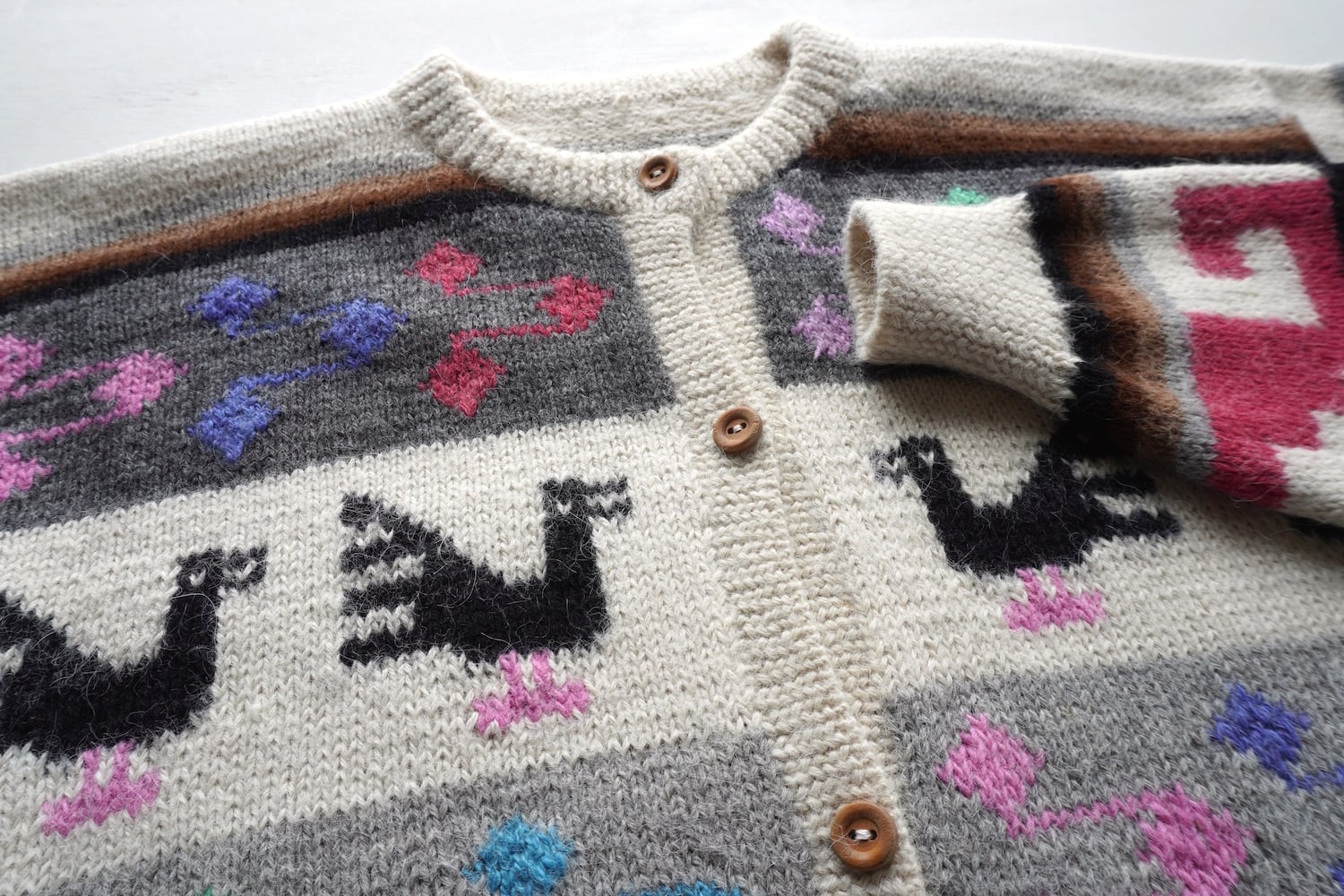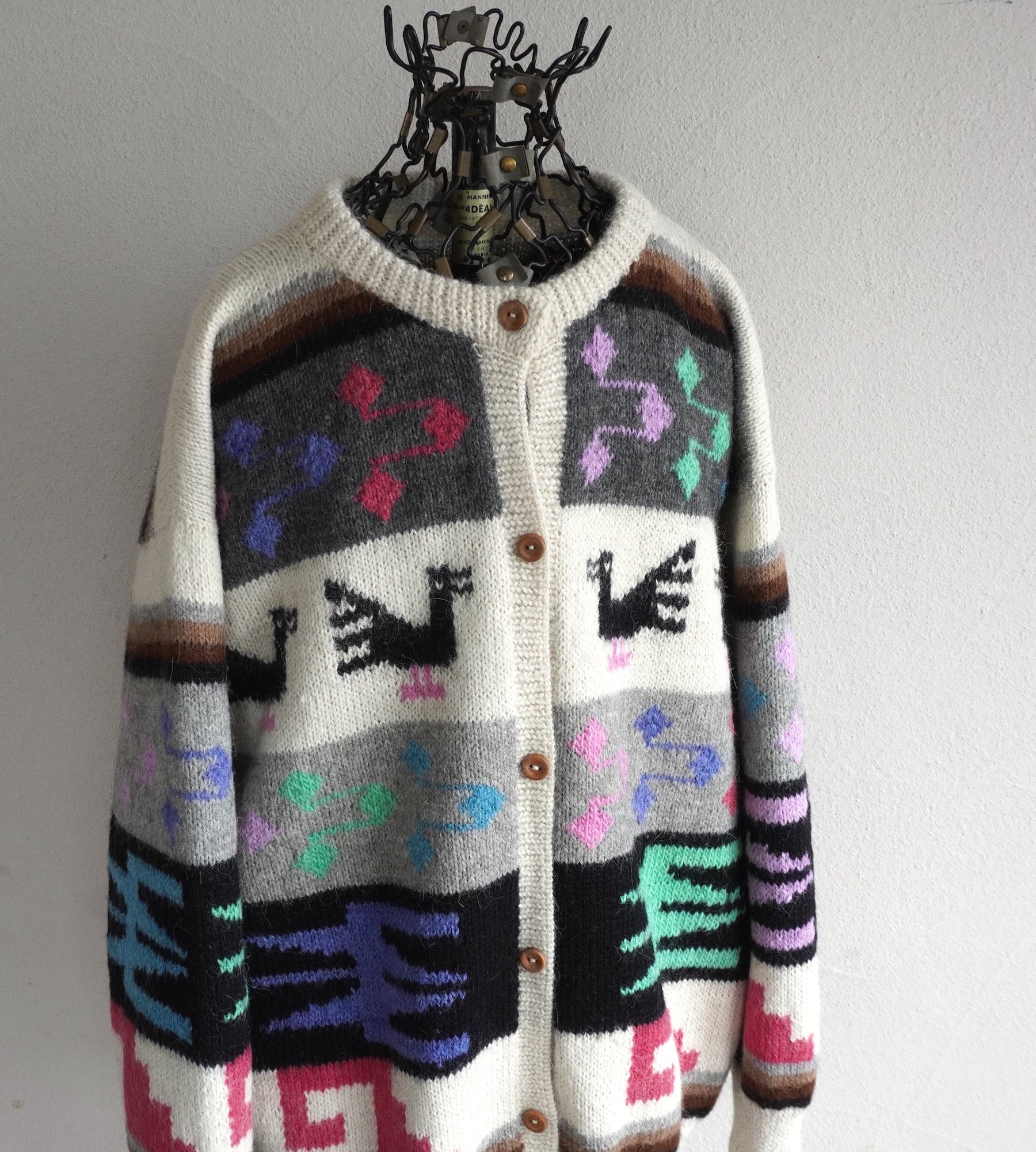 1990's ペルビアンハンドニットカーディガン アルパカ 幾何学柄 オフホワイト×マルチ 実寸(women's L〜XL程度) オーバーサイズ ゆったり ナスカ インカ PERU ペルー ヴィンテージ | MAGNOLIA WEBSTORE