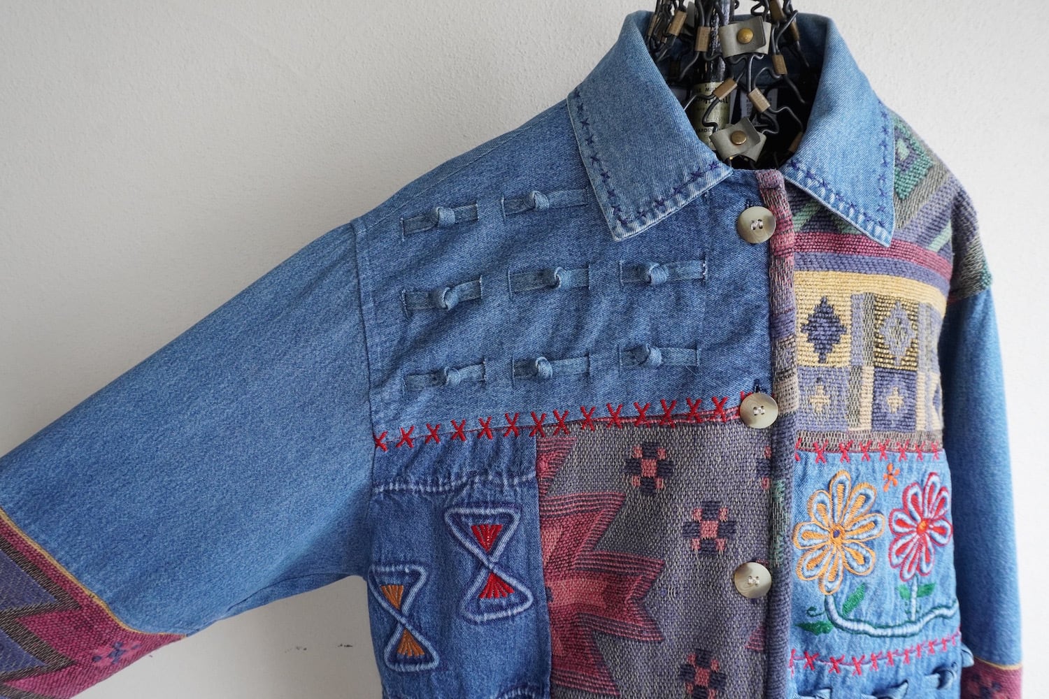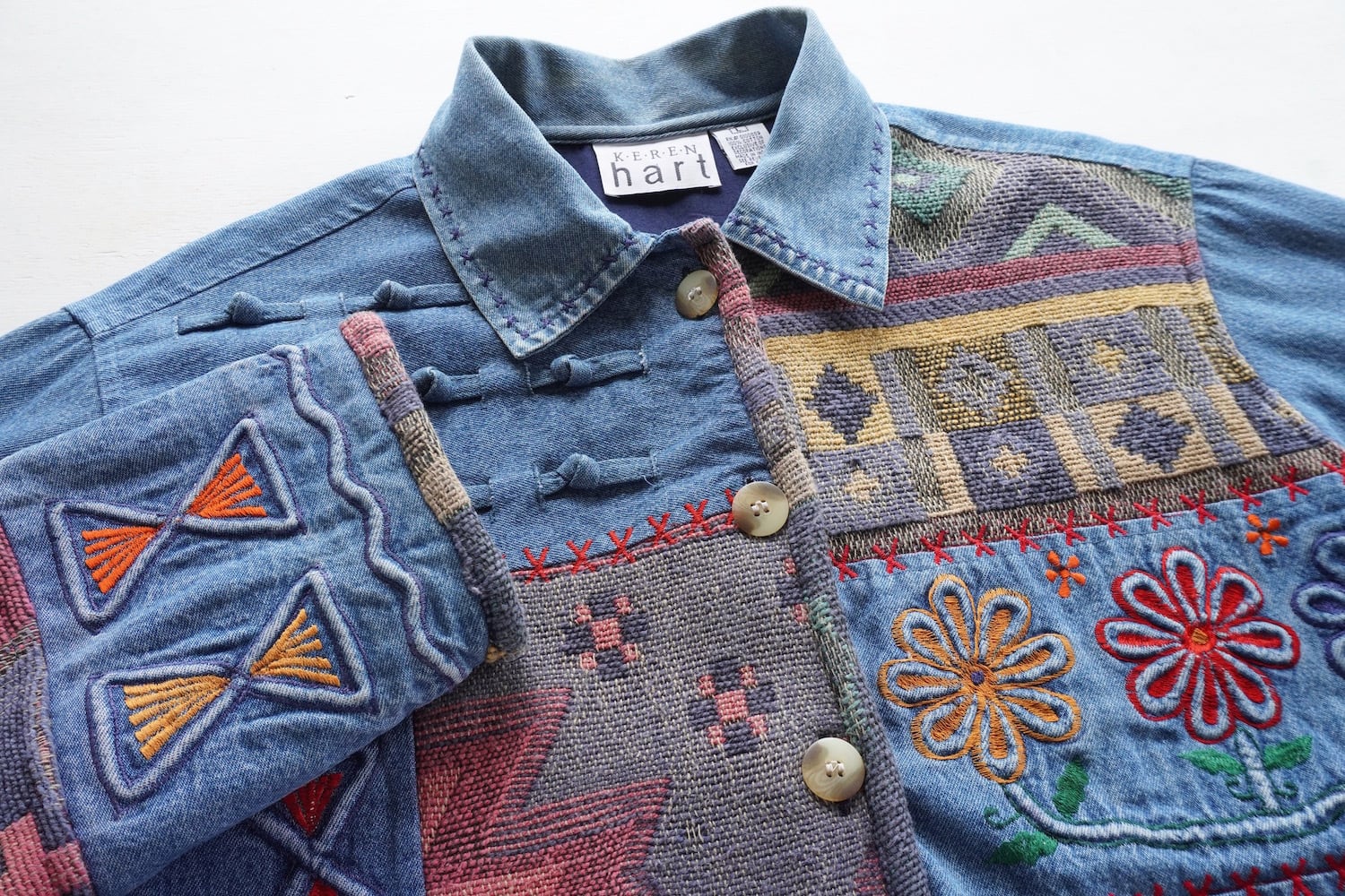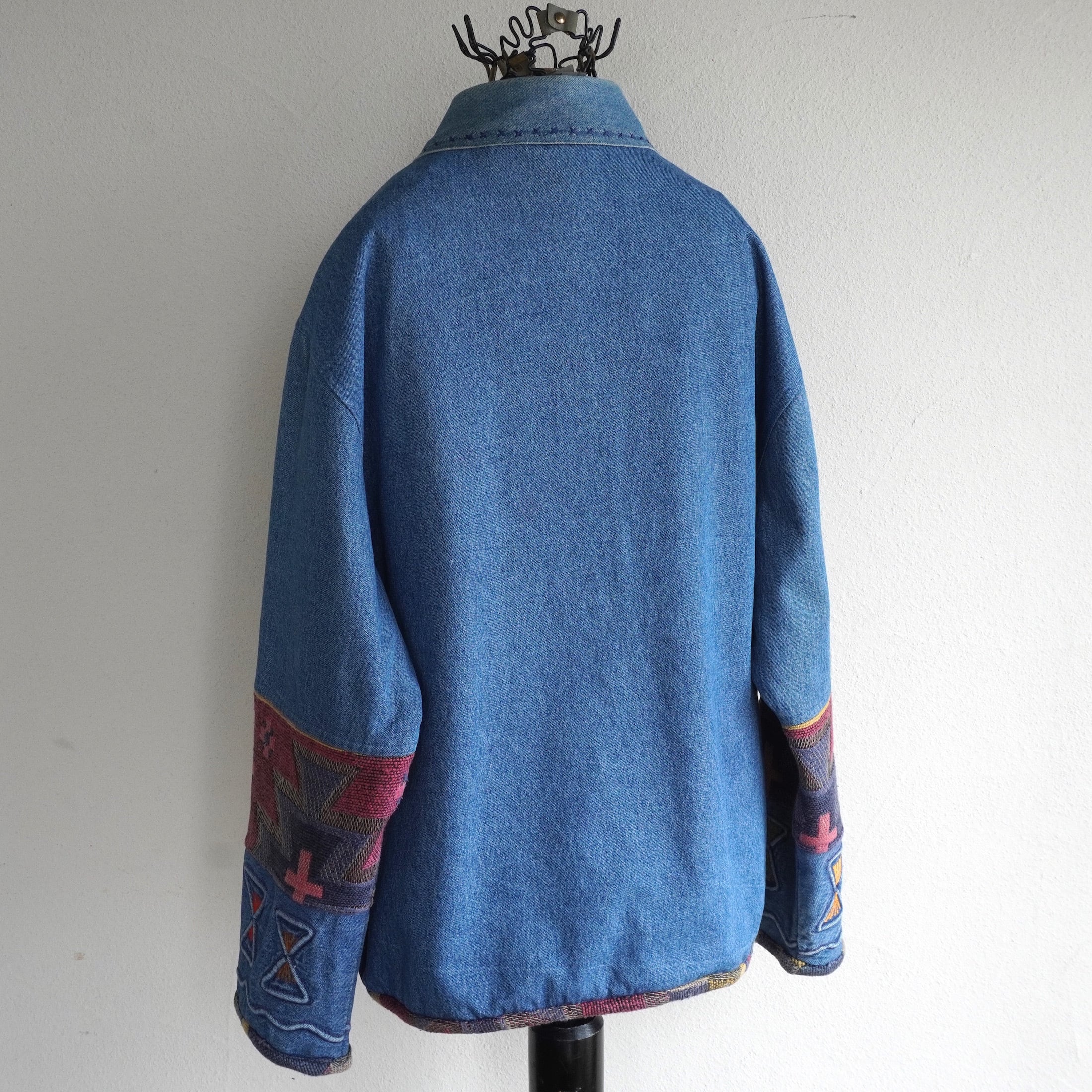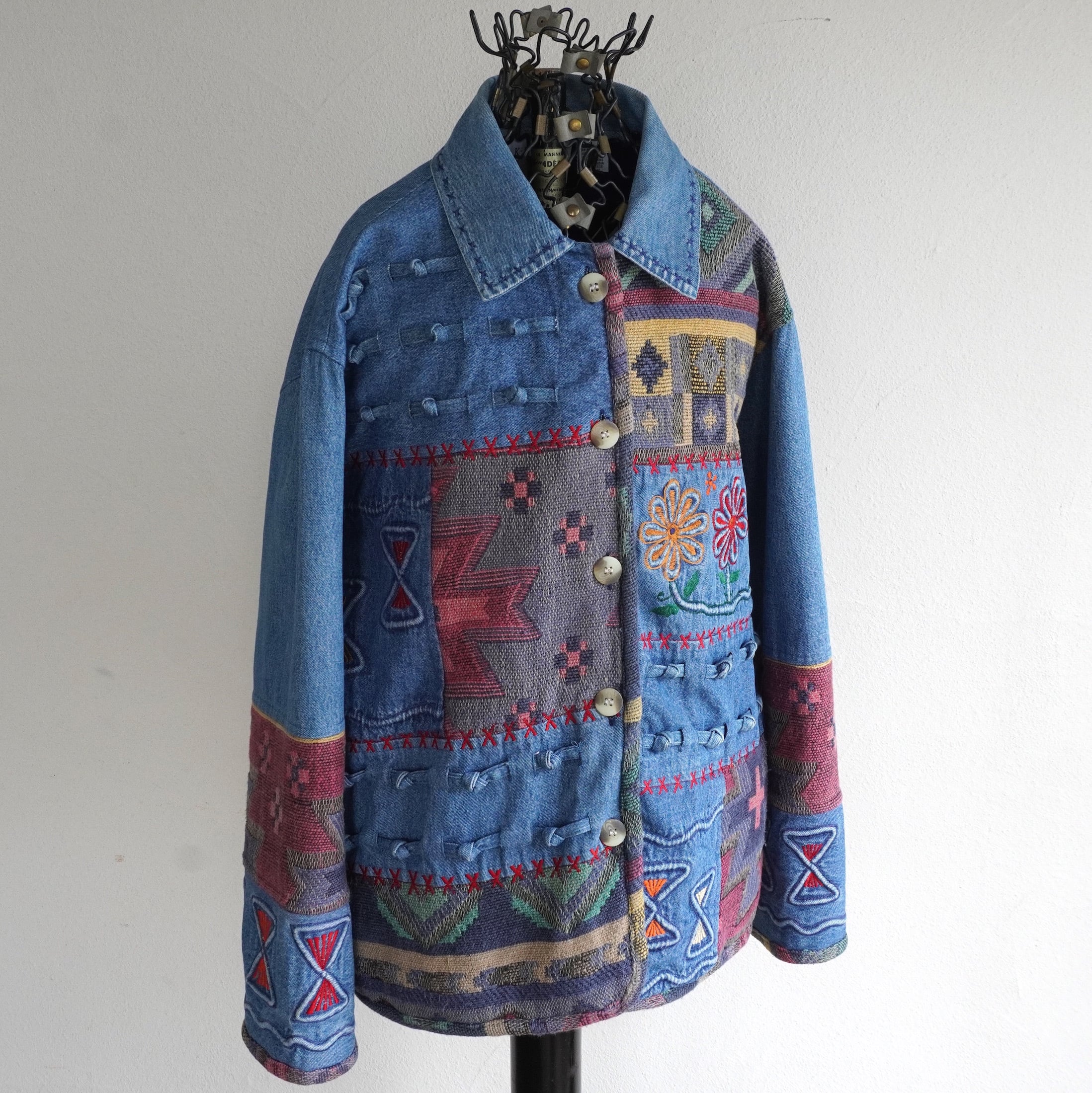 1990's [KEREN hart] デニム×ラグ 切り替え デザインジャケット ブルー 表記(women's L) エンブロイダリー 刺繍 パッチワーク ヴィンテージ | MAGNOLIA WEBSTORE
