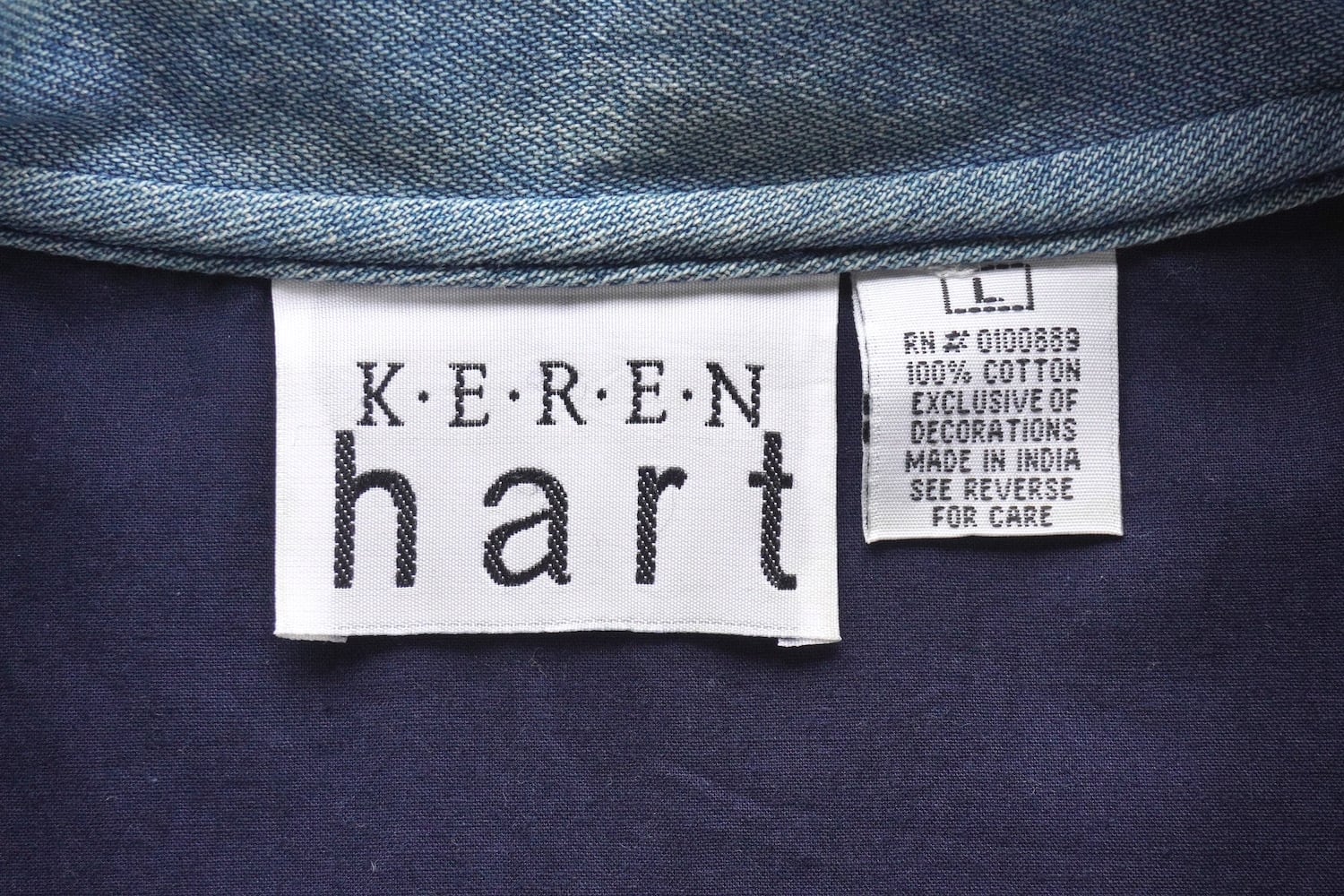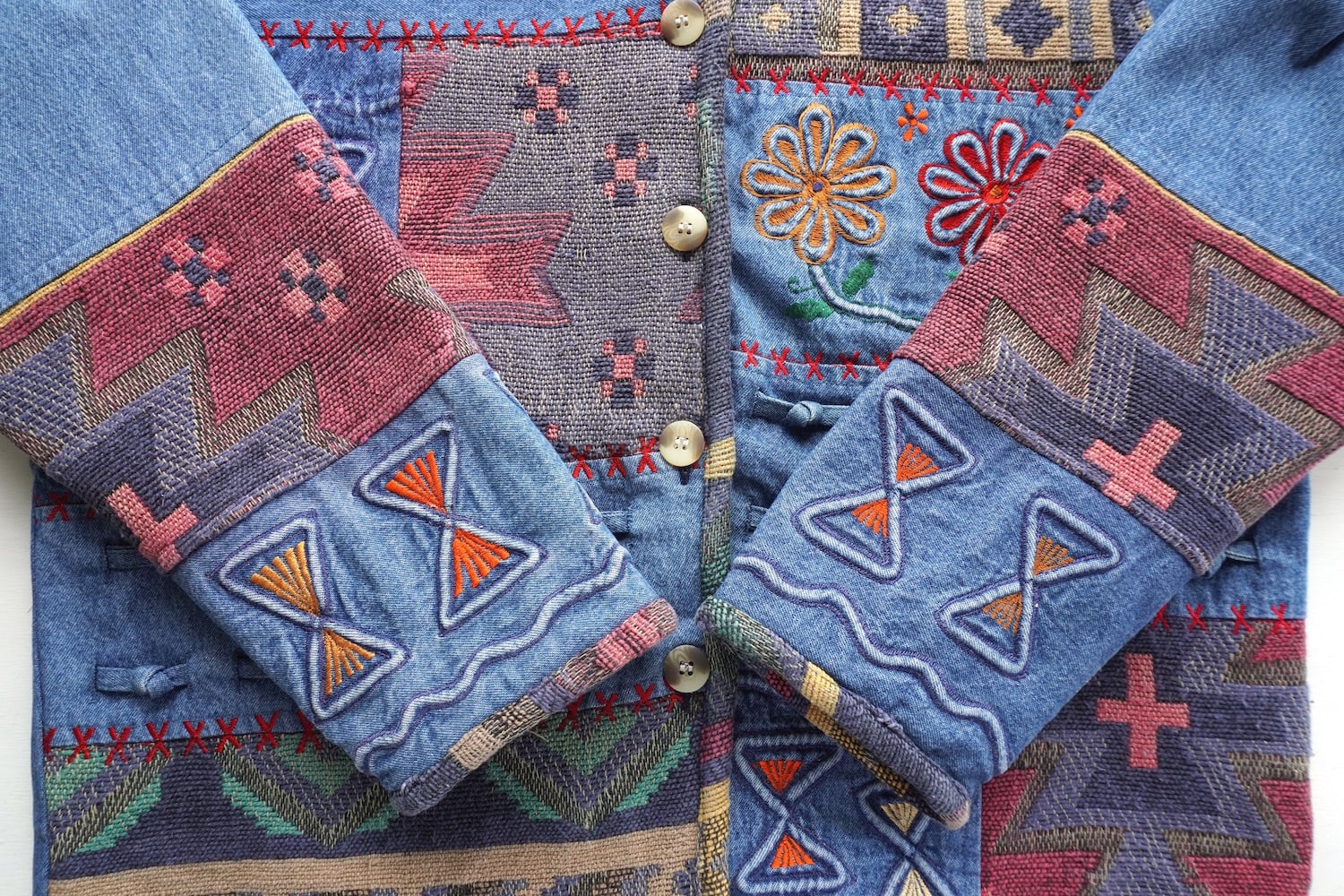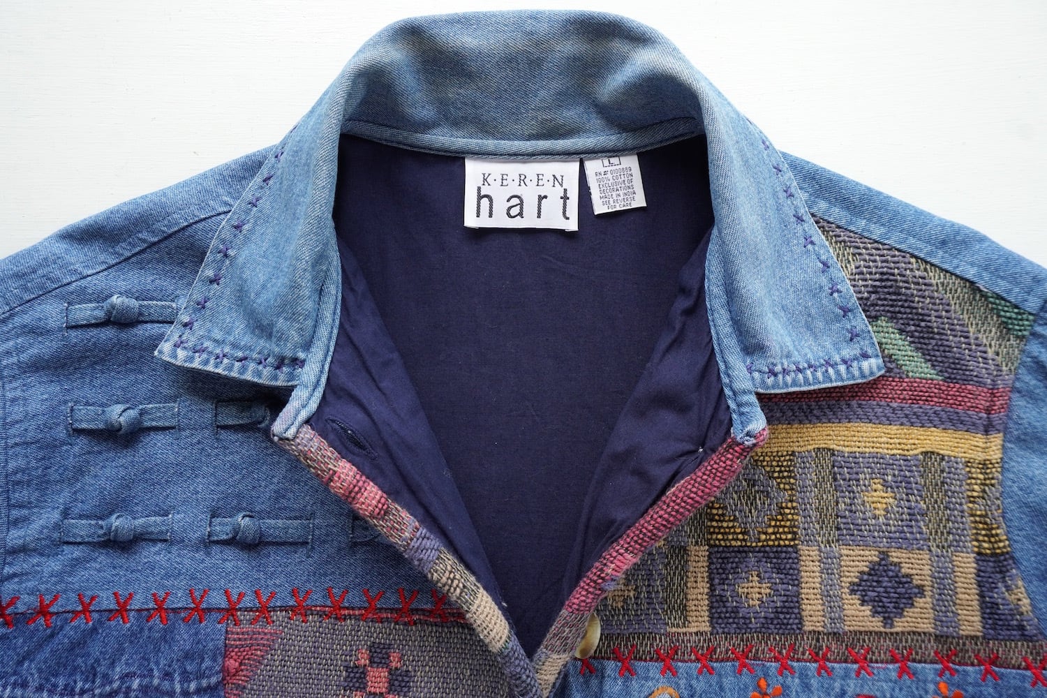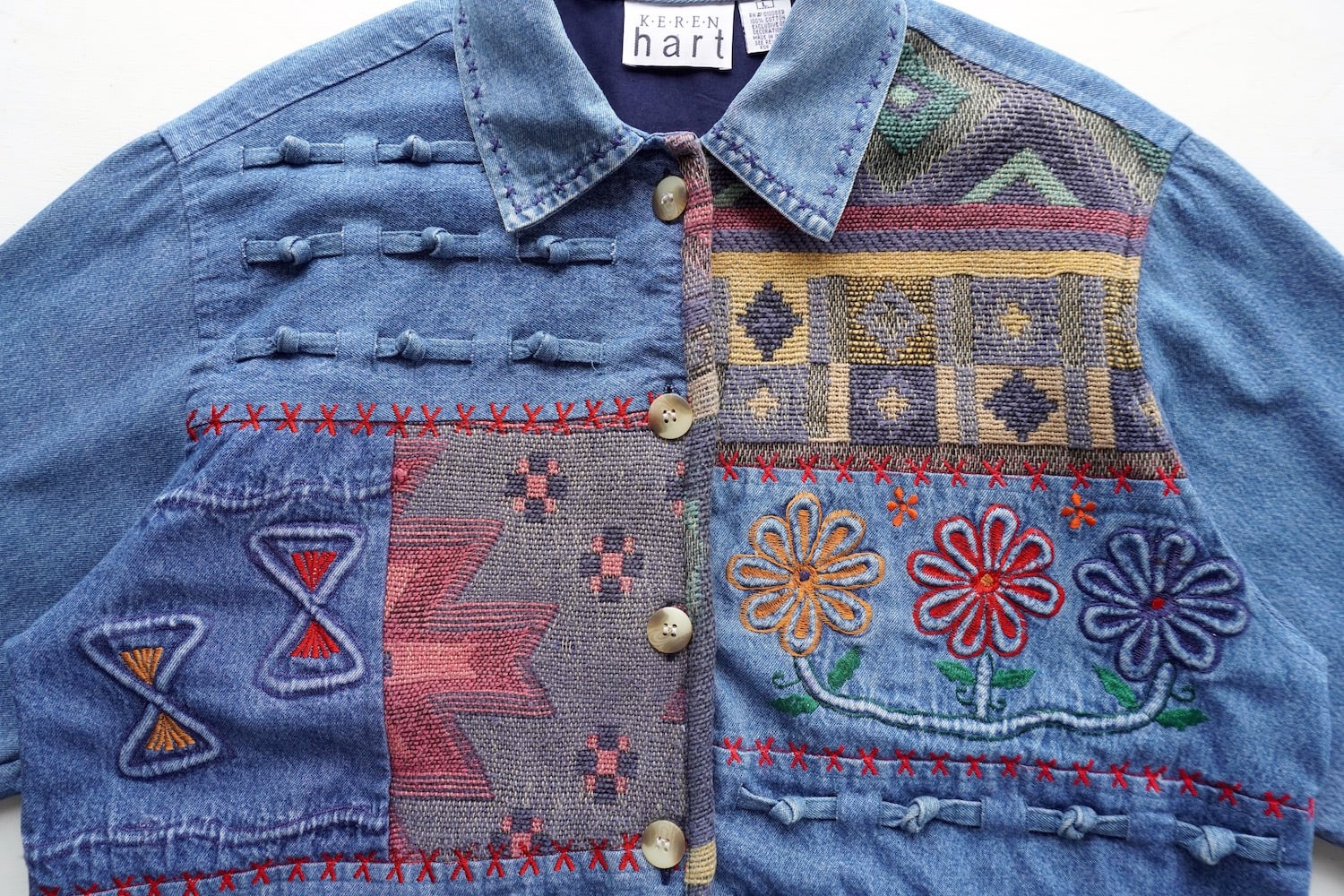 1990's [KEREN hart] デニム×ラグ 切り替え デザインジャケット ブルー 表記(women's L) エンブロイダリー 刺繍 パッチワーク ヴィンテージ | MAGNOLIA WEBSTORE