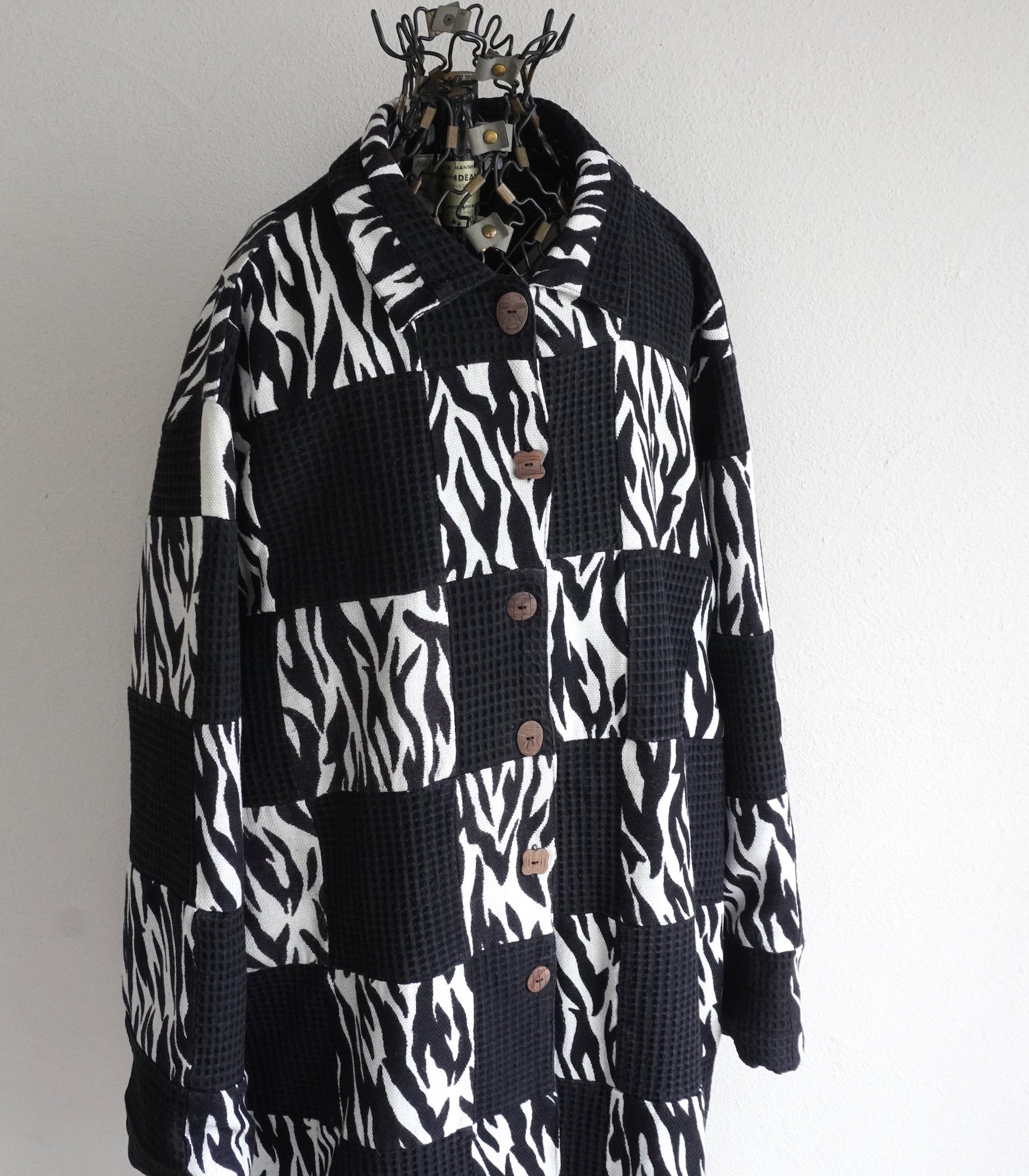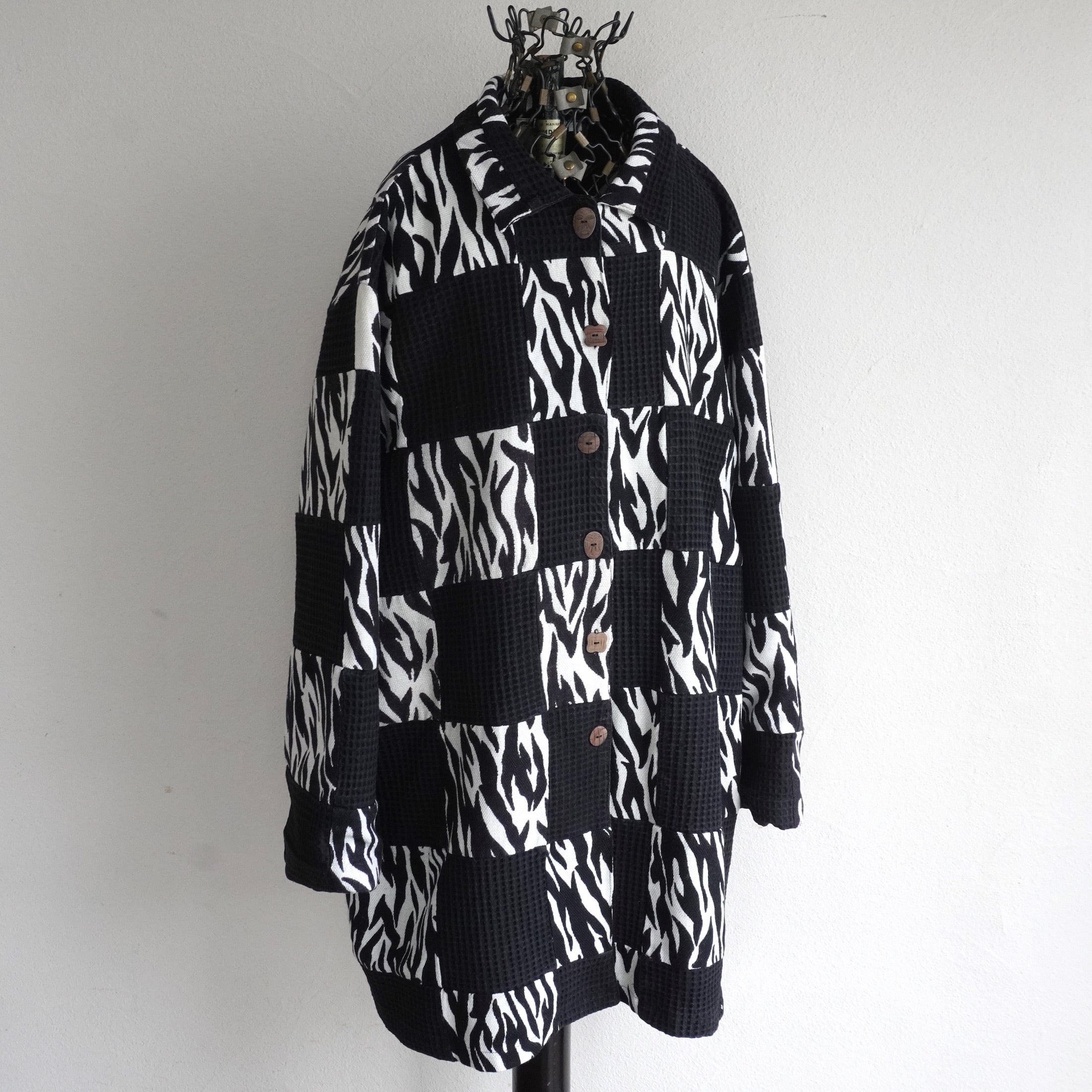 1990's〜2000's [ASIAN CREATIONS] ゼブラ×ワッフル パッチワークジャケット ブラック×ホワイト 表記(women's XL) セミロング モノトーン アニマル柄 ヴィンテージ | MAGNOLIA WEBSTORE
