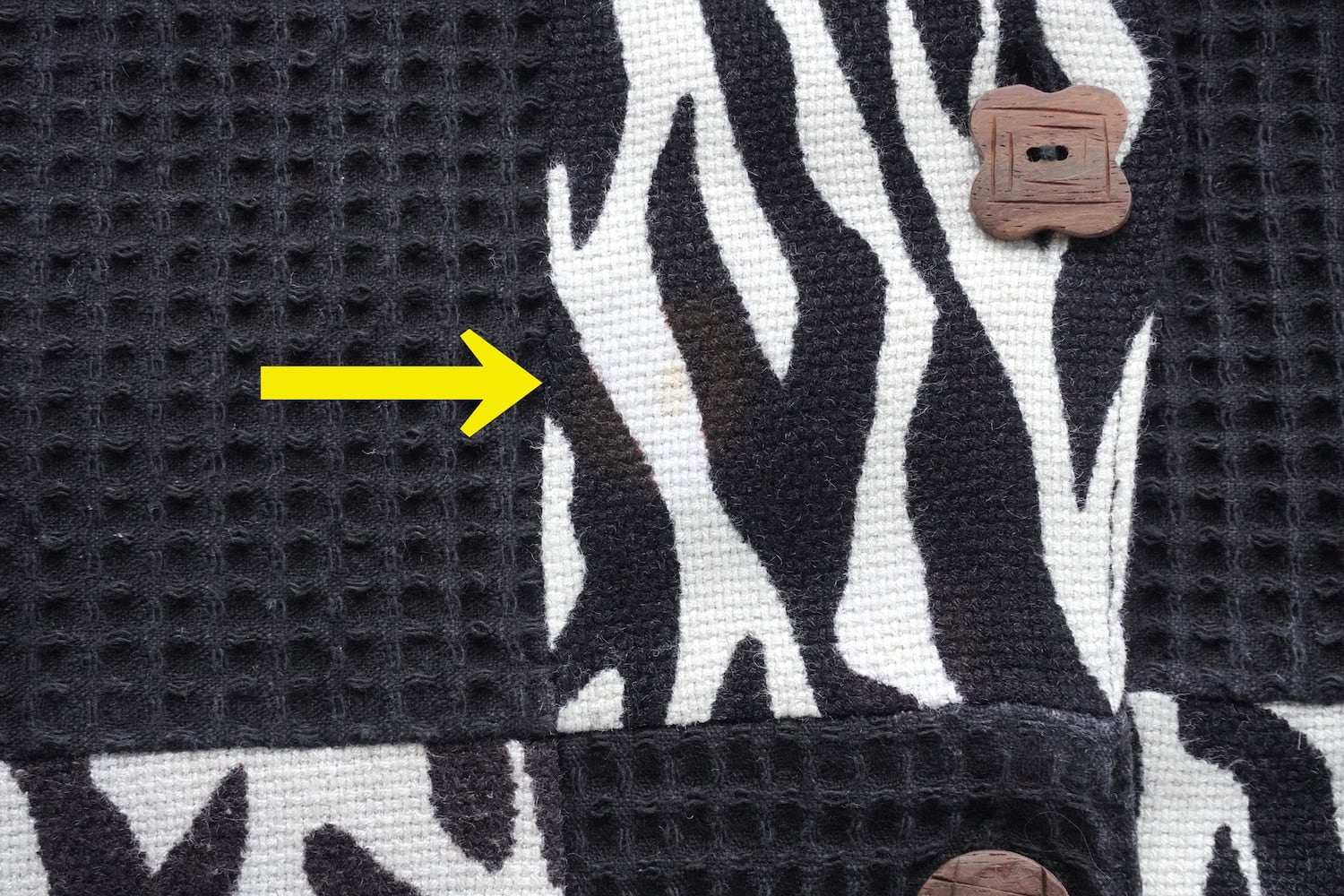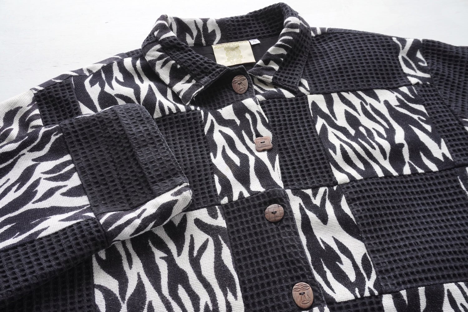 ゼブラ柄とブラックのワッフル地がパッチワークされた、デザインジャケット。