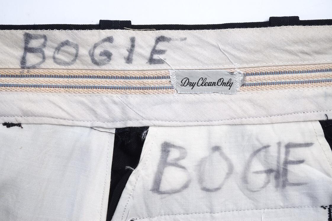 ダークネイビーにライトブルーのラインが映えるスラックス。