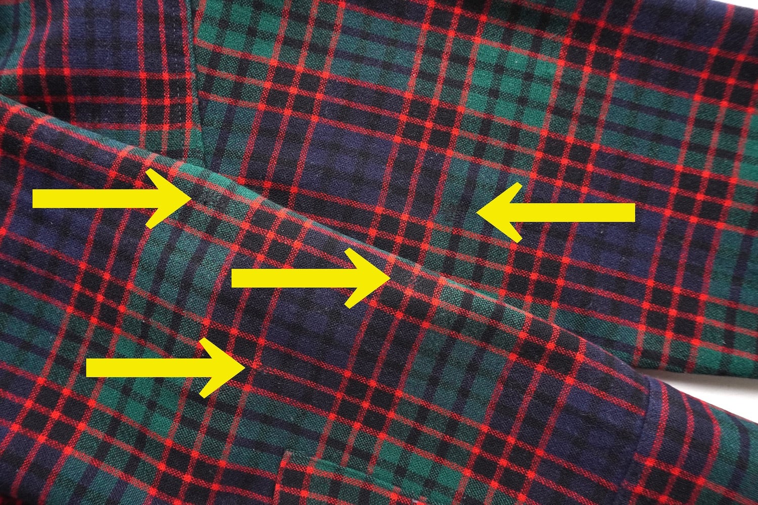 【コンディション】USED感・小穴リペア複数(※黄矢印参照)・襟内側スレーキにダメージ・右袖ボタン交換はありますが、その他大きなダメージはありません。