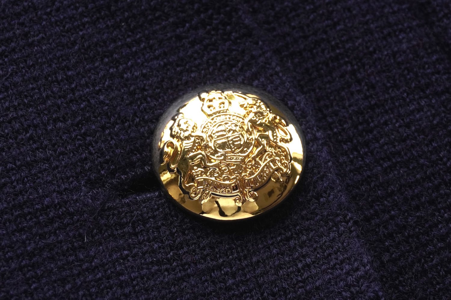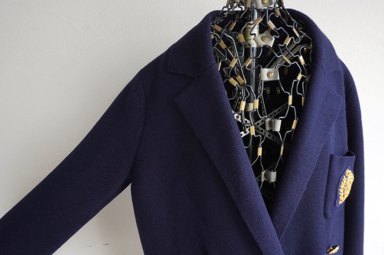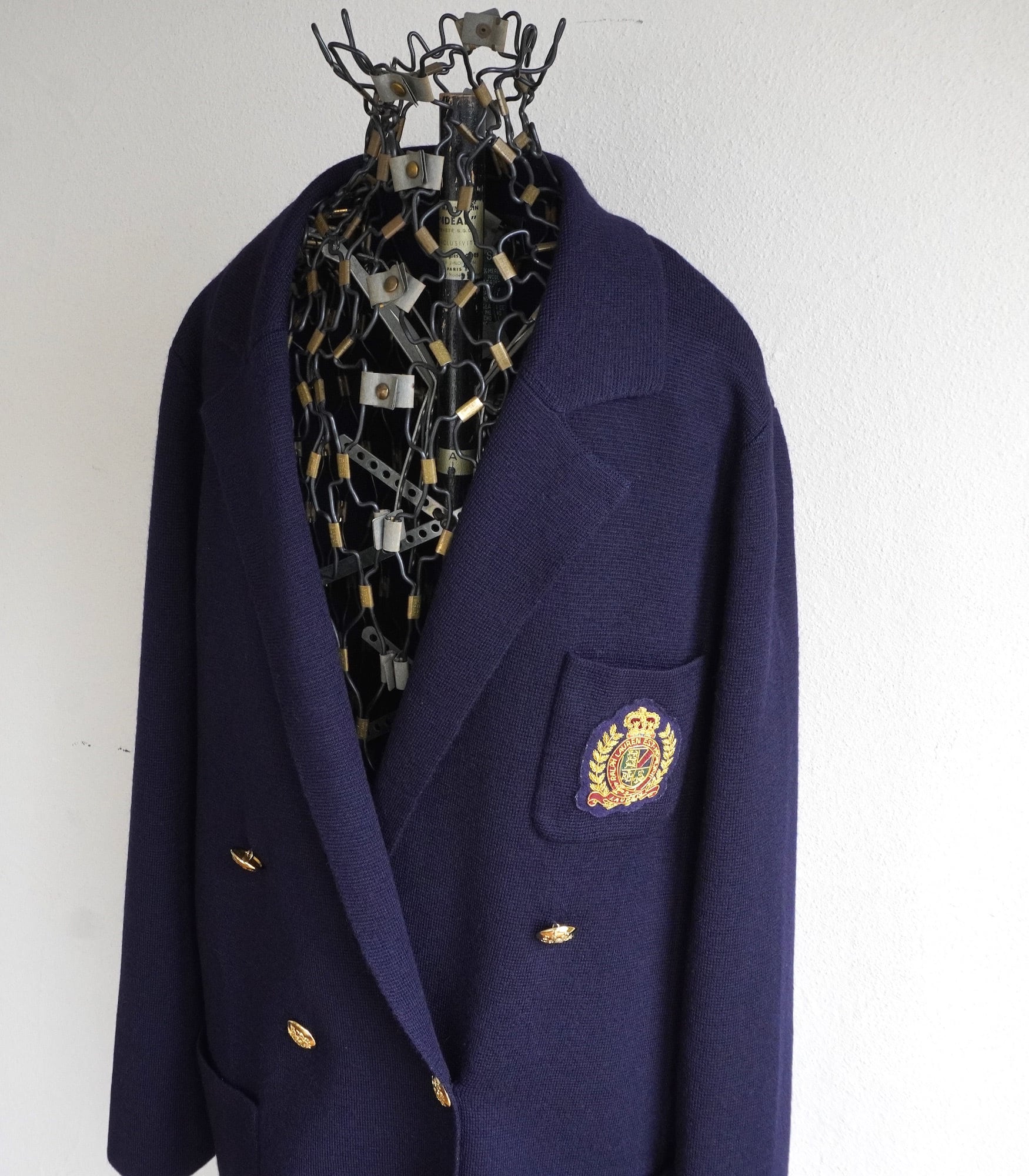 ブリオンクレストパッチとゴールドボタンが印象的な、ダブルブレストのニットブレザー。