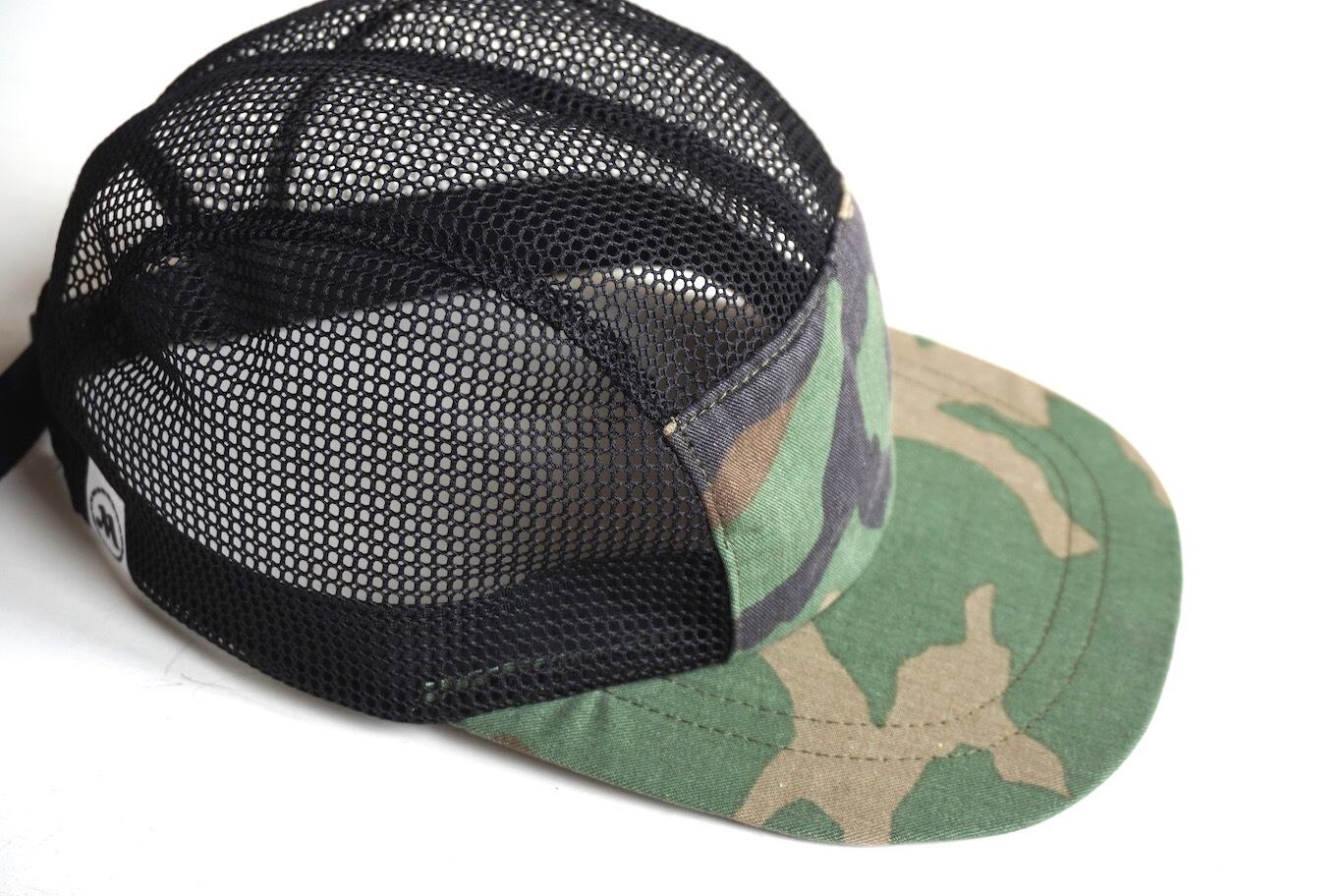 トップ&サイドにメッシュを使った、通気性の良い5パネルジェットキャップ。