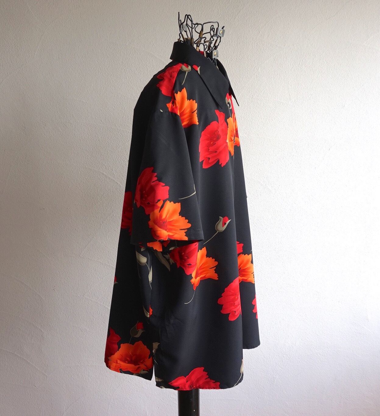 ブラックのボディに鮮やかな花柄が浮かぶ、S/Sポリエステルシャツ。