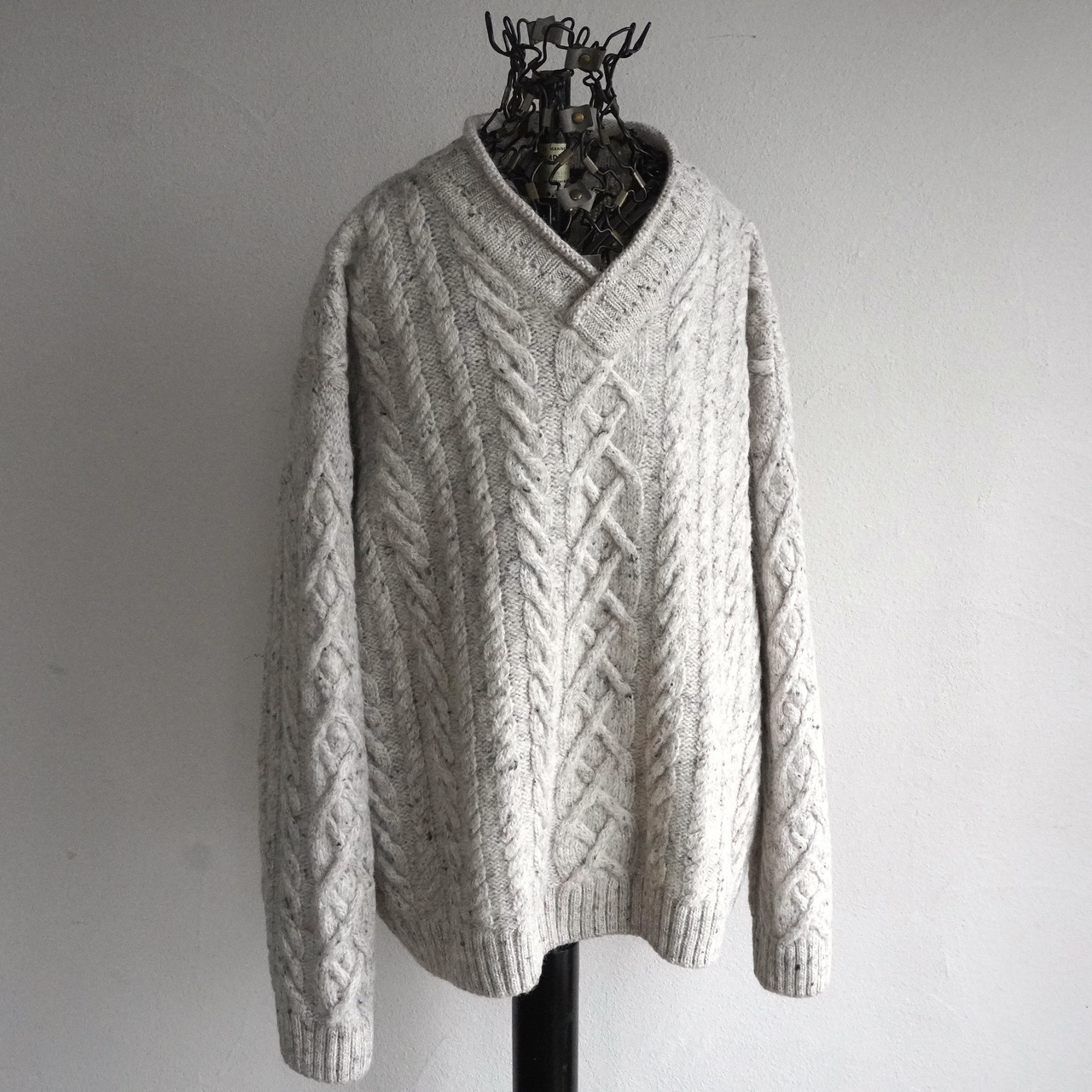 1990's〜 ENGLAND製 [Paul James] Vロールネック ケーブル模様 アランニットセーター ネップ オートミール 表記(men's XL) フィッシャーマンズセーター ヴィンテージ | MAGNOLIA WEBSTORE