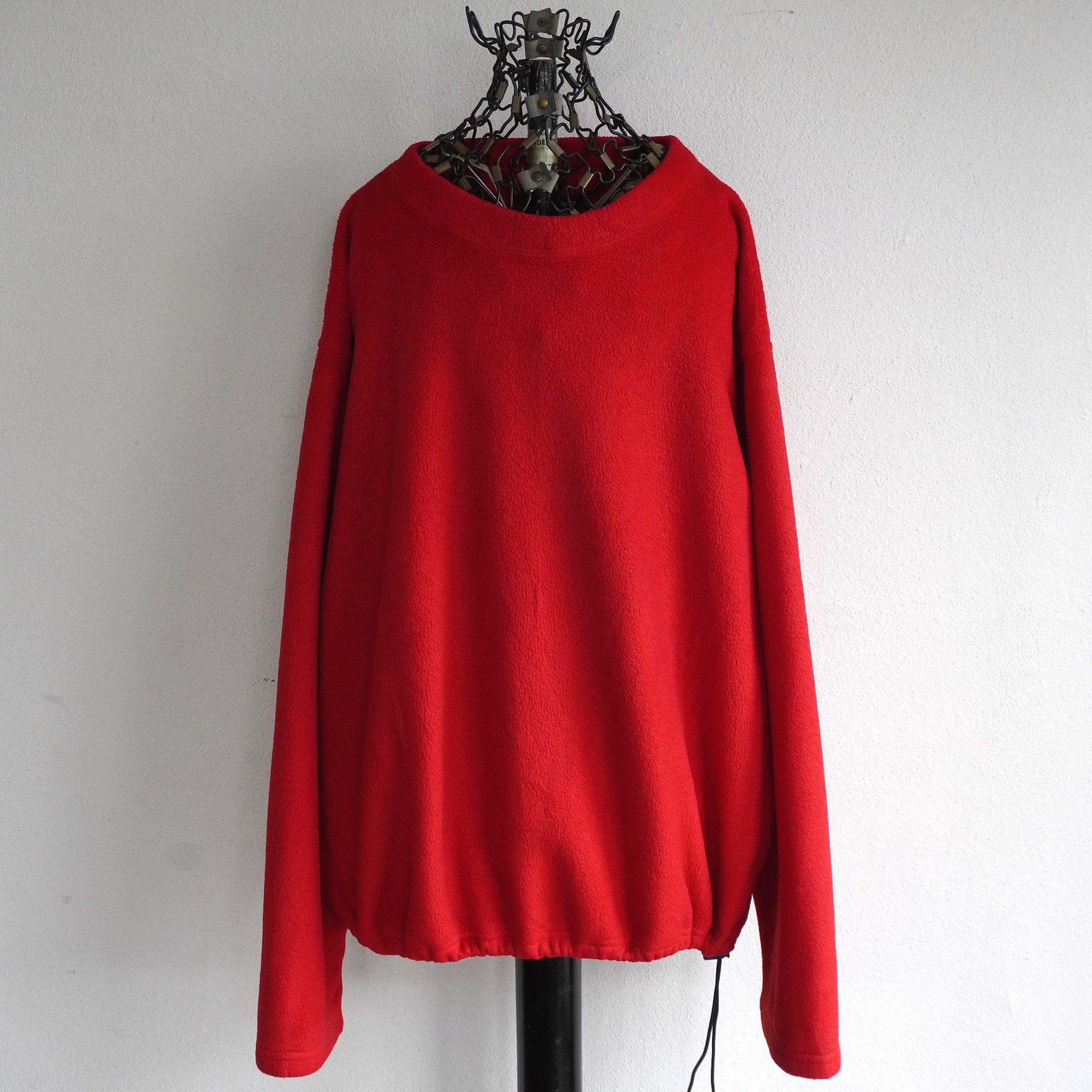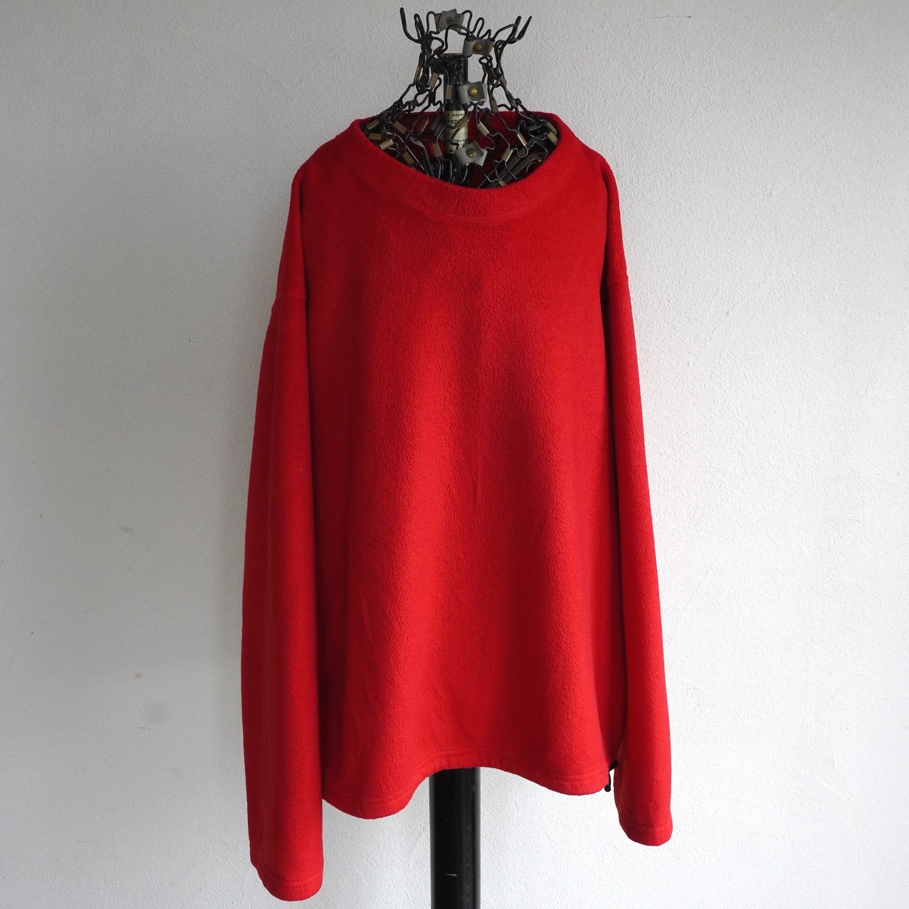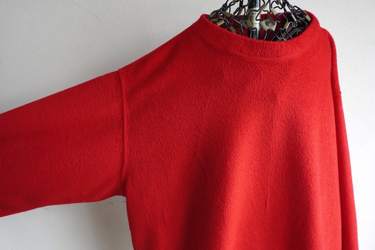 シンプル且つヴィヴィッドなレッドのクルーネックフリースプルオーバー。