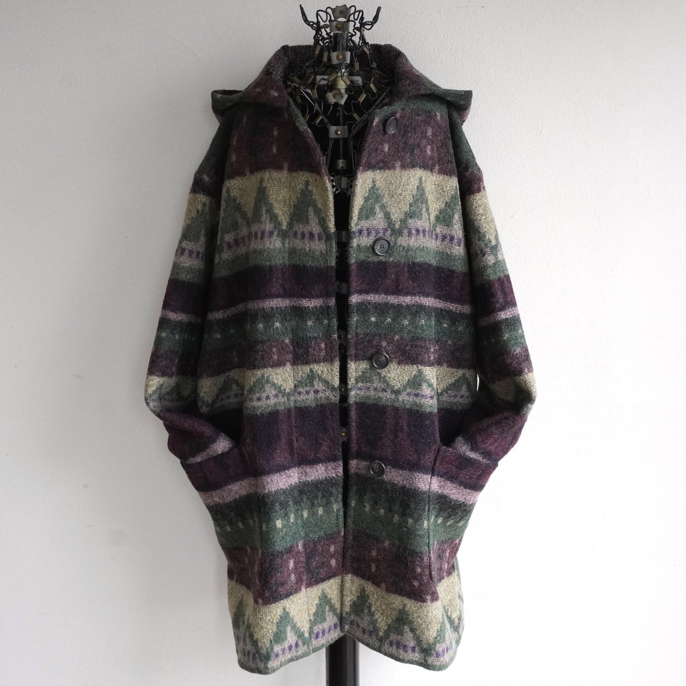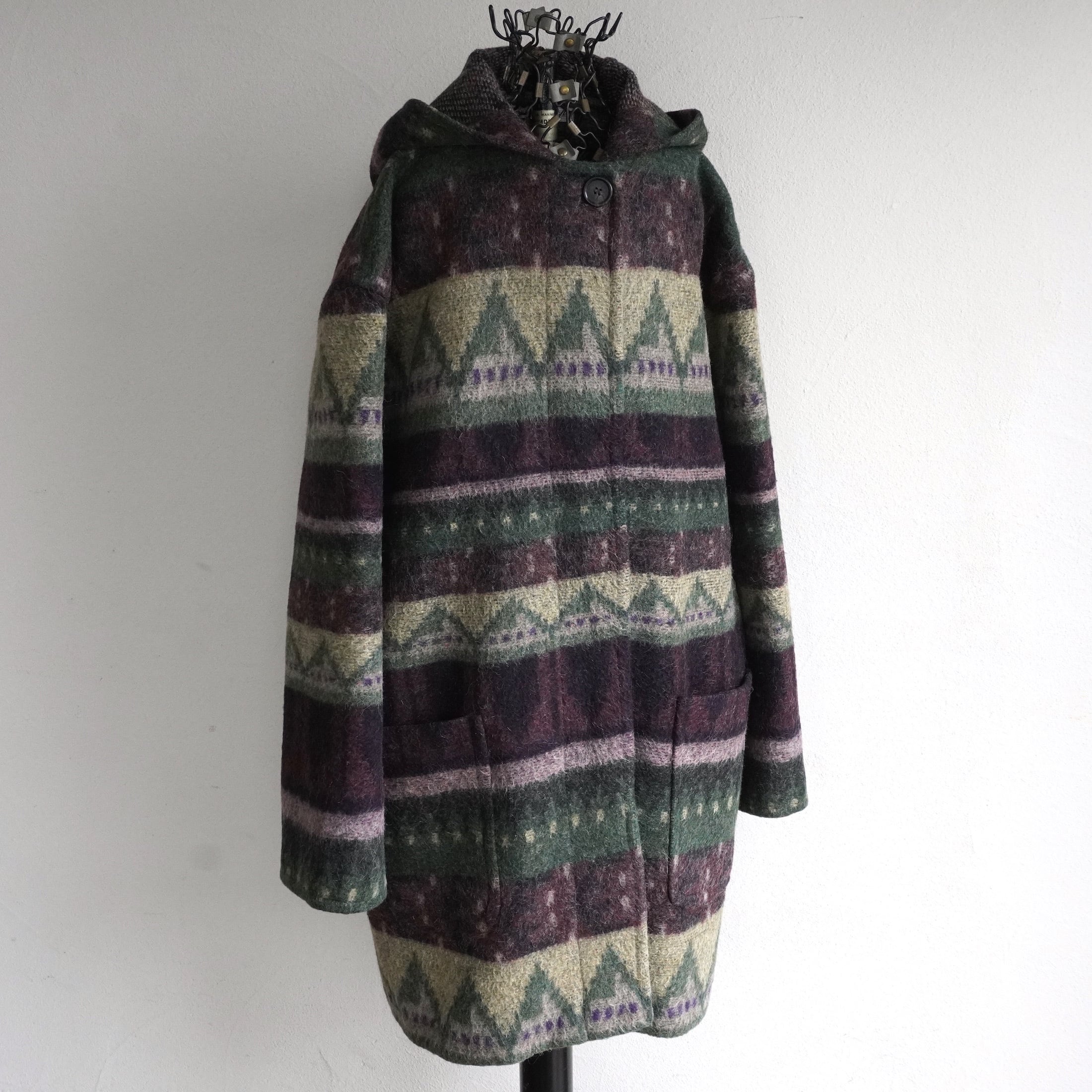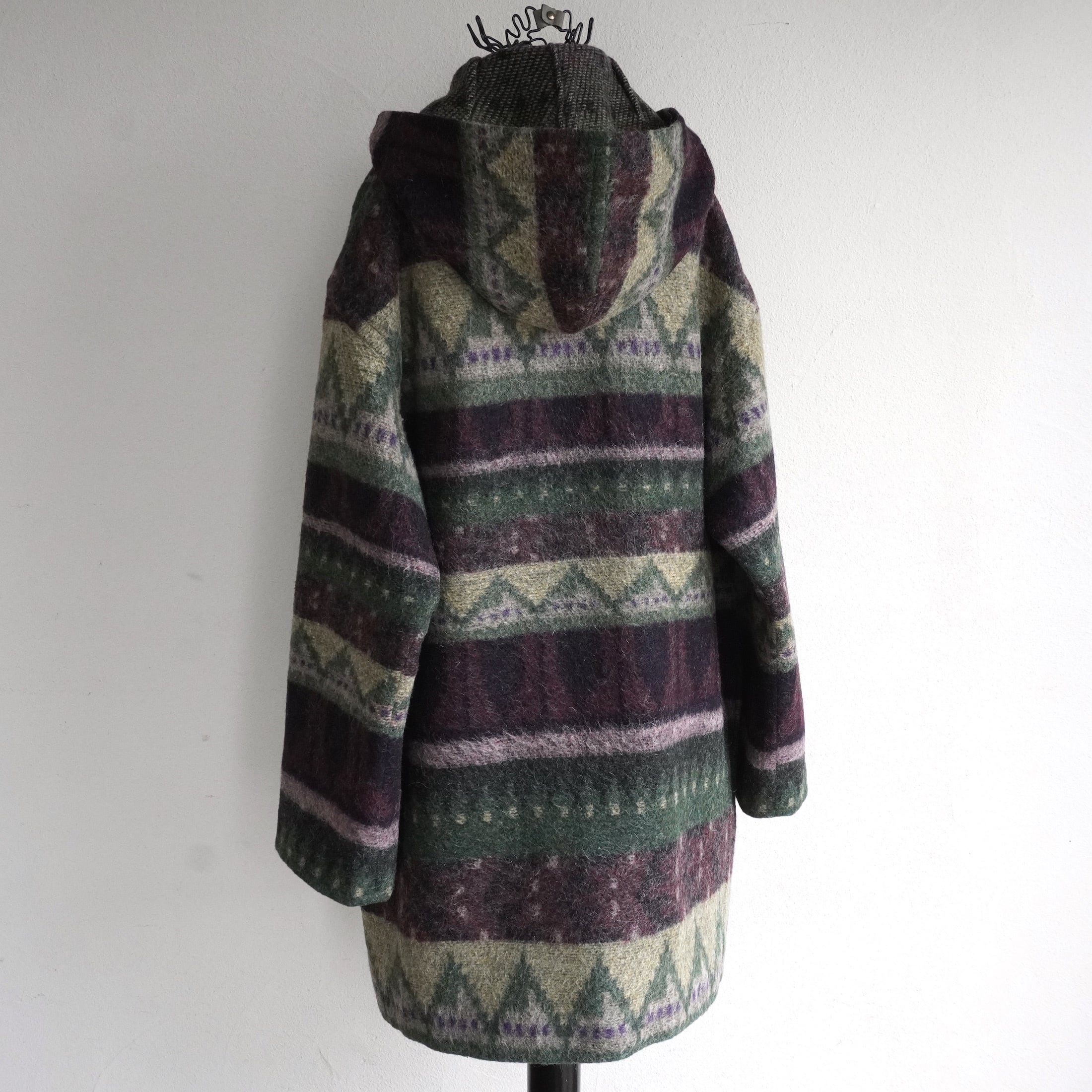 1990's USA製 [FAIRBROOKE] フェアアイル柄 ウールフーデッドコート パープル/サンド/モスグリーン系 実寸(women's XL程度) Saks Fifth Avenue ヴィンテージ | MAGNOLIA WEBSTORE