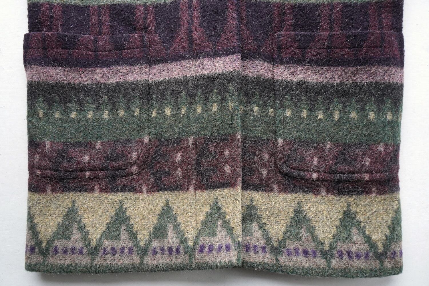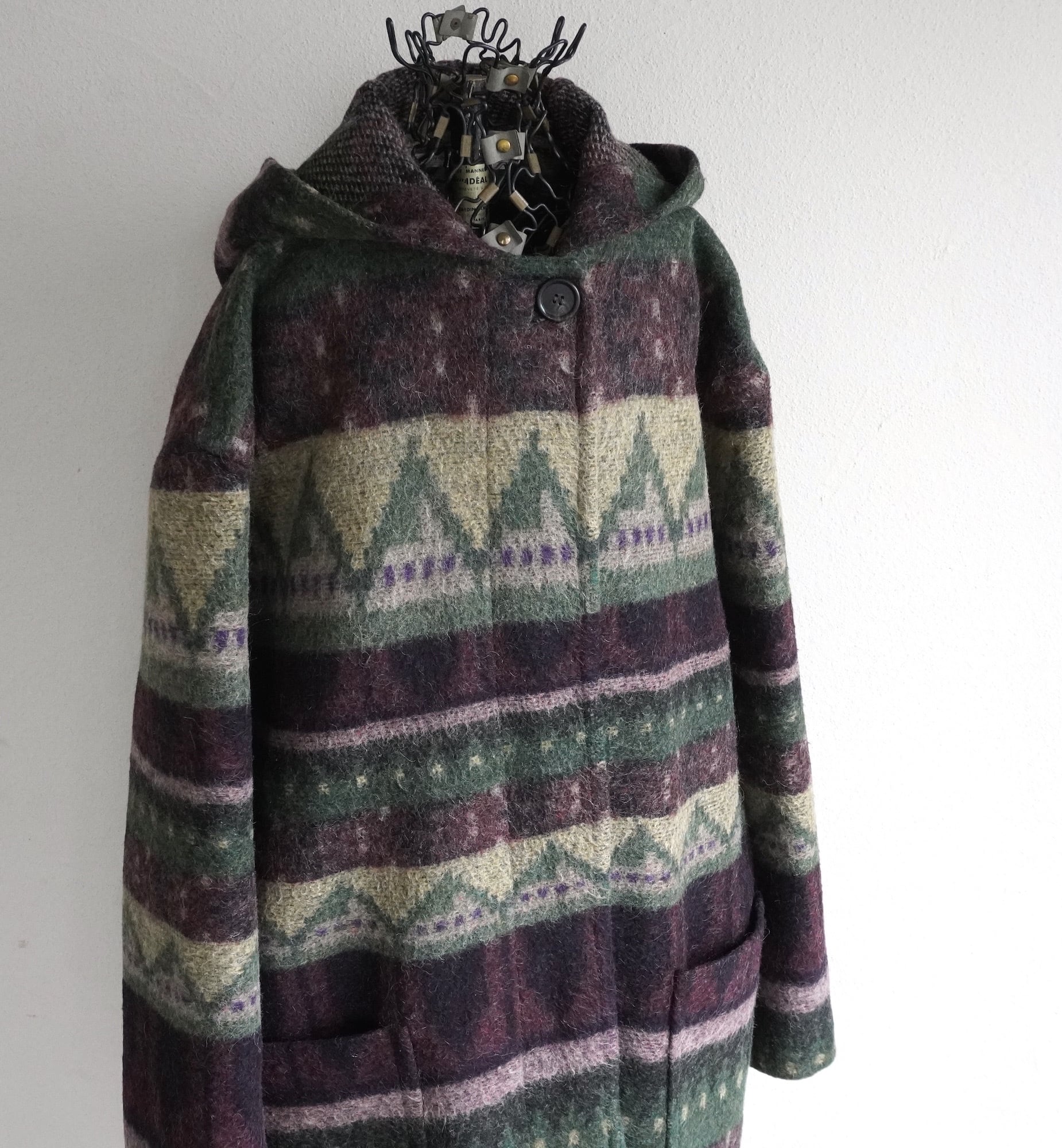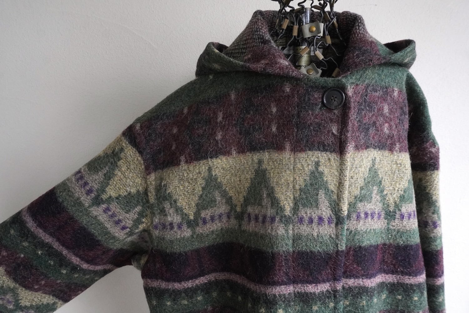 1990's USA製 [FAIRBROOKE] フェアアイル柄 ウールフーデッドコート パープル/サンド/モスグリーン系 実寸(women's XL程度) Saks Fifth Avenue ヴィンテージ | MAGNOLIA WEBSTORE