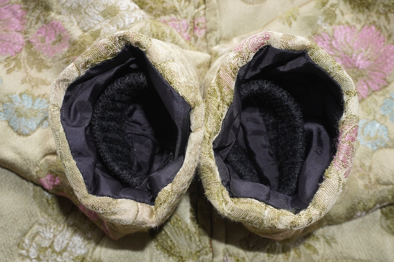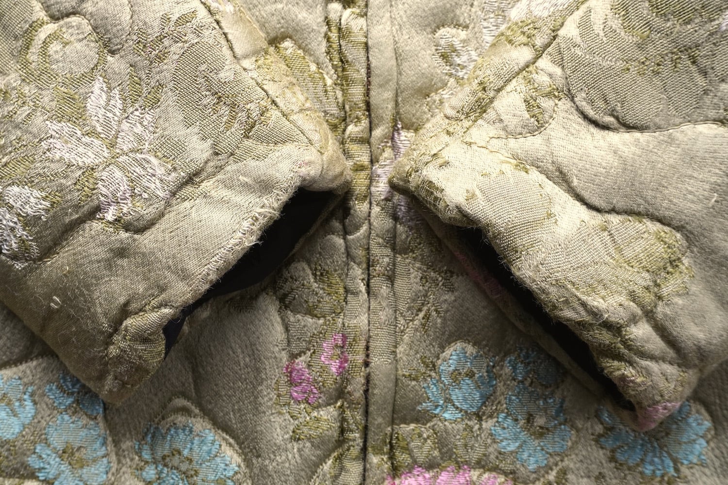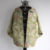ペールトーンの和柄なフローラル刺繍が美しい、サテンキルティングジャケット。