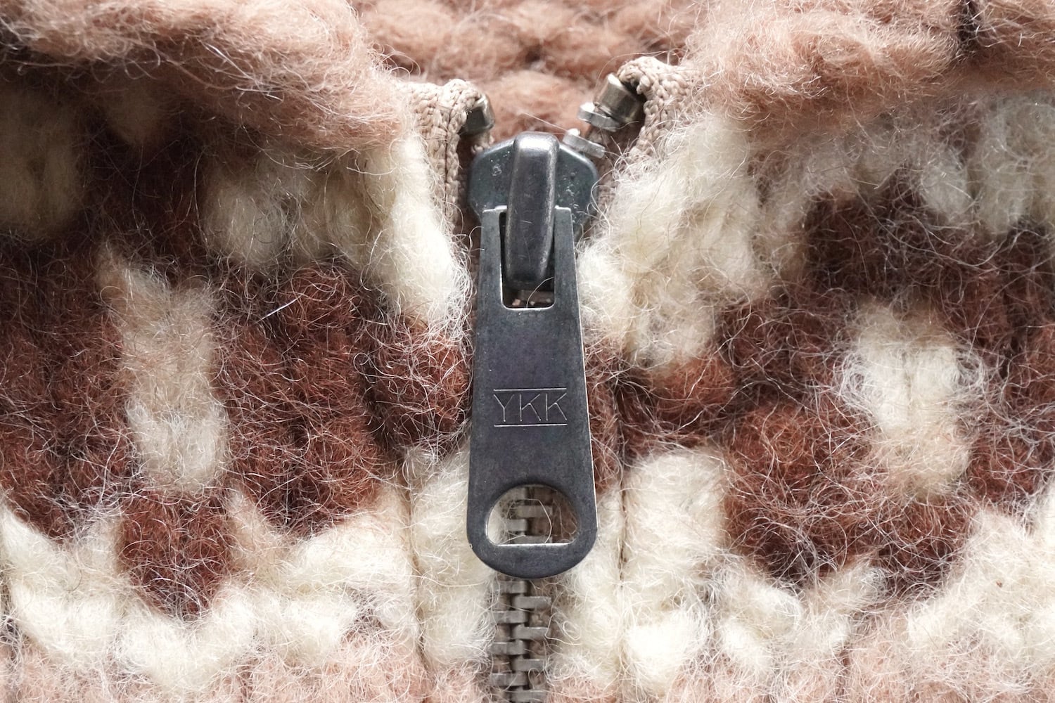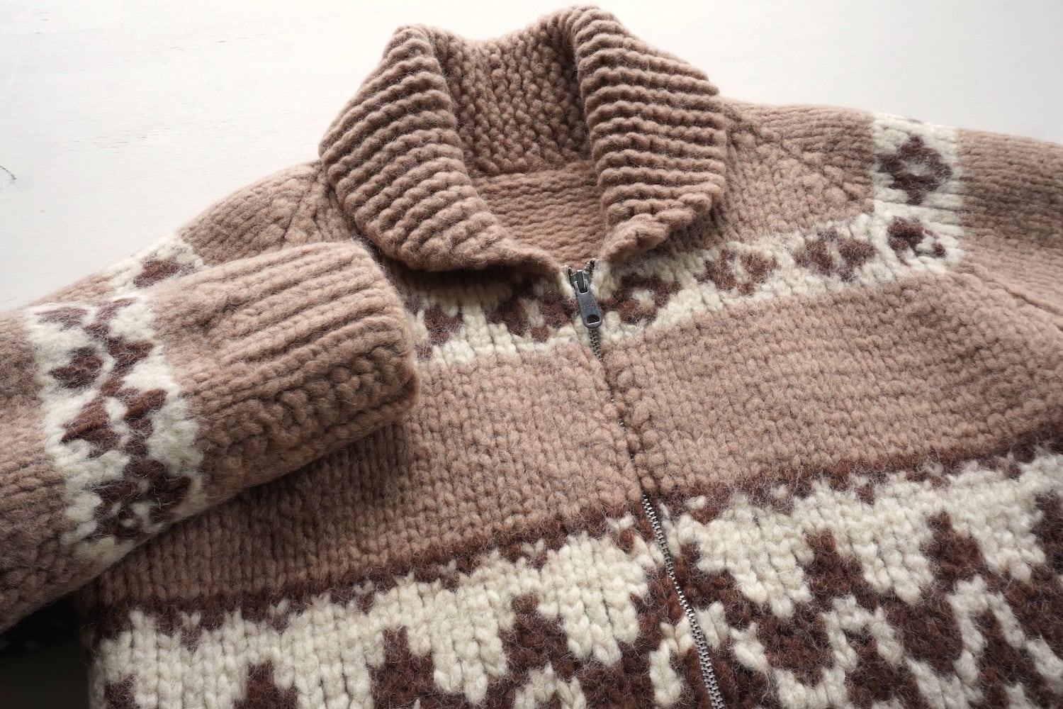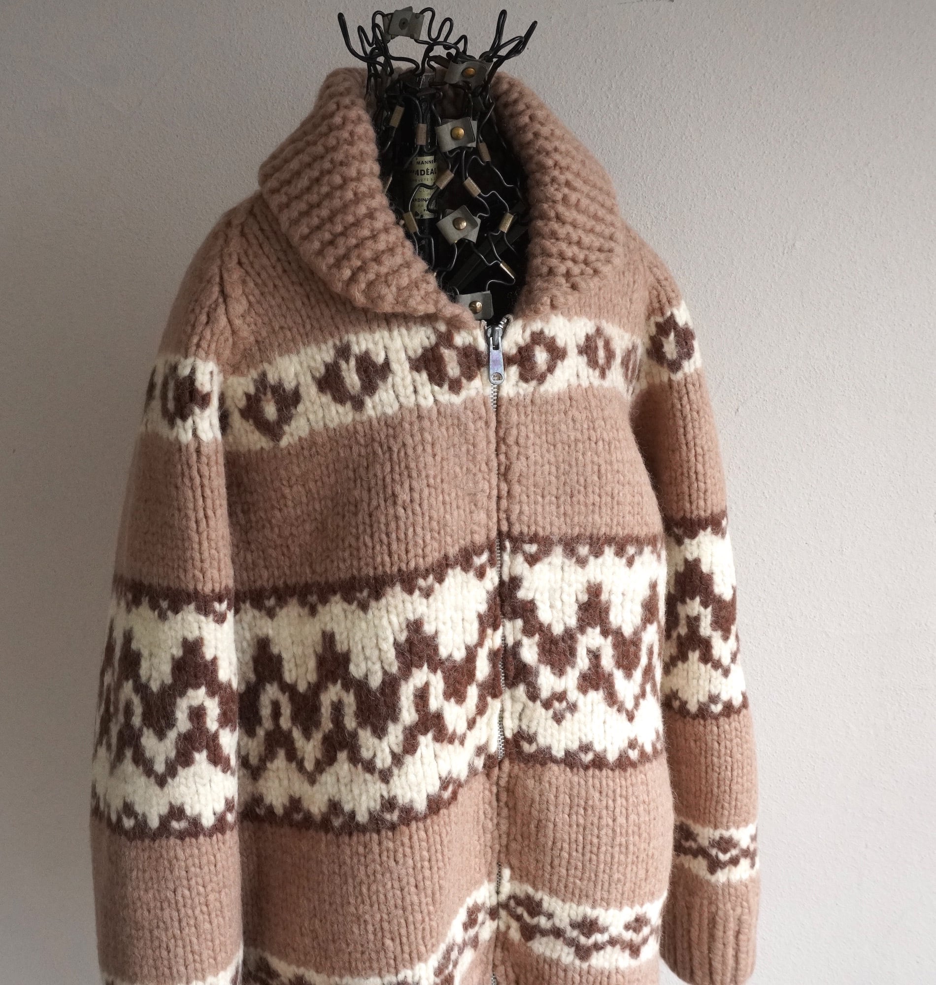 ハンドニット(手編み)で仕上げられた、ジグザグ&ダイヤ柄のカウチンセーター。