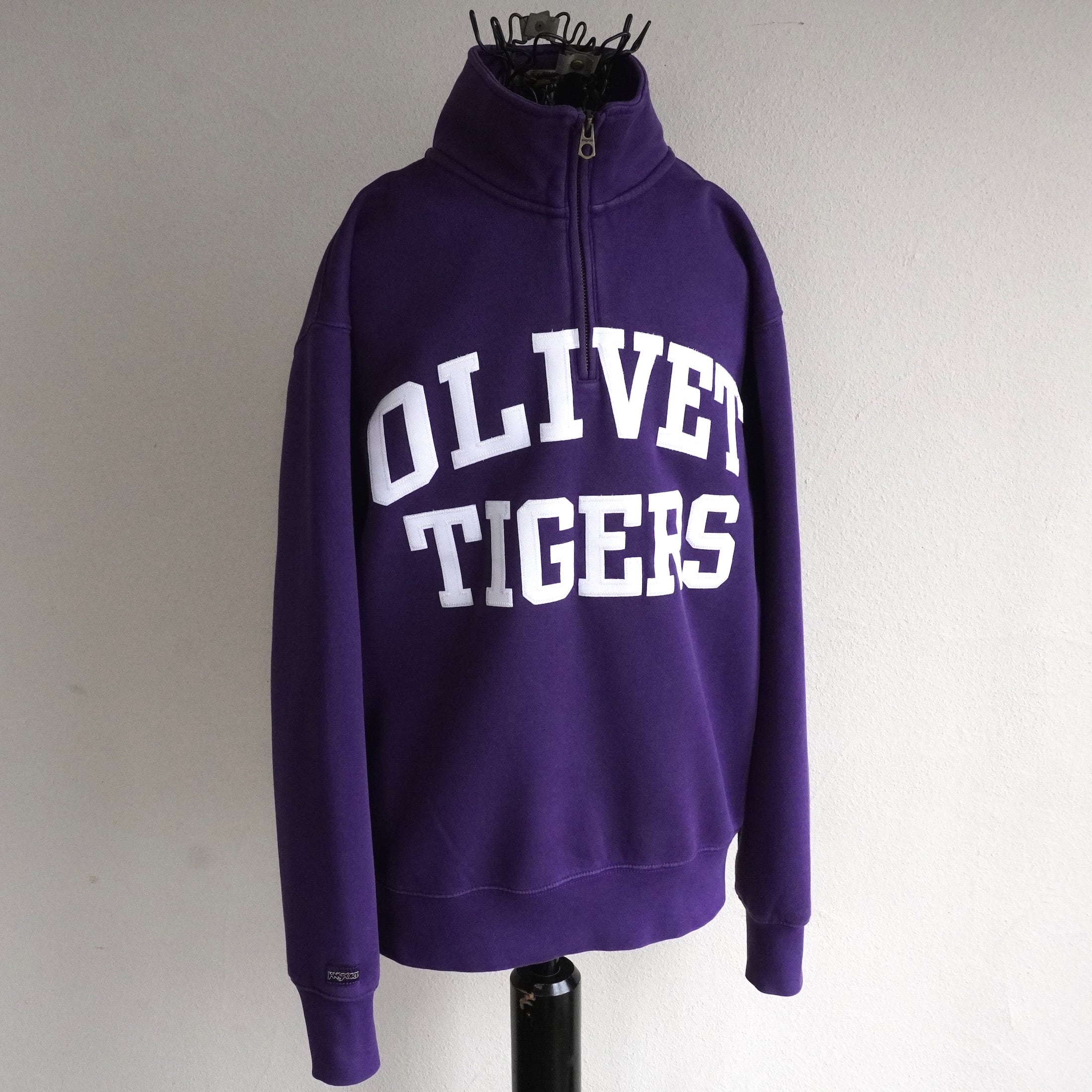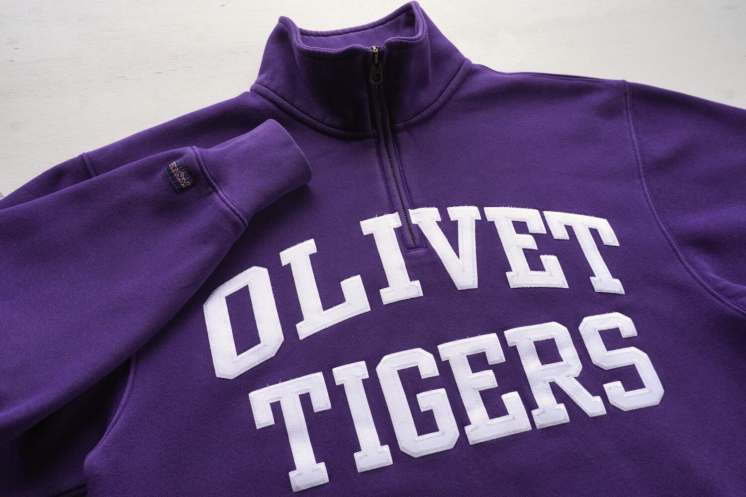 アメリカ・イリノイ州「オリヴェット・ナザレン大学」"OLIVET TIGERS"の、ハーフジップスウェットプルオーバー。