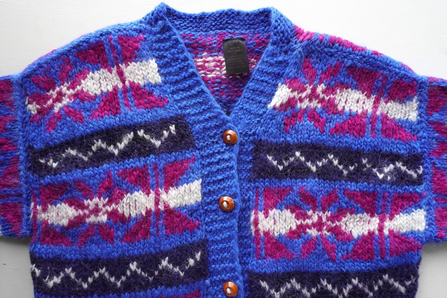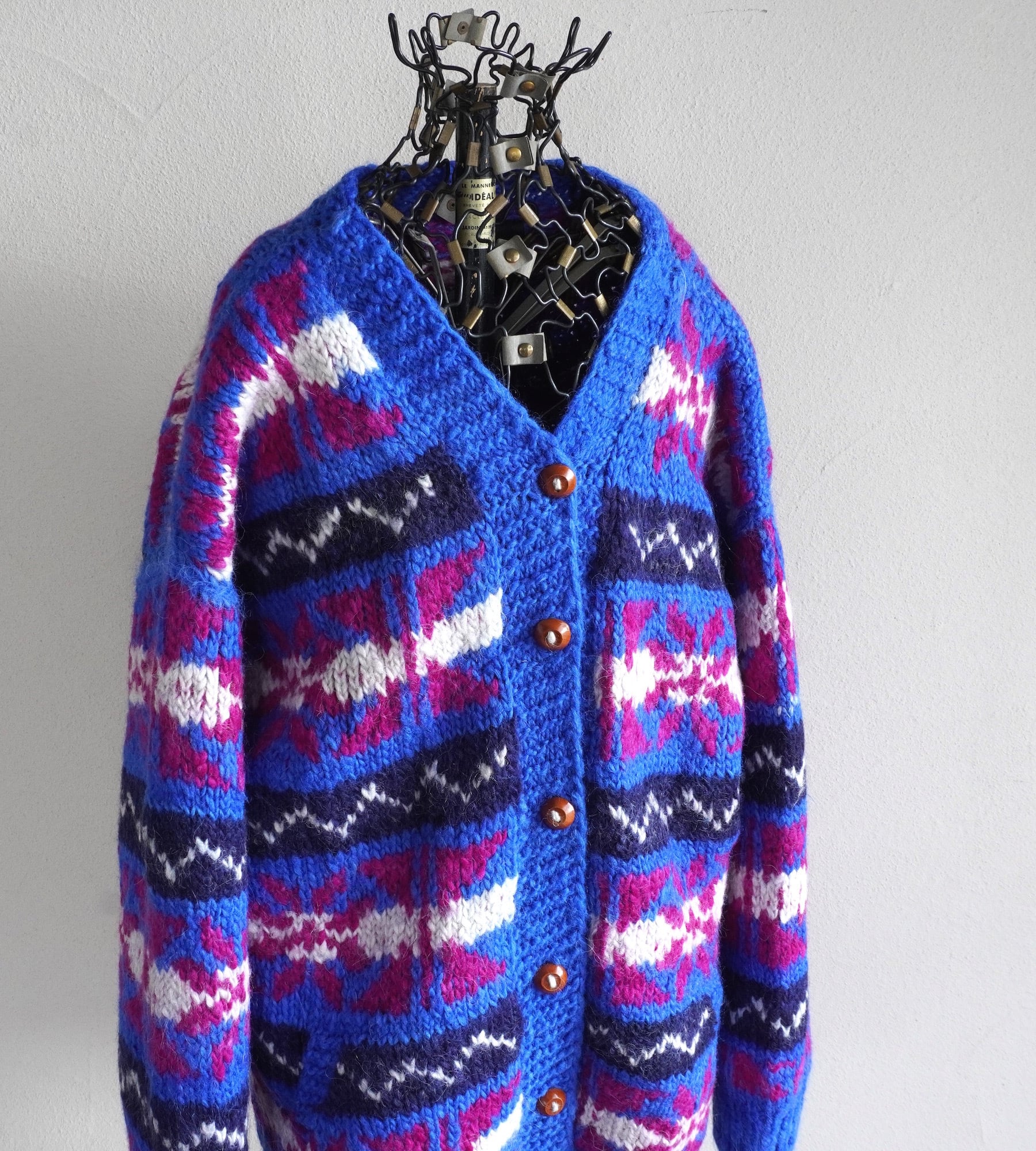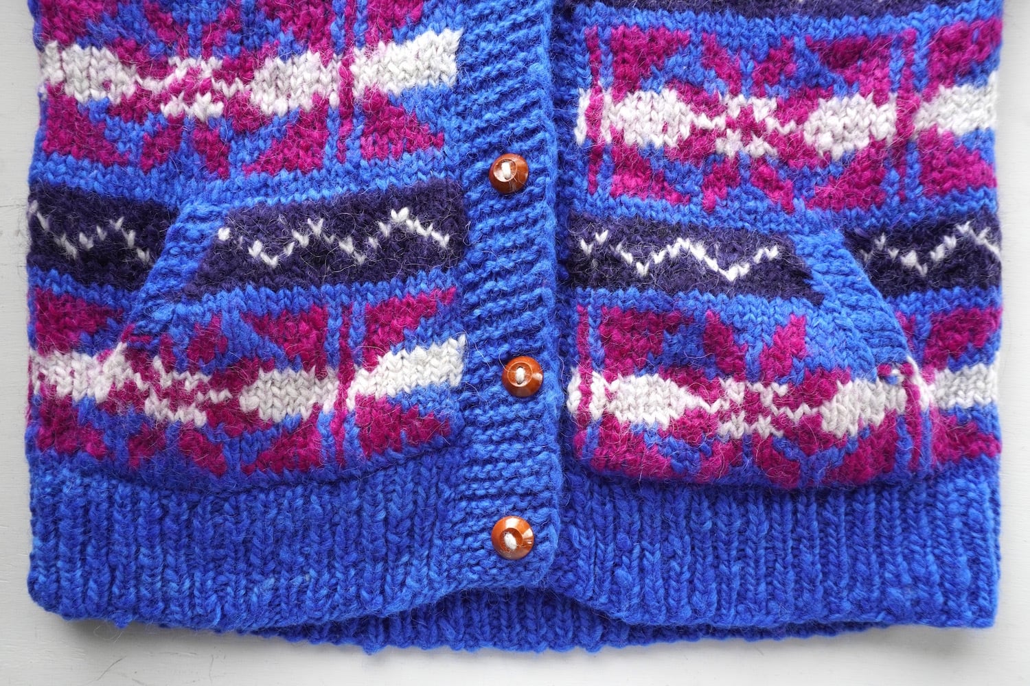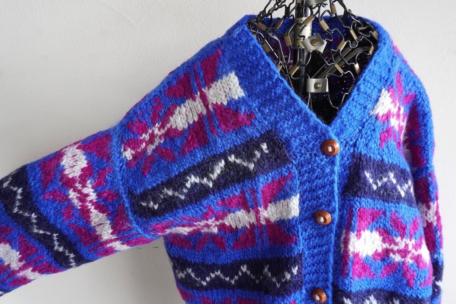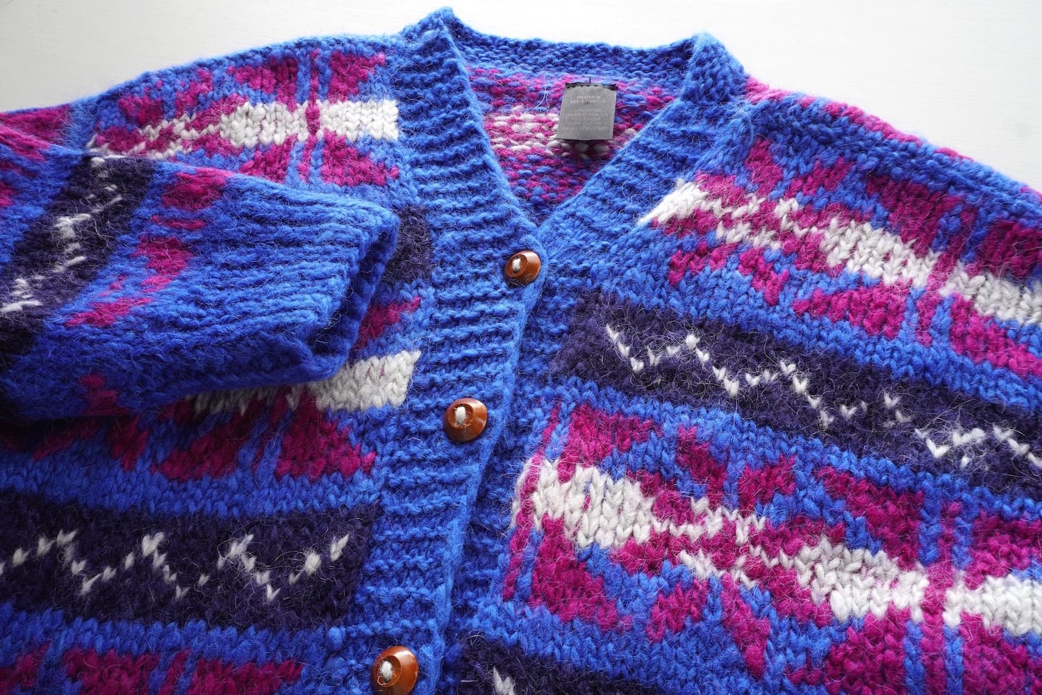 1990's ECUADOR製 [INDIAN WEAVINGS] 幾何学柄 エクアドルニットカーディガン ブルー系 実寸(women's XL〜 ≒ men's L程度) ハンドニット ヴィンテージ | MAGNOLIA WEBSTORE